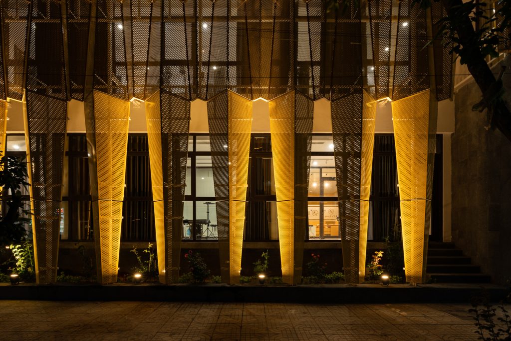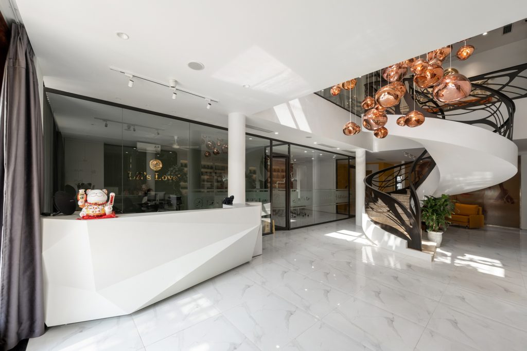 Ngoại thất: Thông qua ý tưởng kiến trúc, chúng tôi nhận ra rằng việc chỉ đơn thuần tạo ra sự thông thoáng bằng cách sử dụng vách kính nghe có vẻ vô ích vì một mặt tiền kính rộng 420 mét vuông sẽ hấp thụ bức xạ mặt trời. Bên cạnh đó, để đáp ứng thách thức của hai yêu cầu chức năng về hình thức và diện mạo, chúng tôi đã thiết kế một hệ thống độc đáo có thể mở rộng đáng kể phạm vi rộng lớn của nhu cầu kiến trúc đồng thời thể hiện cảm giác về chiều sâu trong không gian. Do đó, cấu trúc hai lớp được áp dụng, bao gồm các bức tường kính và các tấm nhôm đục lỗ đồ họa. Vật liệu được thiết kế để tạo ra một giao diện năng động và đồng thời là một màn chắn bền vững cho tấm kính phía sau và giúp tiết kiệm năng lượng. Là triển vọng của khách hàng, mặt tiền là sự tương tác giữa ngoại thất và nội thất, mở rộng tầm nhìn này sang tầm nhìn khác. Hơn nữa, tòa nhà ngoài trời và lớp vỏ bên ngoài kết hợp với giếng trời dọc theo và khối tích bên trong để tạo nên mặt tiền mang tính biểu tượng của Love Spa tại LZ.