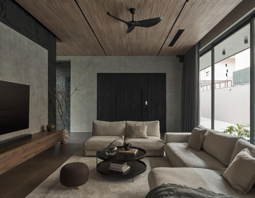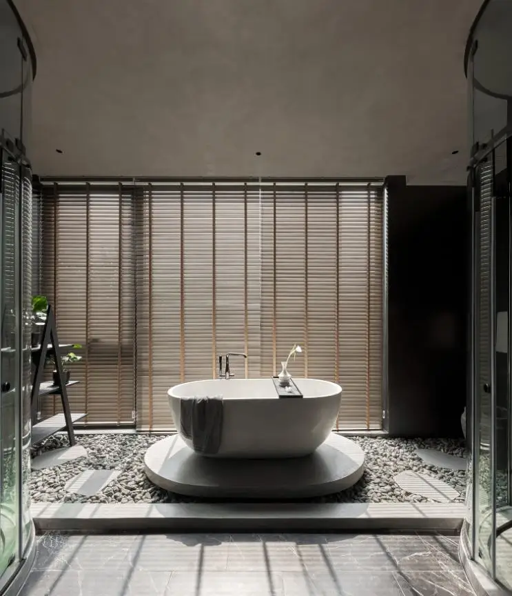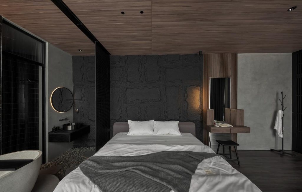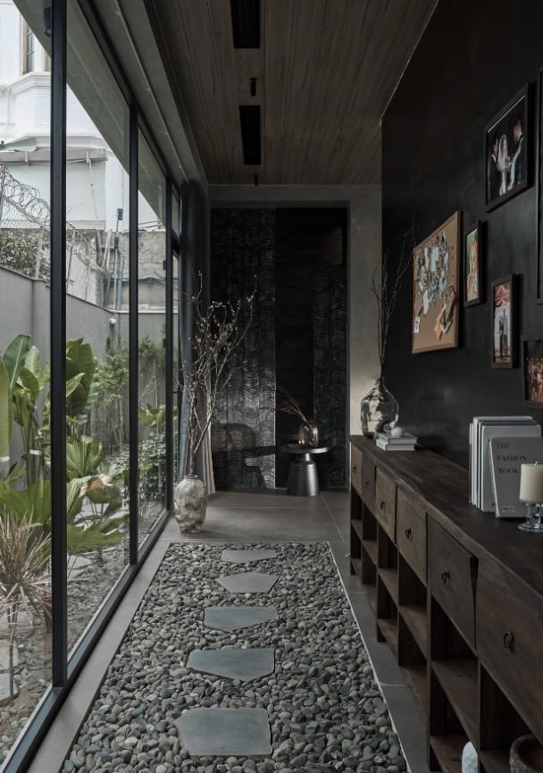 Với mong muốn tái hiện không gian nghỉ dưỡng tại gia, các khu vực tắm nằm, tắm đứng được bài trí với tông đen, xám cá tính, rộng rãi và thư thái. Vật liệu tự nhiên như sỏi, đá cuội cắt lát, gỗ thịt pha lẫn gỗ công nghiệp làm công trình thêm hài hòa, có sức sống và giảm bớt cảm giác “công nghiệp” của vật liệu hiện đại. Villa với hình khối giản đơn, hiện đại và bền vững kết hợp với những vật liệu đầy tinh tế giúp gia đình gia chủ sống trong một không gian đáng sống, nhiều ánh sáng và chú trọng nhiều đến công năng phục vụ các thành viên trong gia đình.