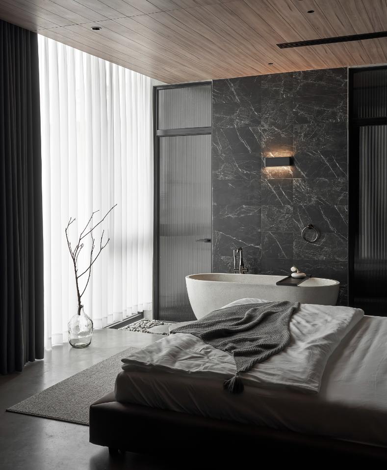 Bồn tắm granito được thiết kế hài hòa, xen kẽ tinh tế trong không gian phòng ngủ, tạo nên sự hòa quyện giữa sang trọng và thư giãn