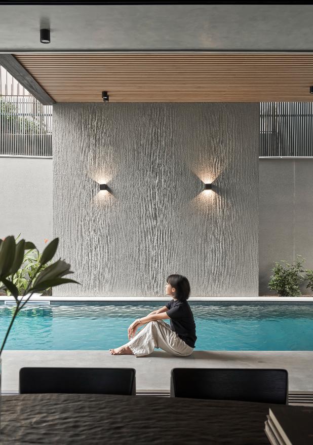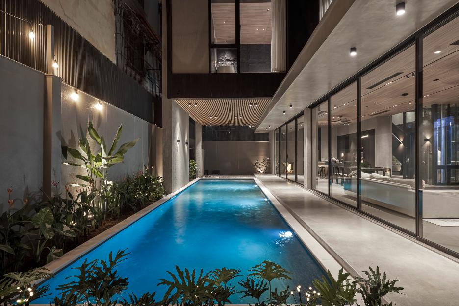 Yếu tố nghỉ dưỡng được đẩy mạnh qua thiết kế bể bơi chạy dọc hông nhà, mang lại không gian thư giãn, đồng thời giúp luân chuyển không khí, tạo sự thông thoáng. Nhờ đó, phòng khách, phòng bếp và khu vực sinh hoạt chung đều nhận được ánh sáng, gió tự nhiên, đảm bảo sự mát mẻ so với điều kiện thời tiết nhiệt đới.