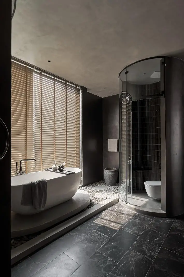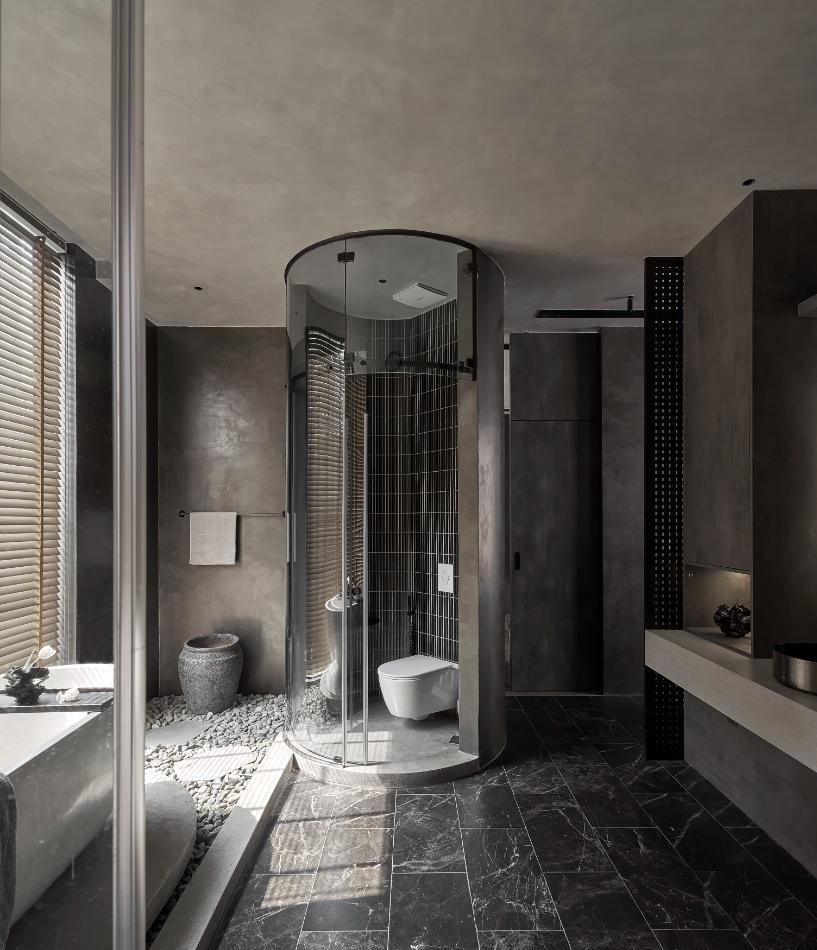 Các khu vực tắm nằm, tắm đứng sử dụng các chất liệu hiện đại kết hợp tông đen, xám mang đến nét cá tính cho không gian