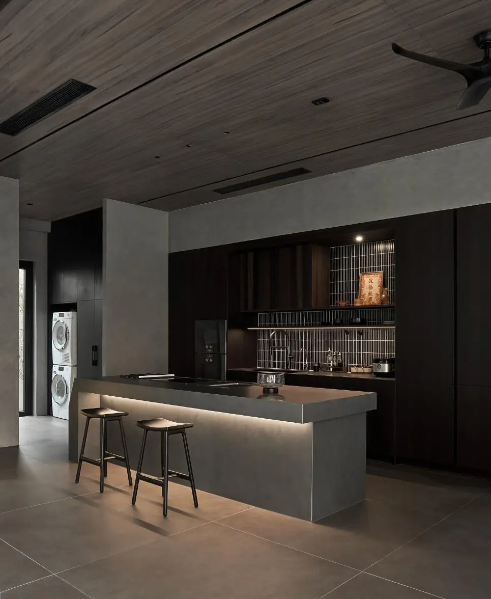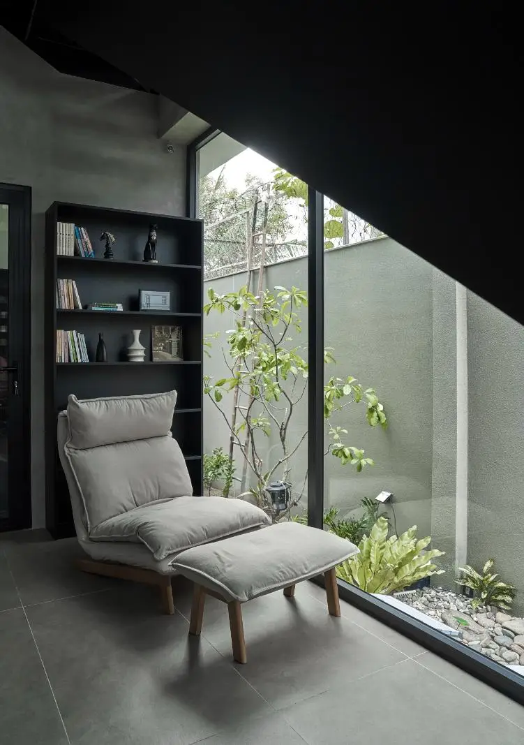Để duy trì tinh thần tối giản nhưng không đơn điệu, nhóm thiết kế đã khéo léo bố trí gạch trang trí, tường thông gió, các lối đi dọc hành lang và không gian liên thông một cách hài hòa. Từng chi tiết nhỏ được chăm chút kỹ lưỡng, chẳng hạn việc sử dụng nẹp genta giúp đường trát cạnh tường phẳng phiu, bền chắc, không lo mẻ góc sau thời gian dài sử dụng.