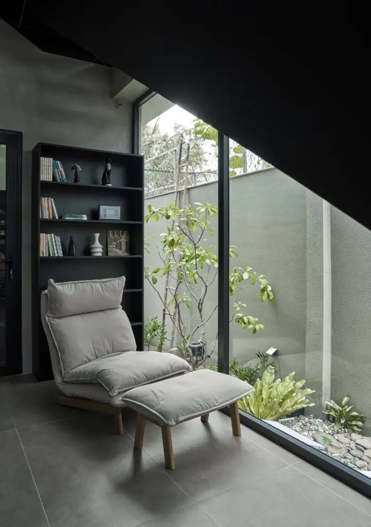 Ngôi nhà gồm phòng ngủ, phòng khách và bếp nằm dưới tầng một, tiếp giáp bể bơi bên hông, với tông trầm – lạnh làm chủ đạo đã thể hiện được cá tính của gia chủ. Ngôi nhà nằm sâu trong khu đất được bao bọc bởi một lớp hành lang lấy sáng và gió giúp ngôi nhà đối lưu nắng gió hiệu quả, thoáng mát.
