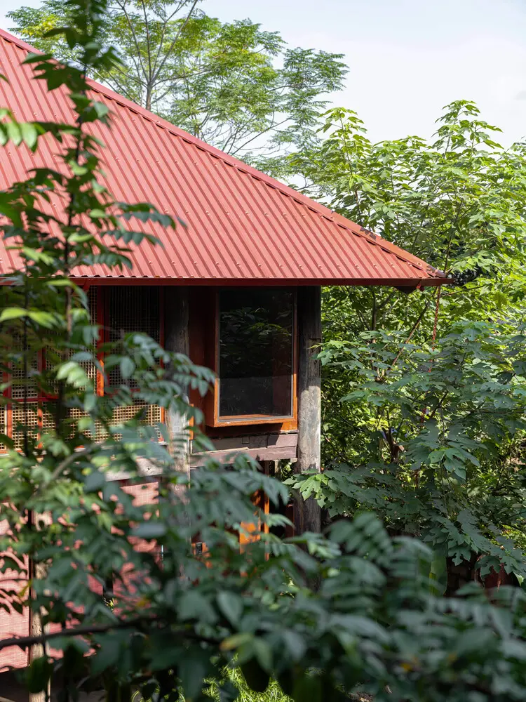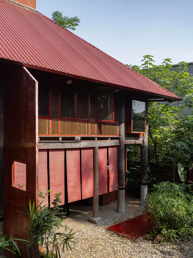 Trong kiến trúc đương đại, yếu tố Kim loại bao gồm kết cấu thép, mái tôn lượn sóng và các vật liệu kim loại khác. Đây là thành phần không thể thiếu trong kiến trúc hiện đại, giúp tăng tính bền vững và tuổi thọ cho các công trình và nội thất. Tác giả đã khéo léo sử dụng sơn màu tự nhiên cho mái tôn lượn sóng khổ lớn và tôn lượn sóng cán nguội hai lớp để đảm bảo yêu cầu thẩm mỹ, tiết kiệm năng lượng và tối ưu hóa chi phí. Khả năng cách âm của mái tôn lượn sóng giúp không gian trong nhà hòa quyện hơn với thiên nhiên, đặc biệt là ở những không gian yên tĩnh như Doai, nơi người sử dụng cảm thấy thoải mái hơn với âm thanh của mưa, gió và côn trùng. Kim loại mang năng lượng Trung tính, là một năng lượng chuyển tiếp, kết hợp hài hòa với các vật liệu khác để giúp cân bằng Âm Dương.