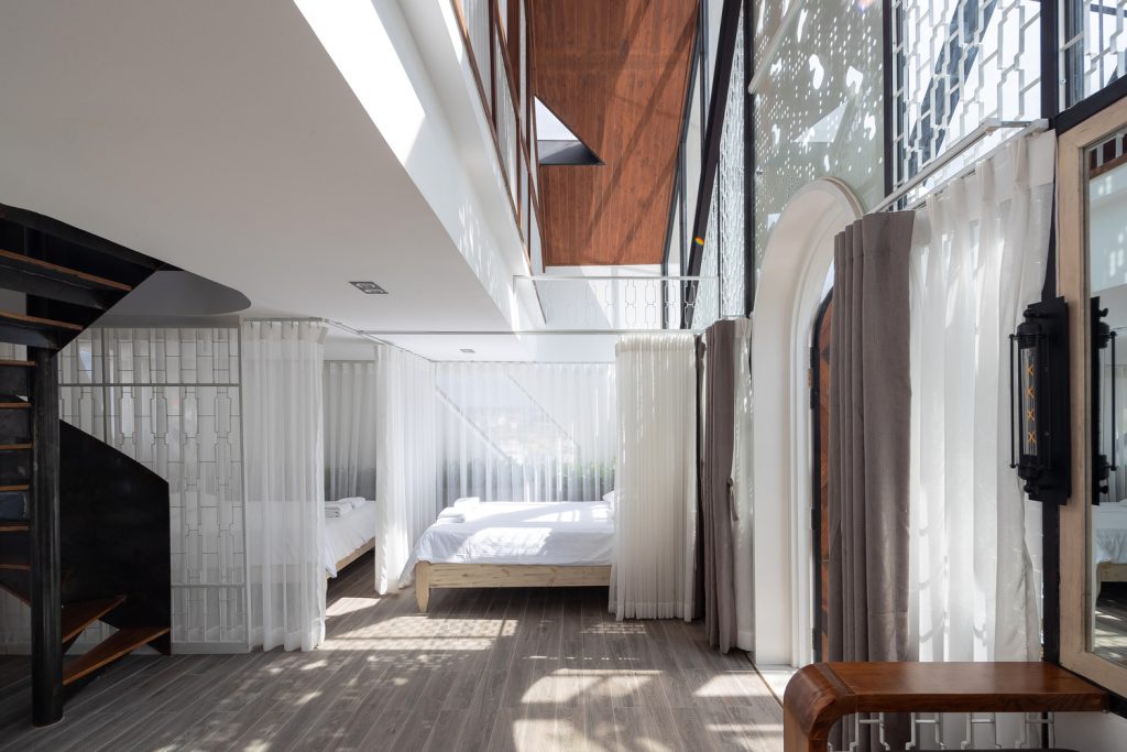 Không gian nội thất được chia thành 3 tầng và 1 tầng áp mái, kết nối các tầng với nhau bằng cầu thang dẫn từ sảnh chính lên khu vực sinh hoạt chung. Tầng này còn có một nhà bếp nhỏ xinh xắn kết hợp với khu vực ăn uống vô cùng thoải mái và khu vực làm việc. Tổng cộng có 9 phòng, bao gồm cả khu vực sinh hoạt chung và khu vực vệ sinh riêng, được thiết kế để đáp ứng mọi nhu cầu của khách, trong đó phòng thông tầng là điểm nhấn chính của khu vực gác mái.
