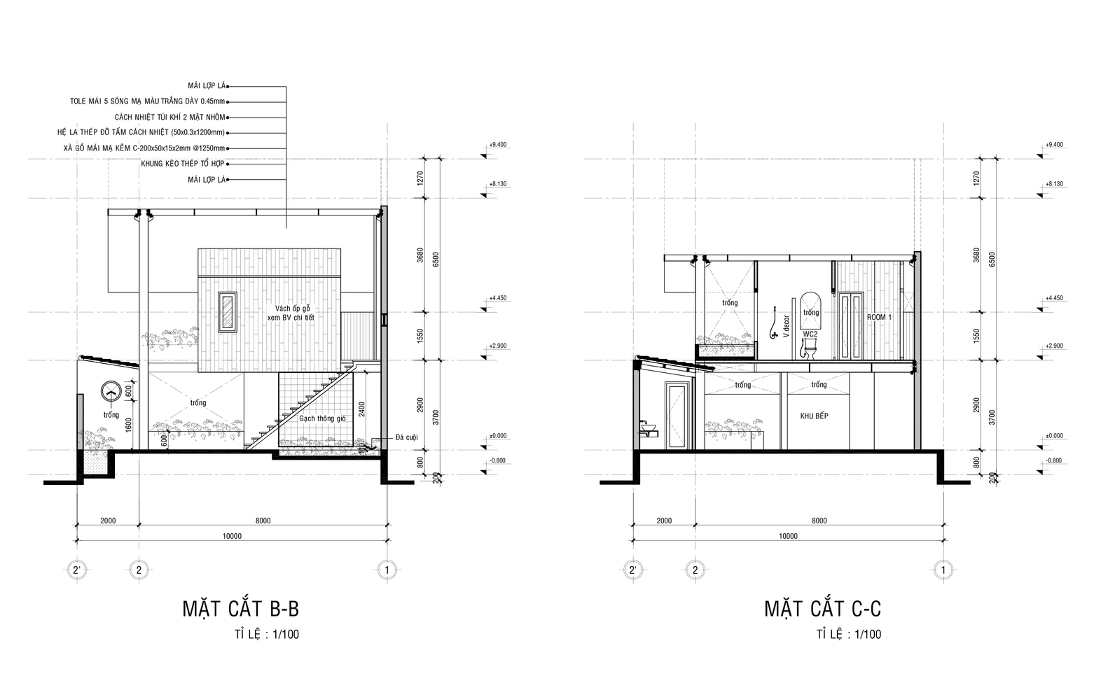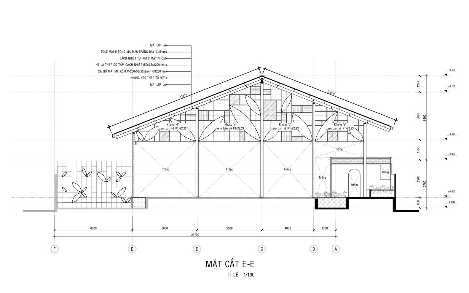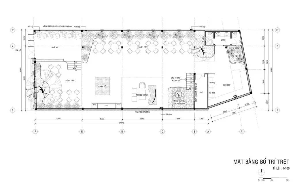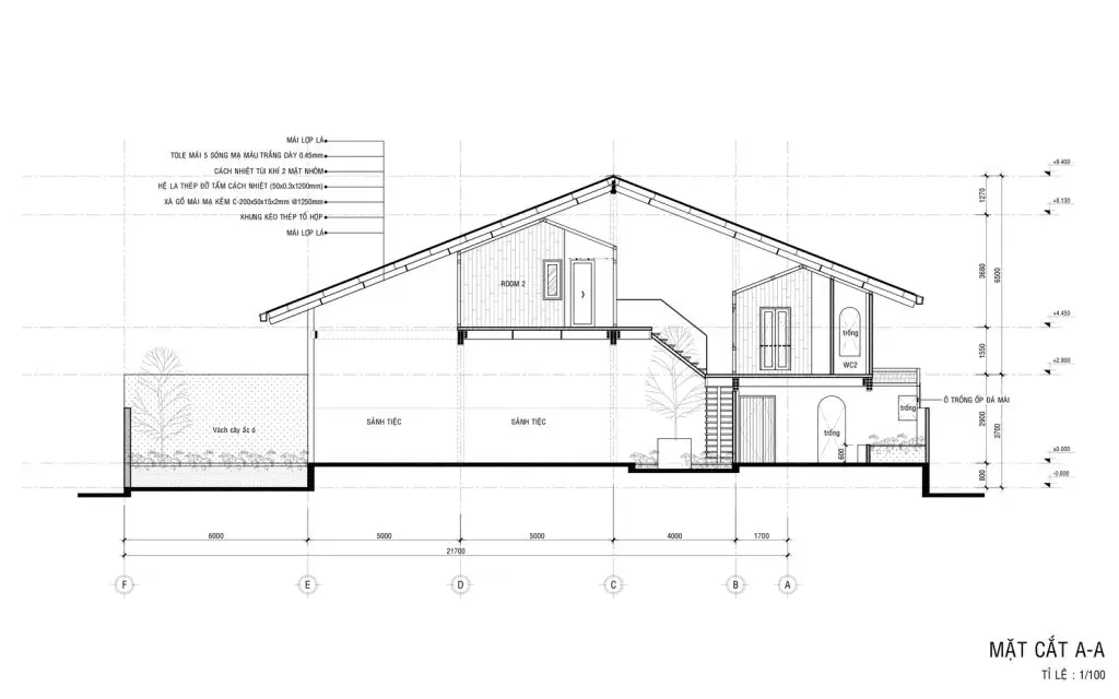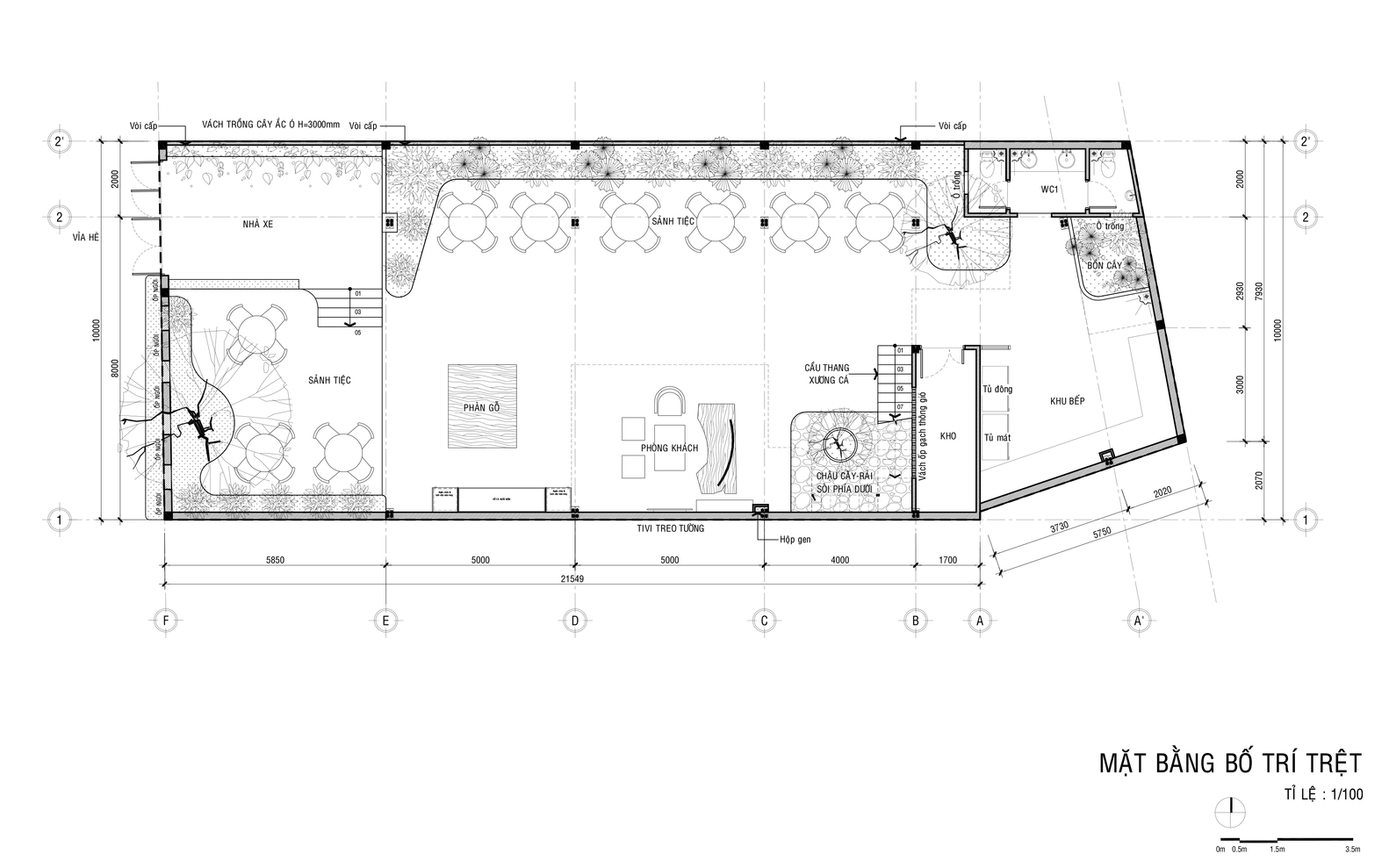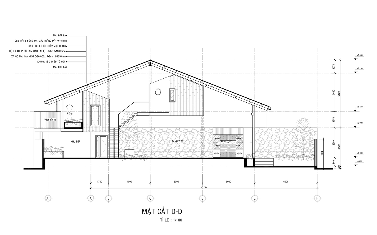 Mục đích chính của nơi này là để duy trì các truyền thống gia đình và các sự kiện như thờ cúng tổ tiên và các hoạt động gắn kết gia đình – bạn bè. Trong suốt quá trình phát triển ý tưởng, khái niệm “nhà tiệc” đã được hình thành. Nhà tiệc được bố trí theo kiểu nhà dài, một loại nhà một phòng dài, hẹp theo tỷ lệ, thường được xây dựng bởi các hộ dân tộc thiểu số ở Tây Nguyên Việt Nam. Các phòng được xây bằng gỗ tái chế; vách ngăn có họa tiết từ tường nhà của các dân tộc thiểu số. Hai phòng giống như hai tổ chim mở ra những khoảng trống đón nắng gió và những mảng xanh bồng bềnh. Mặt đất là không gian mở, không cửa, không tường, được bao quanh bởi cây xanh. Toàn bộ không gian mặt đất tiếp xúc trực tiếp với nắng và mưa mỗi ngày.