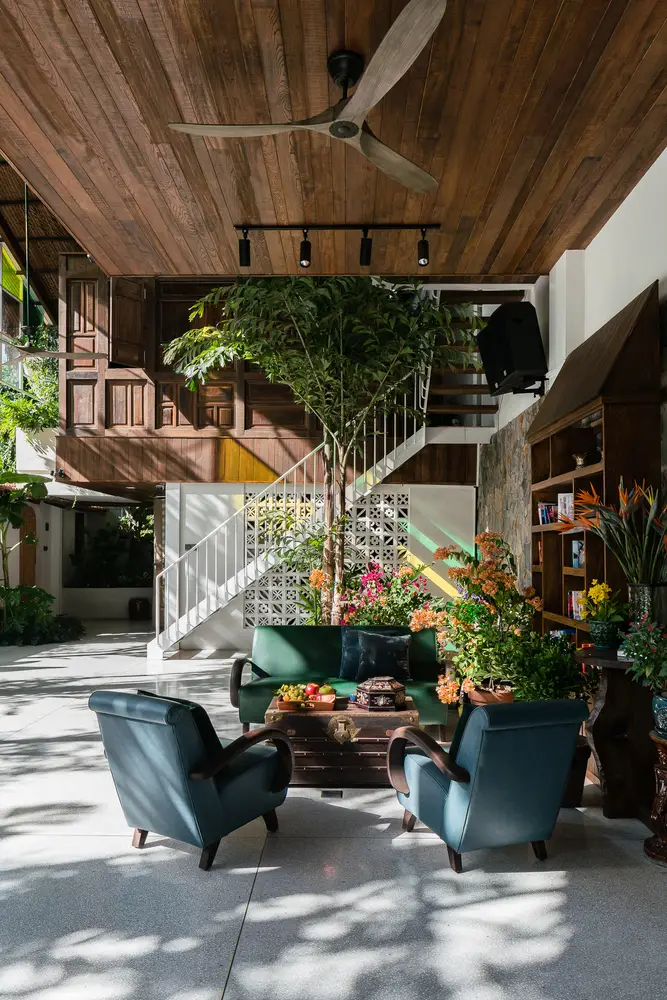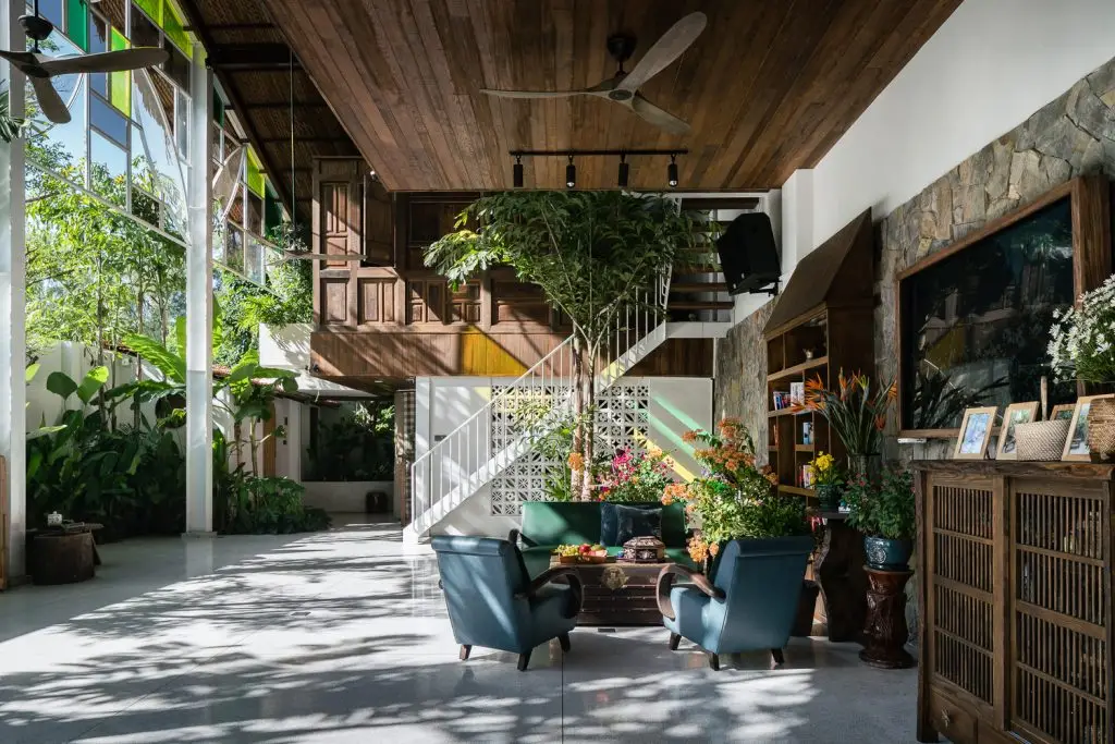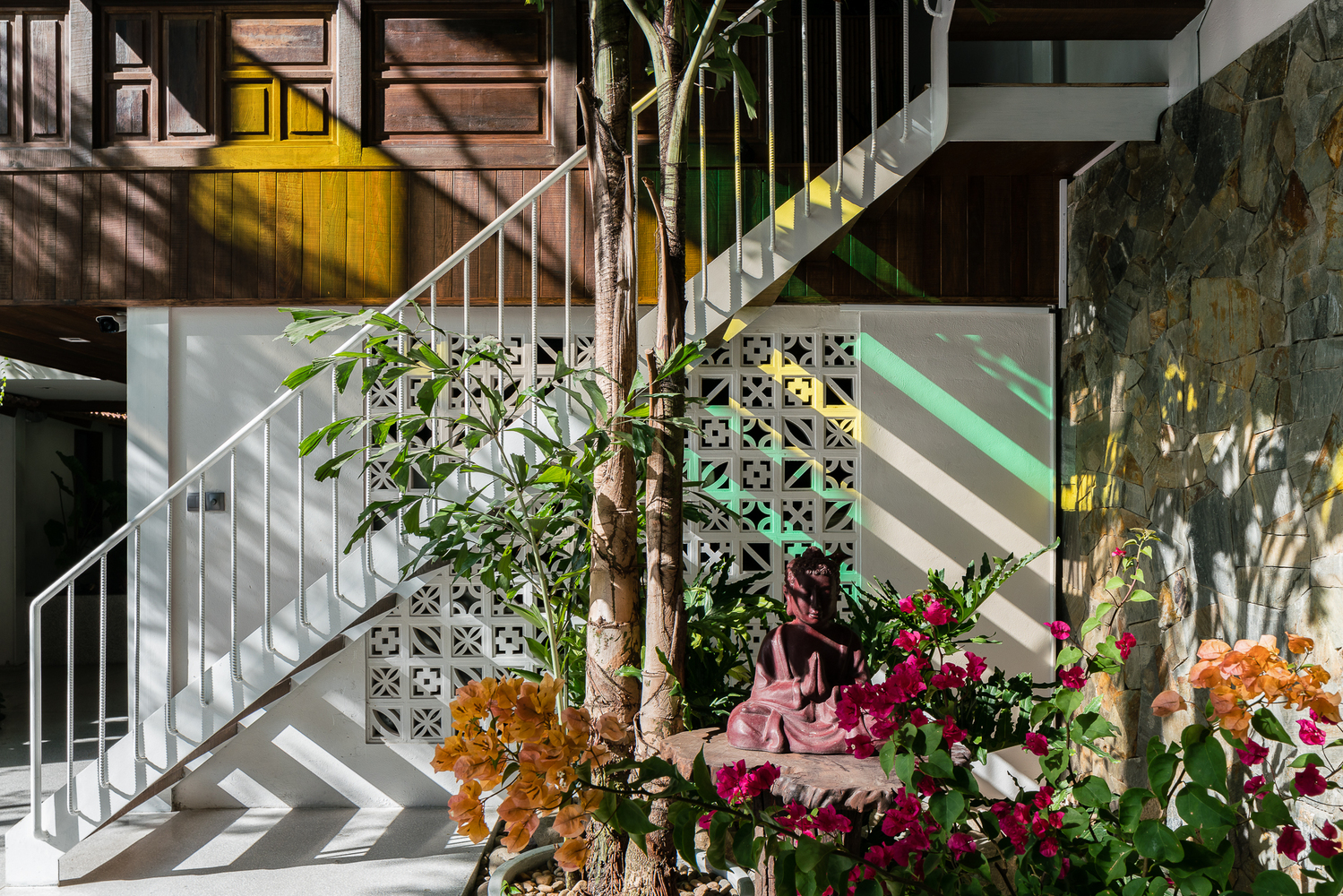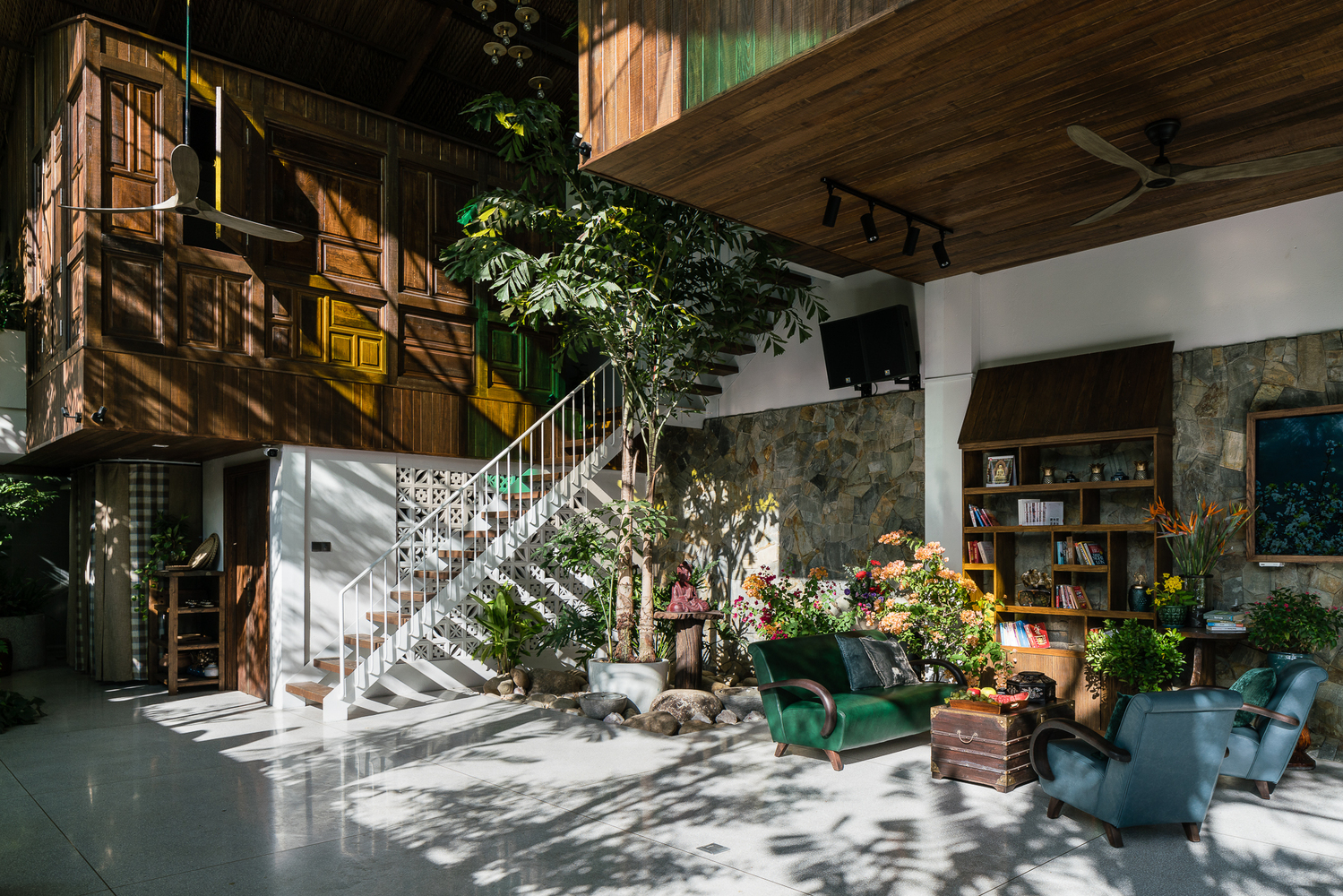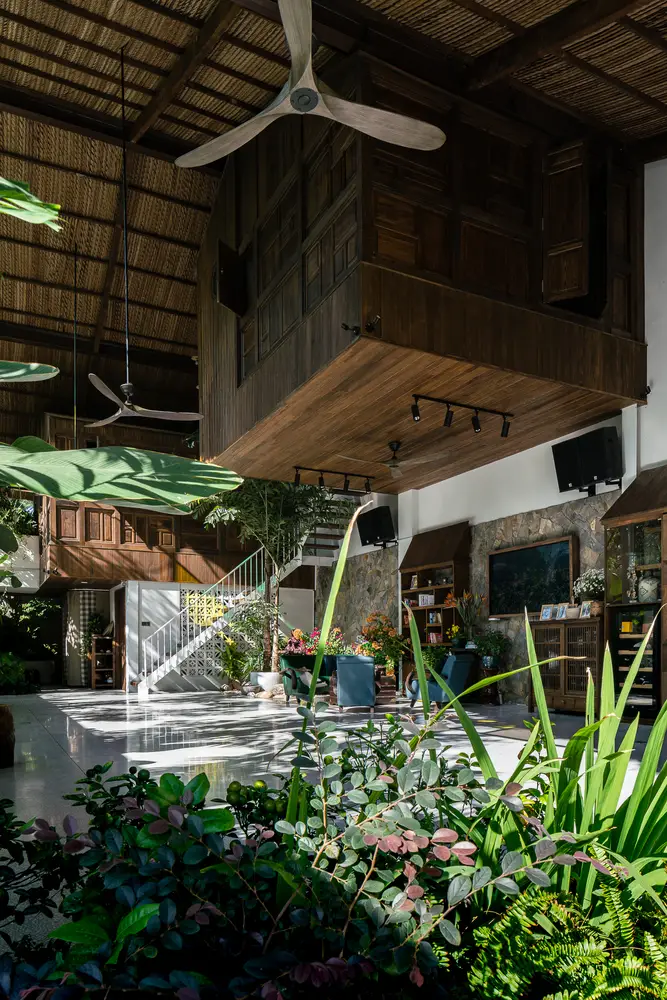 Hai phòng ngủ kiểu nhà gỗ dành cho khách được bố trí lơ lửng trên không gian mở như hai tổ chim. Những tổ chim này nằm ở đó trong một khung cảnh thoải mái như ở khu nghỉ dưỡng. Ngôi nhà thật dễ chịu với những làn gió thiên nhiên và ánh nắng mặt trời tràn ngập. Nhìn ra phòng khách là một khu vườn rộng lớn, một góc thờ cúng, nơi ánh nắng xuyên qua những tấm kính màu sắc, tạo nên cảm giác thanh bình.