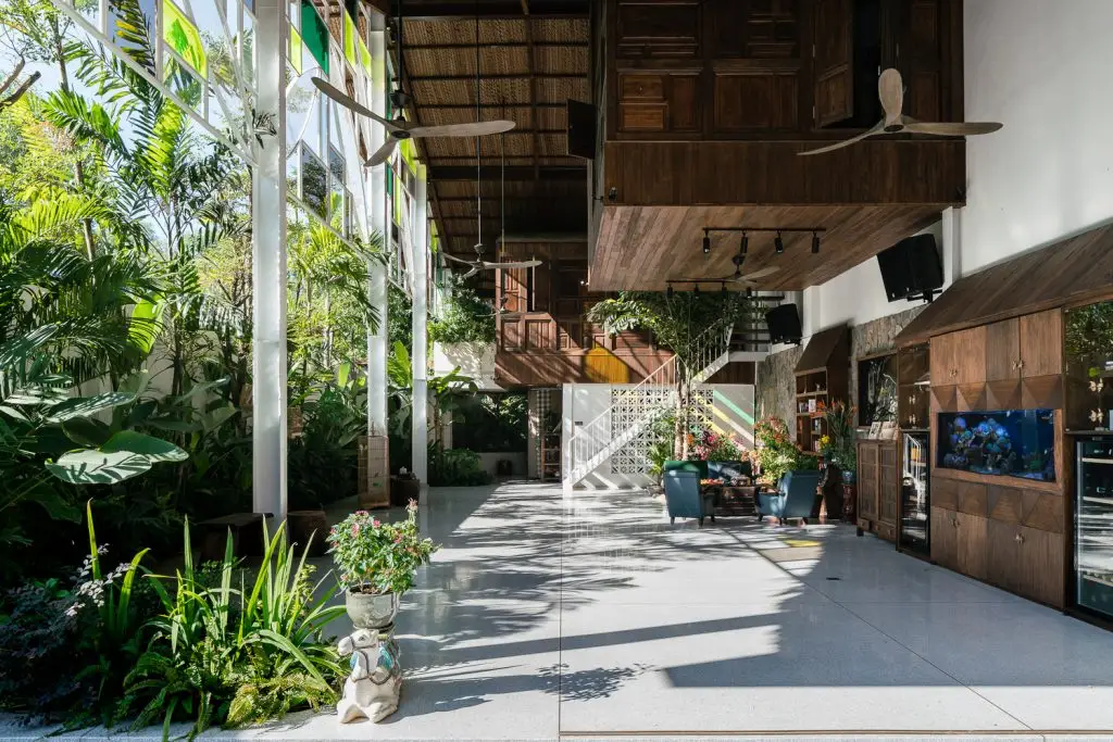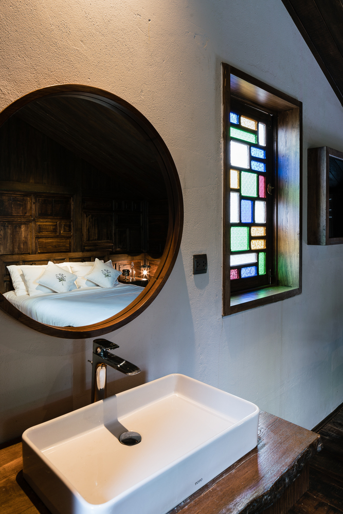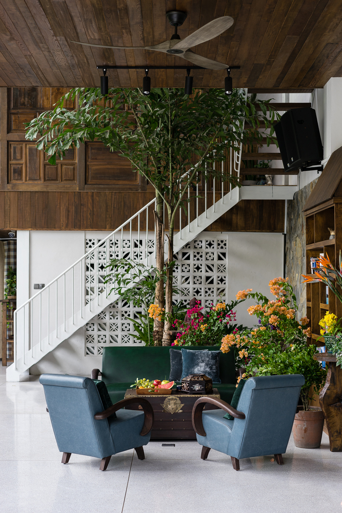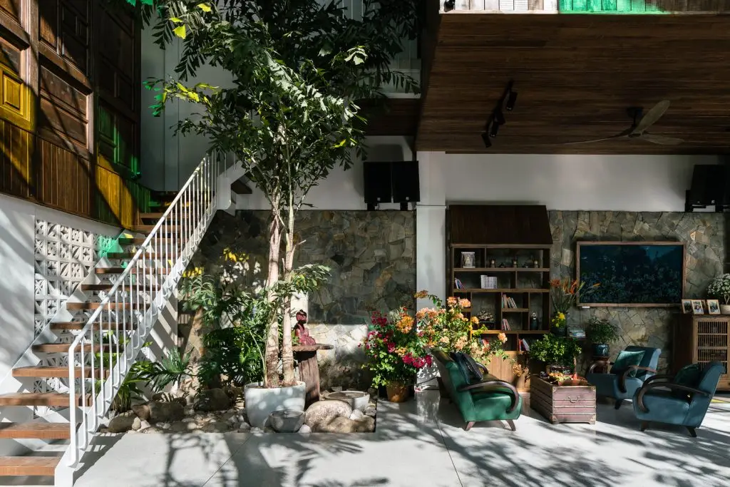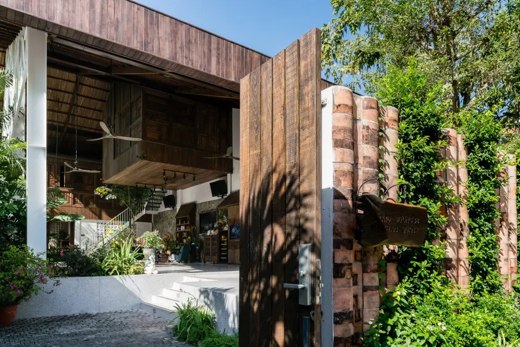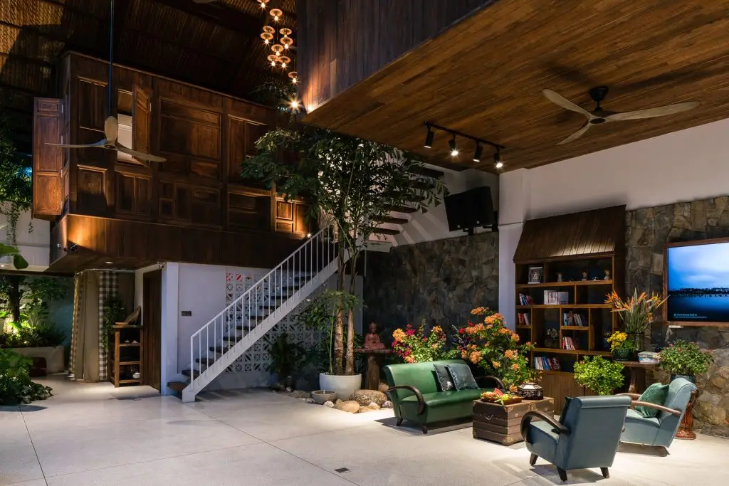 Hai phòng ngủ kiểu nhà gỗ dành cho khách được bố trí lơ lửng trên không gian mở như hai tổ chim. Những tổ chim này nằm ở đó trong một khung cảnh thoải mái như ở khu nghỉ dưỡng. Ngôi nhà thật dễ chịu với những làn gió thiên nhiên và ánh nắng mặt trời tràn ngập. Nhìn ra phòng khách là một khu vườn rộng lớn, một góc thờ cúng, nơi ánh nắng xuyên qua những tấm kính màu sắc, tạo nên cảm giác thanh bình.