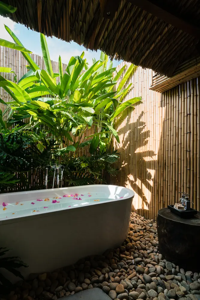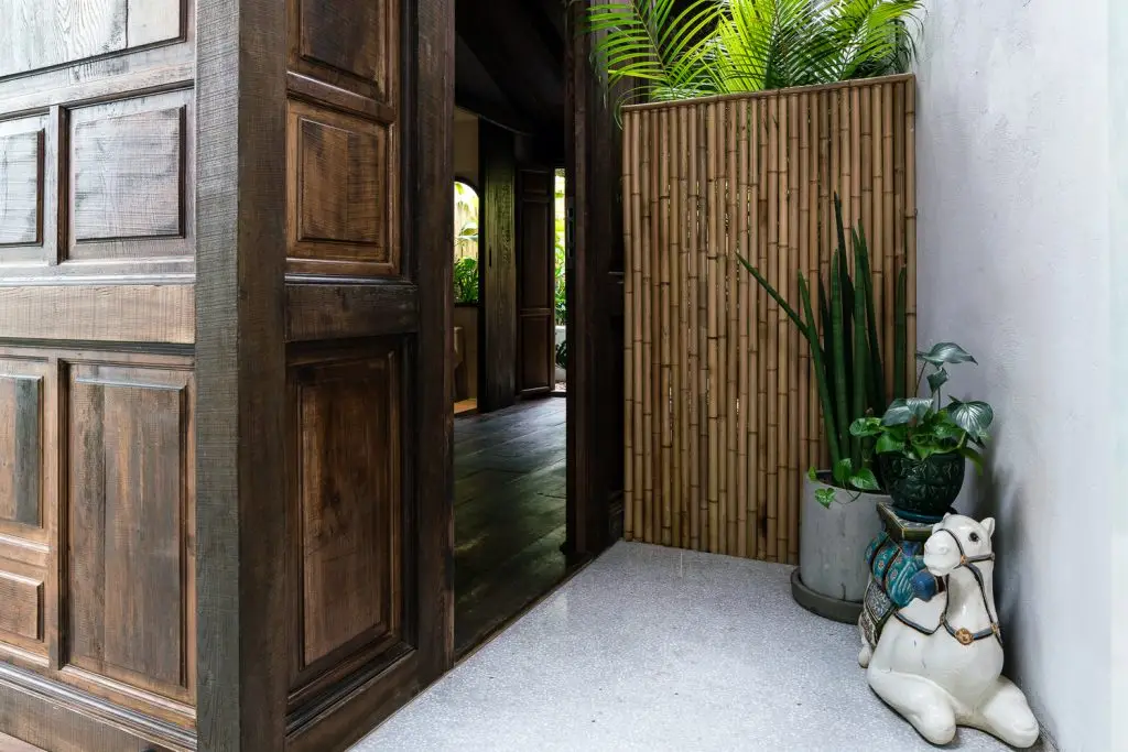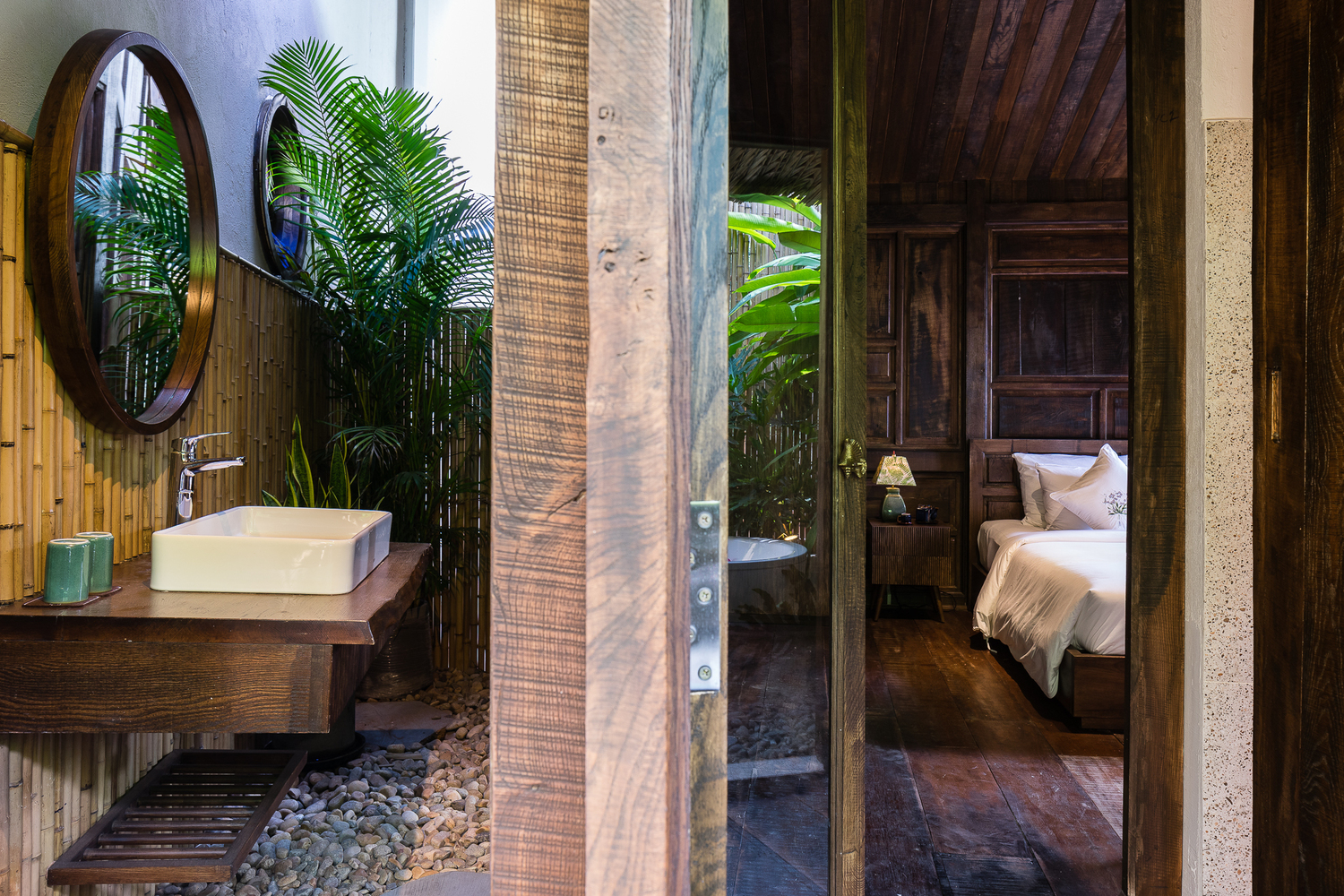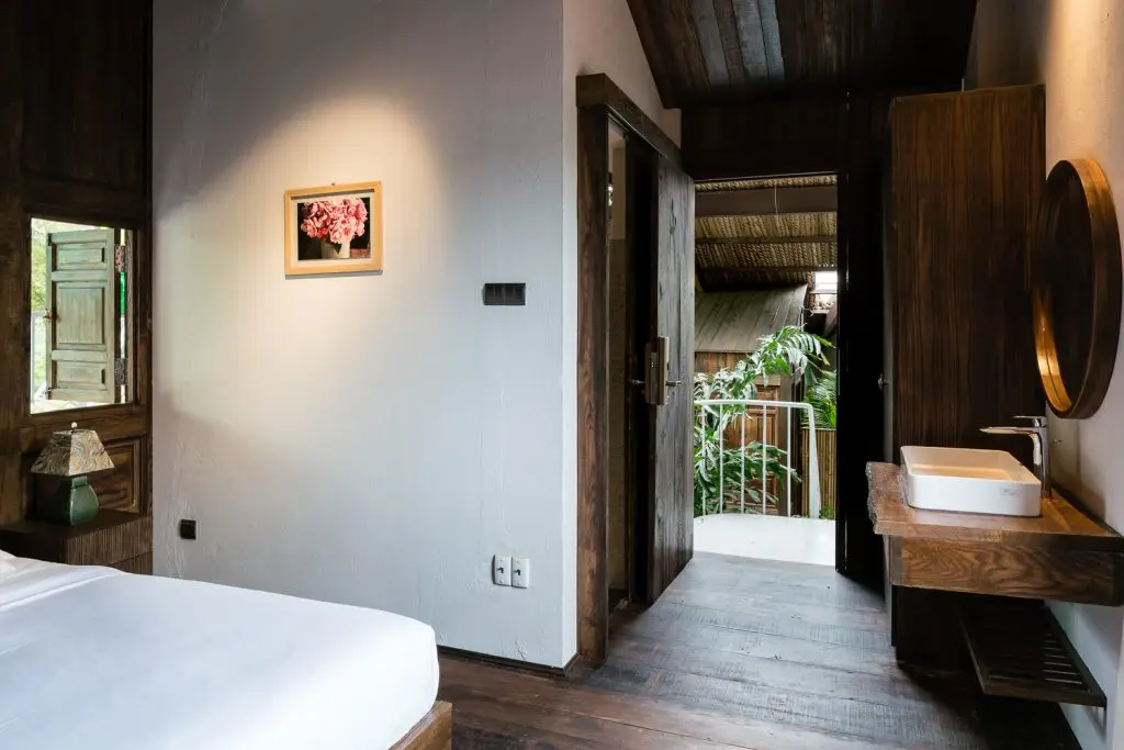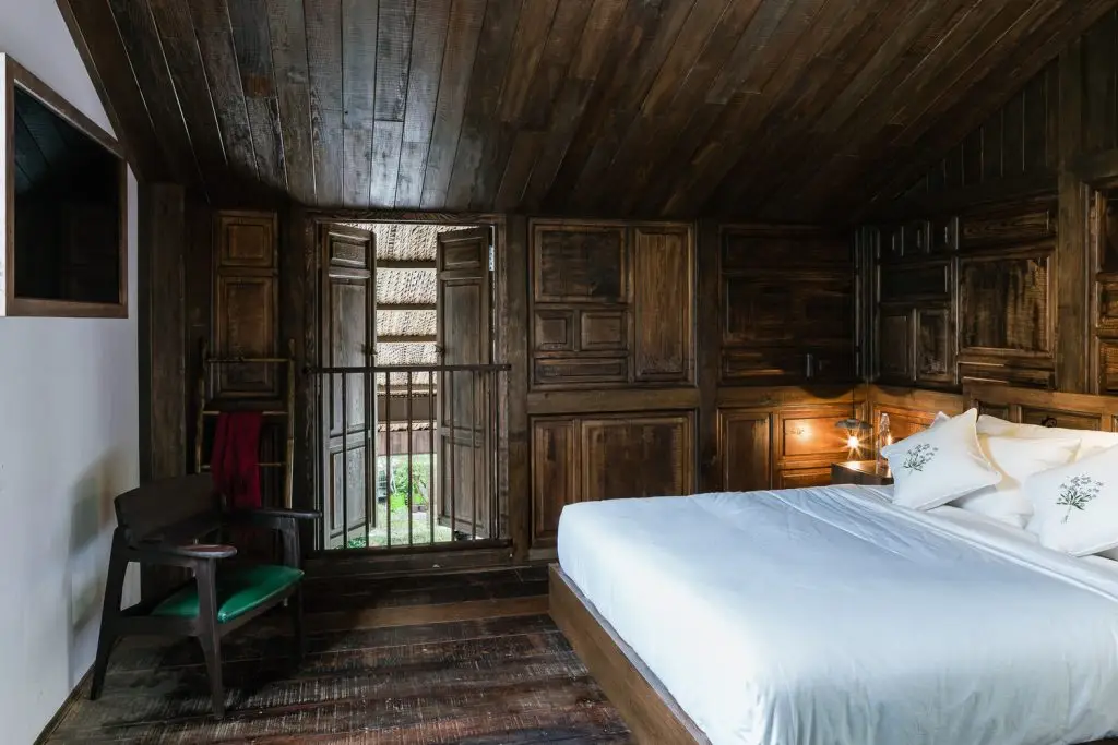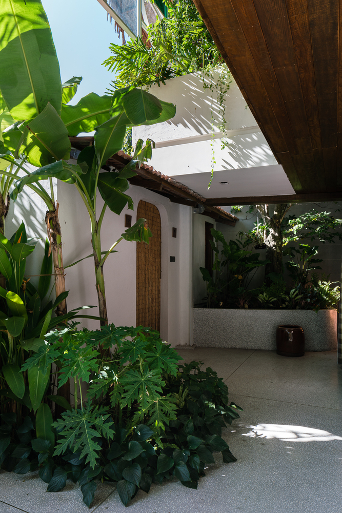 Hai phòng ngủ kiểu nhà gỗ dành cho khách được bố trí lơ lửng trên không gian mở như hai tổ chim. Những tổ chim này nằm ở đó trong một khung cảnh thoải mái như ở khu nghỉ dưỡng. Ngôi nhà thật dễ chịu với những làn gió thiên nhiên và ánh nắng mặt trời tràn ngập. Nhìn ra phòng khách là một khu vườn rộng lớn, một góc thờ cúng, nơi ánh nắng xuyên qua những tấm kính màu sắc, tạo nên cảm giác thanh bình.