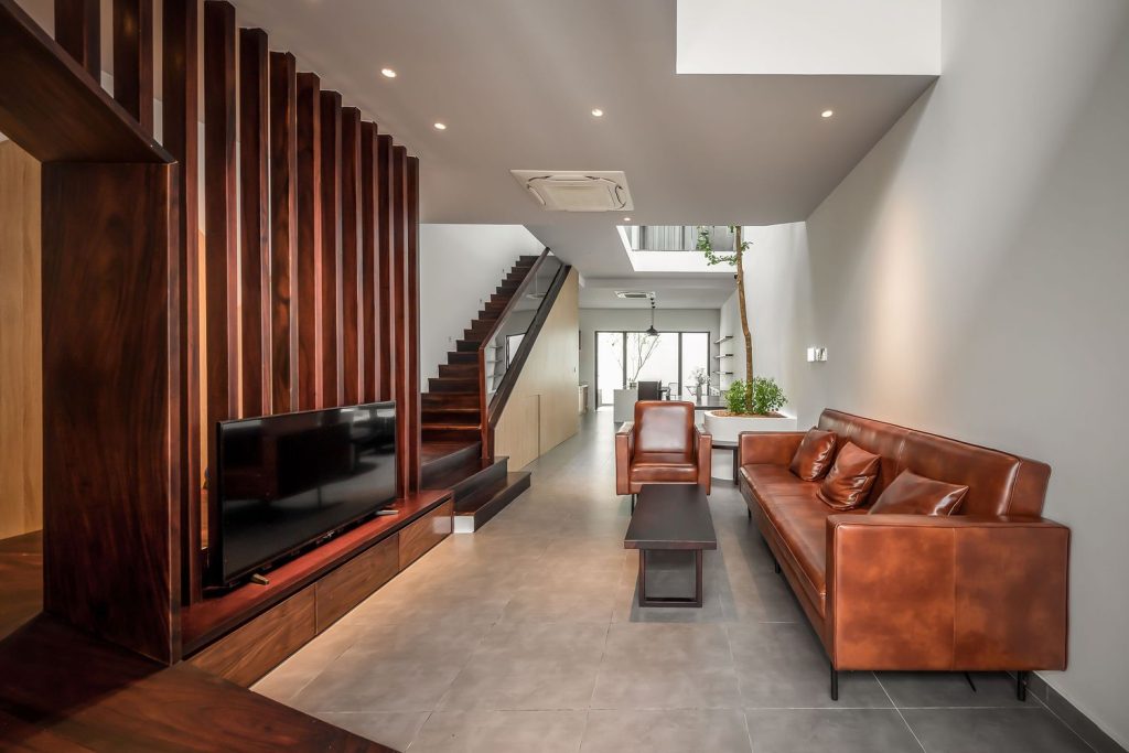 Giữa hành lang của hai phòng ngủ là khoảng không gian sàn được thiết kế để tạo sự riêng tư nhưng vẫn có sự kết nối, đồng thời giúp đón ánh sáng và gió cho các phòng ngủ một cách gián tiếp. Khu vực chiếu nghỉ cầu thang được sử dụng làm không gian chơi riêng tư cho trẻ em. Phía sau nhà là một khoảng sân rộng giúp tăng cường thông gió cho khu vực bếp và là nơi lý tưởng để đọc báo và nhâm nhi một tách cà phê.