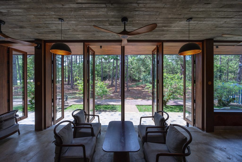 Dưới mái che thống nhất này, các bức tường được bố trí với cảm giác tự do và uyển chuyển, tách rời khỏi mái nhà để cho phép ánh sáng ban ngày và gió tự nhiên len lỏi qua những khoảng trống được thiết kế có chủ đích. Tất cả các khu vực chức năng được phân tán nhưng vẫn liên kết với nhau bởi mái nhà bao trùm, tạo nên một trải nghiệm không gian liền mạch. Lối vào chính xuyên qua một sân trong hình tròn ngoài trời, tạo ra một ranh giới nhẹ nhàng giữa không gian bên ngoài và bên trong. Từ điểm này, các không gian dần dần trải dài về phía rừng thông, những thay đổi tinh tế về độ cao khuyến khích sự thân mật và tương tác. Sự di chuyển qua các tầng này hé lộ một chuỗi sự kiện được dàn dựng cẩn thận giữa sự mở và khép kín, ánh sáng và bóng tối – đóng khung thiên nhiên trong những cái nhìn thoáng qua được chọn lọc thay vì phơi bày tất cả cùng một lúc.