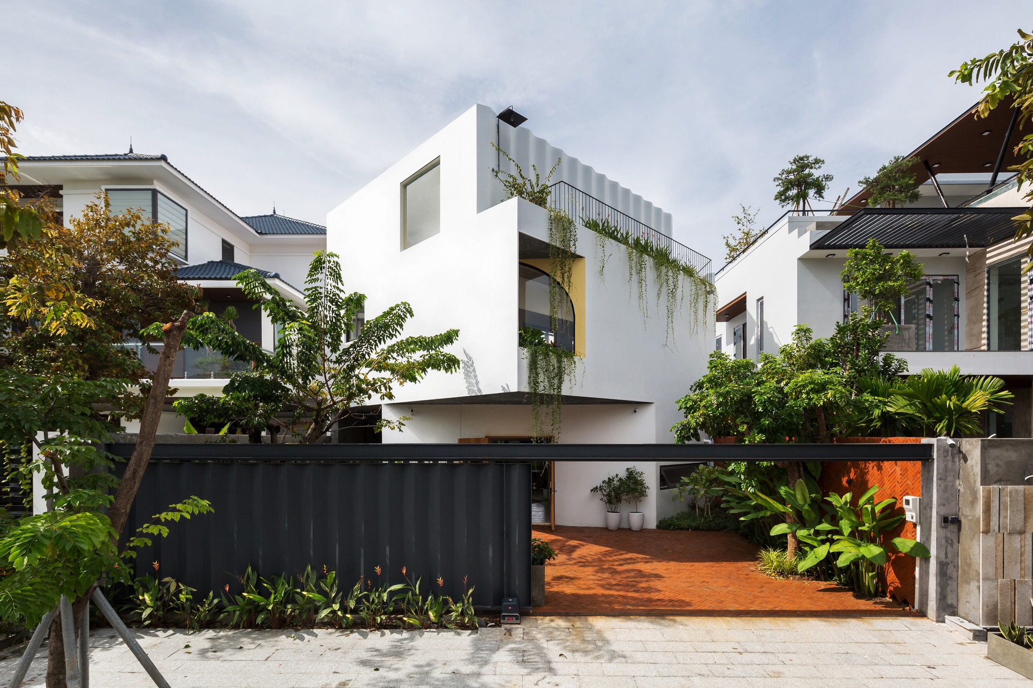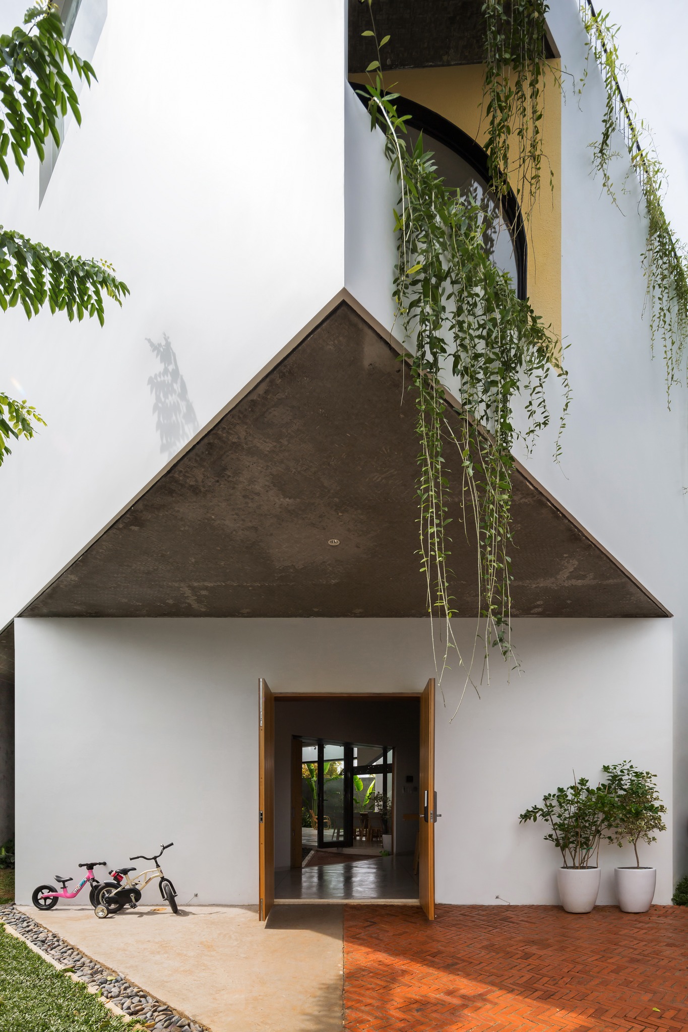 Phương án xoay công trình còn xử lý yêu cầu phong thủy, đưa góc nhọn của căn nhà về ngã ba, nơi con đường nội khu đâm thẳng vào mặt đứng phía sau; đồng thời hình thành đường thông gió chủ động trong tổng thể.