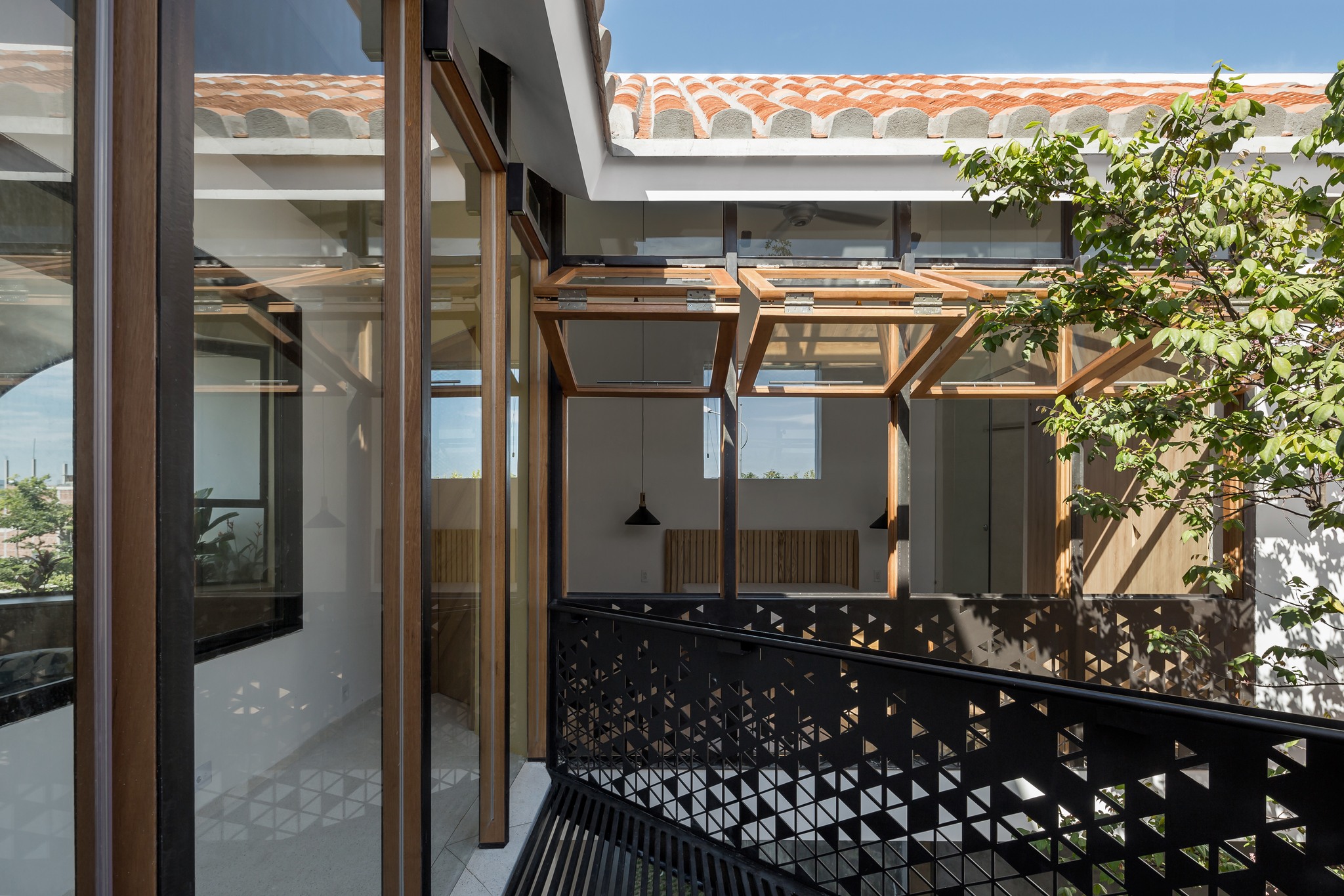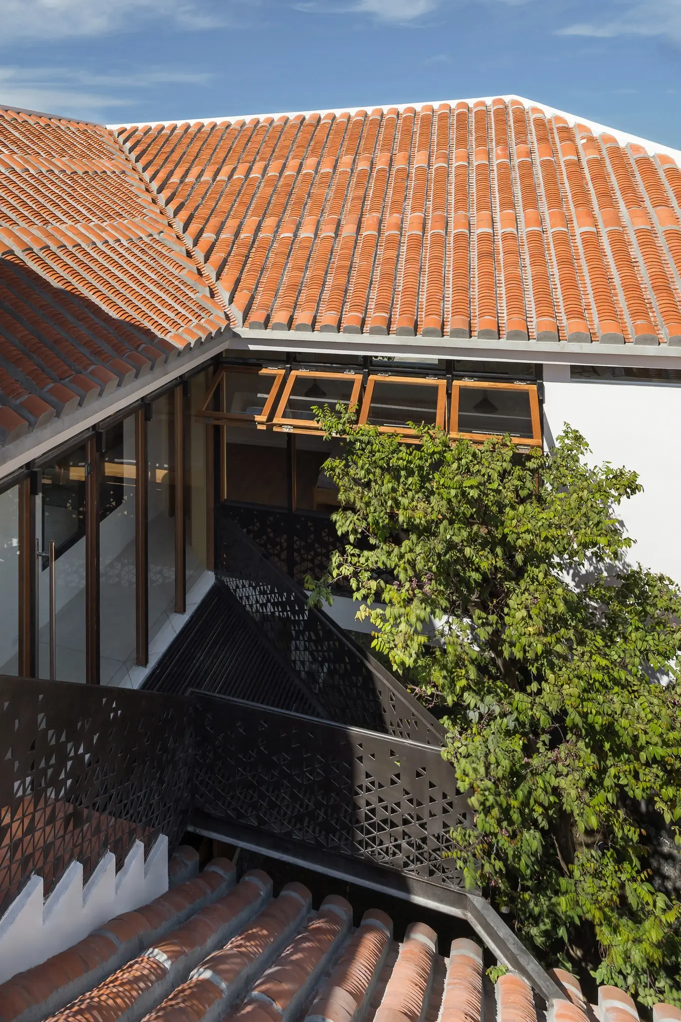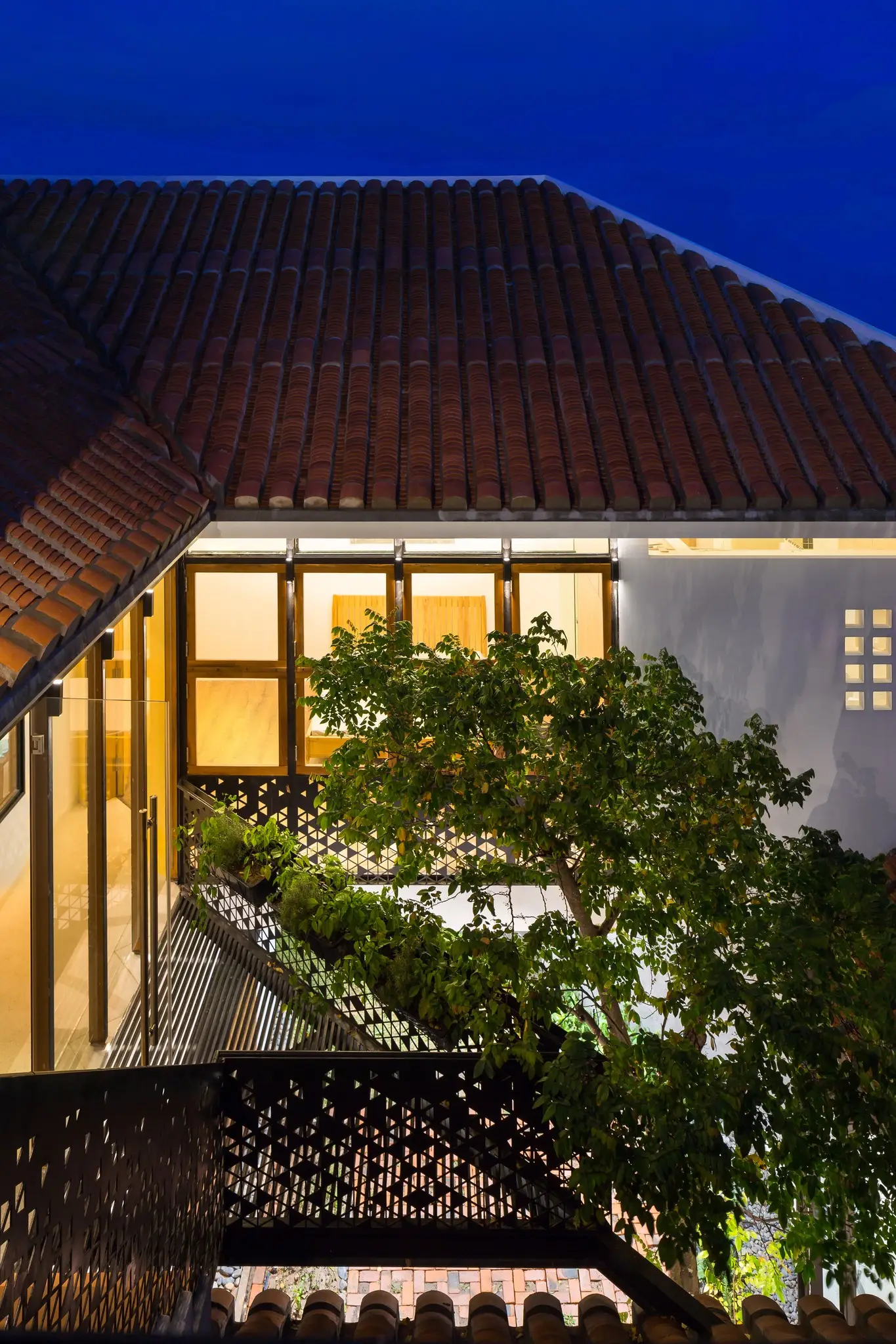 Tầng lầu Xoay 180o so với tầng trệt, tạo thành bố cục khép kín quanh khoảng sân trong, nơi tổ chức cảnh quan và tập trung tất cả view nhìn. Kết hợp nếp nhà ngói địa phương thân thuộc, vừa đáp ứng môi trường khí hậu khu vực, vừa nhấn mạnh sự bất ngờ khi chuyển tiếp từ vẻ đương đại bên ngoài đến bầu không khí gần gũi bên trong.