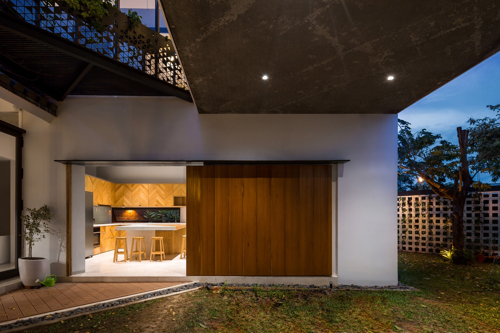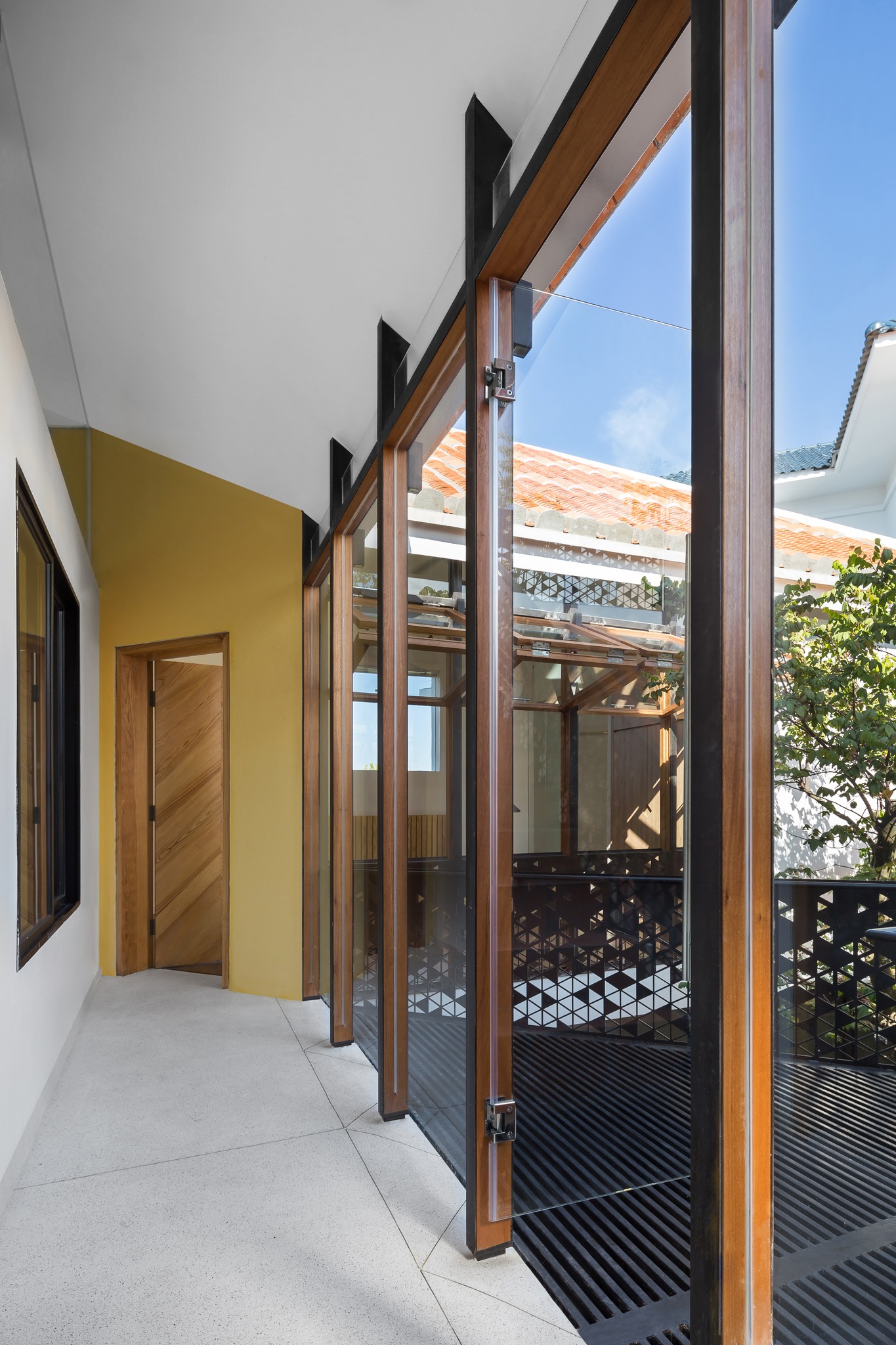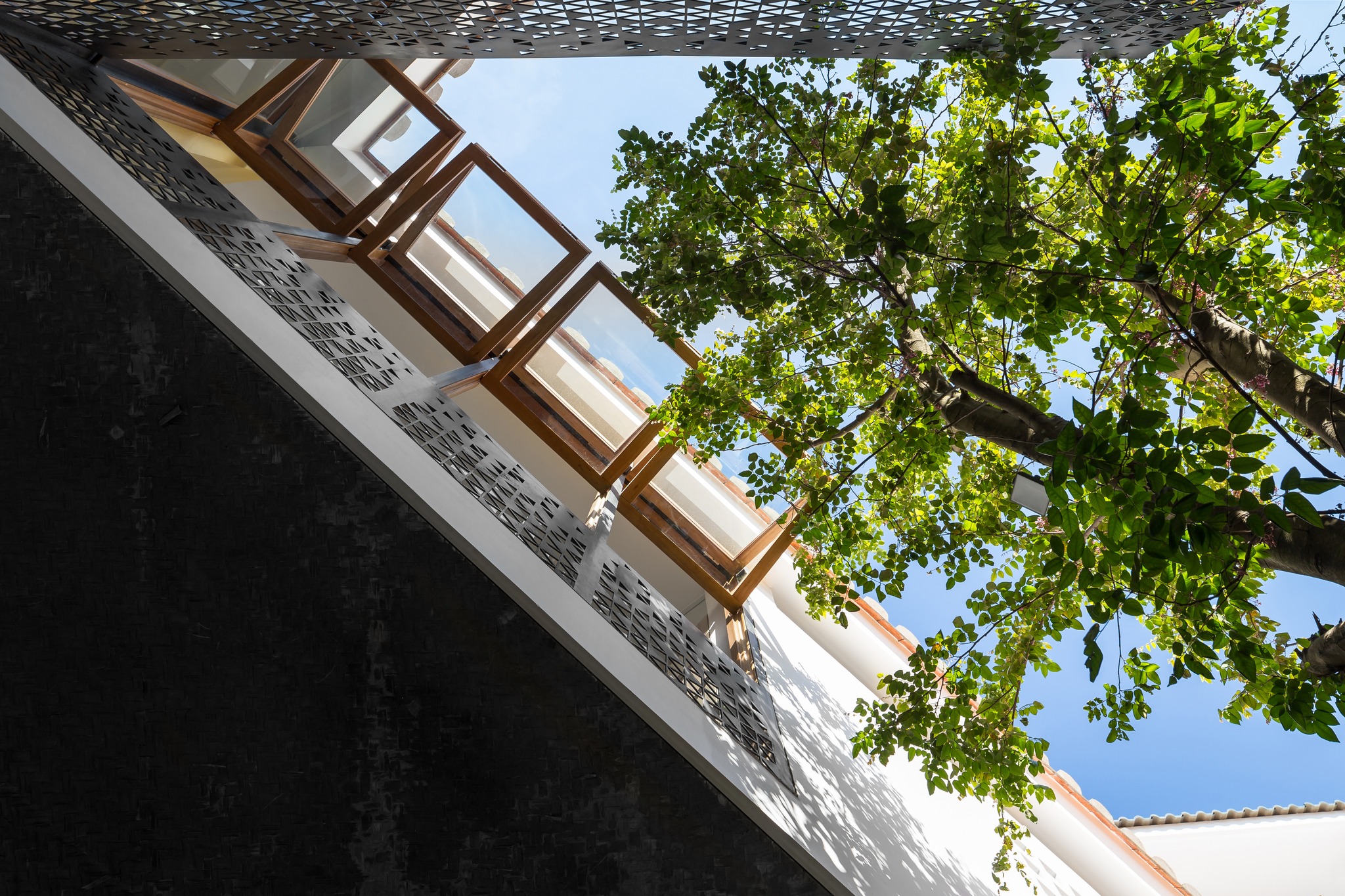 Tầng lầu Xoay 180o so với tầng trệt, tạo thành bố cục khép kín quanh khoảng sân trong, nơi tổ chức cảnh quan và tập trung tất cả view nhìn. Kết hợp nếp nhà ngói địa phương thân thuộc, vừa đáp ứng môi trường khí hậu khu vực, vừa nhấn mạnh sự bất ngờ khi chuyển tiếp từ vẻ đương đại bên ngoài đến bầu không khí gần gũi bên trong.
