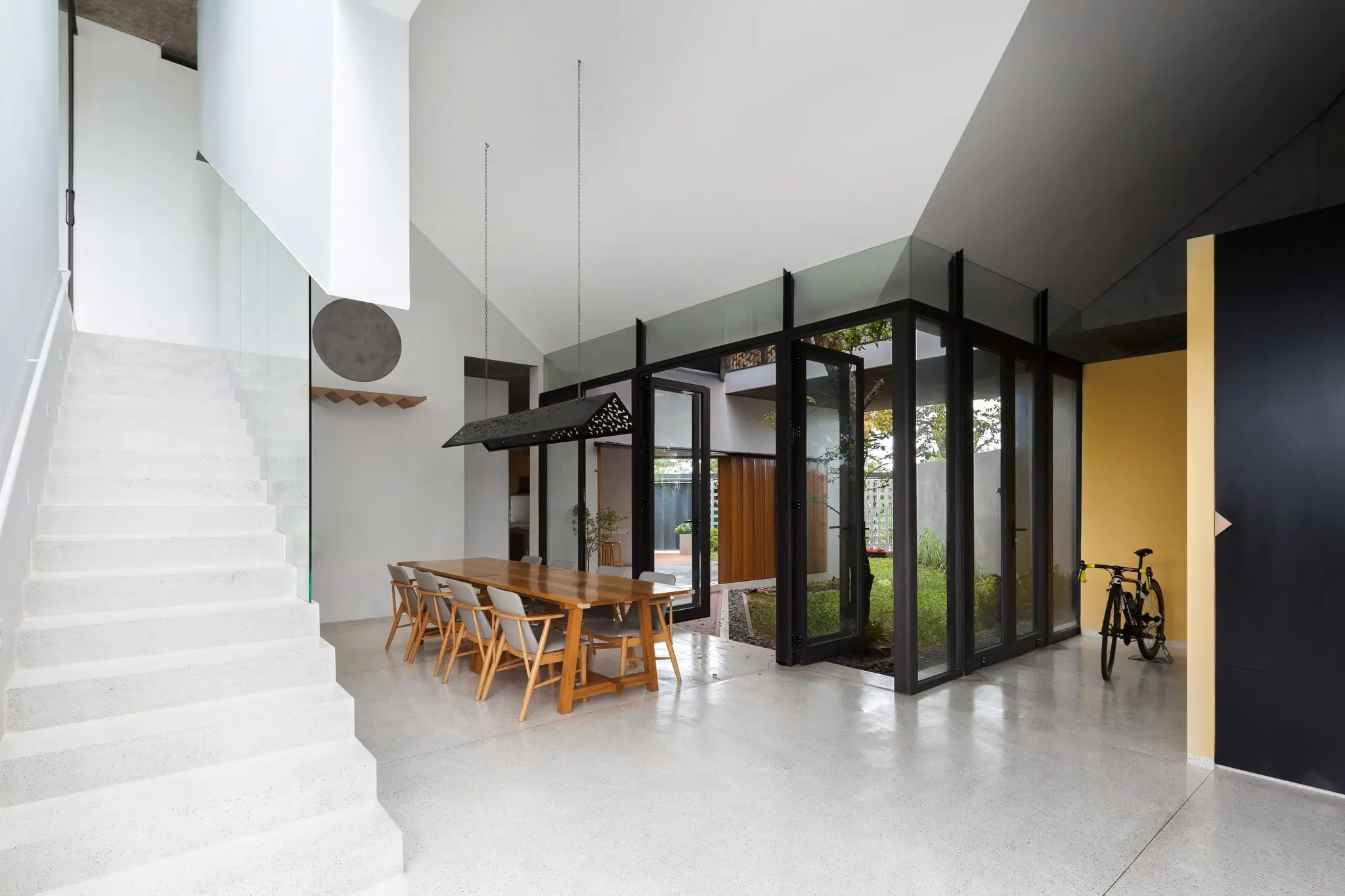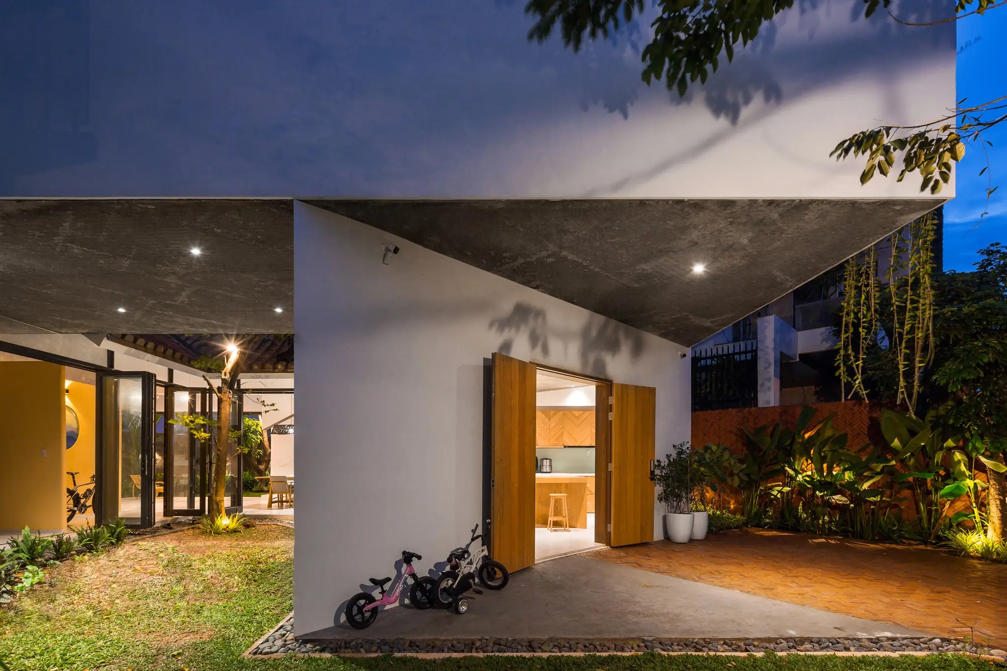 Toàn bộ tầng trệt ưu tiên cho việc chơi mà học của trẻ, gồm các sàn trống nằm giữa hai khoảng sân vườn, liên kết nhau tạo thành một sân chơi rộng lớn. Công năng còn lại – góc làm việc của cha, góc bếp của mẹ – được tiết giảm diện tích và “hỗ trợ” xung quanh, giữ hoạt động của con trẻ luôn ở trong tầm mắt.