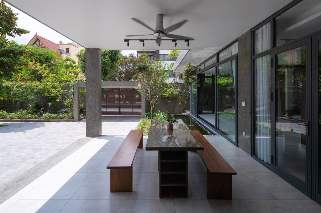 Bất cứ góc nào trong ngôi nhà cũng có thể tiếp cận với ánh sáng, với gió mát, cây xanh. Vẻ đẹp mộc mạc của chất liệu chủ đạo đá mài terrazzo đã làm nổi bật sự tinh giản nhưng tiện nghi của ngôi nhà, làm nền cho cây cối đang dần lớn lên cùng sự trưởng thành của những đứa trẻ trong gia đình.