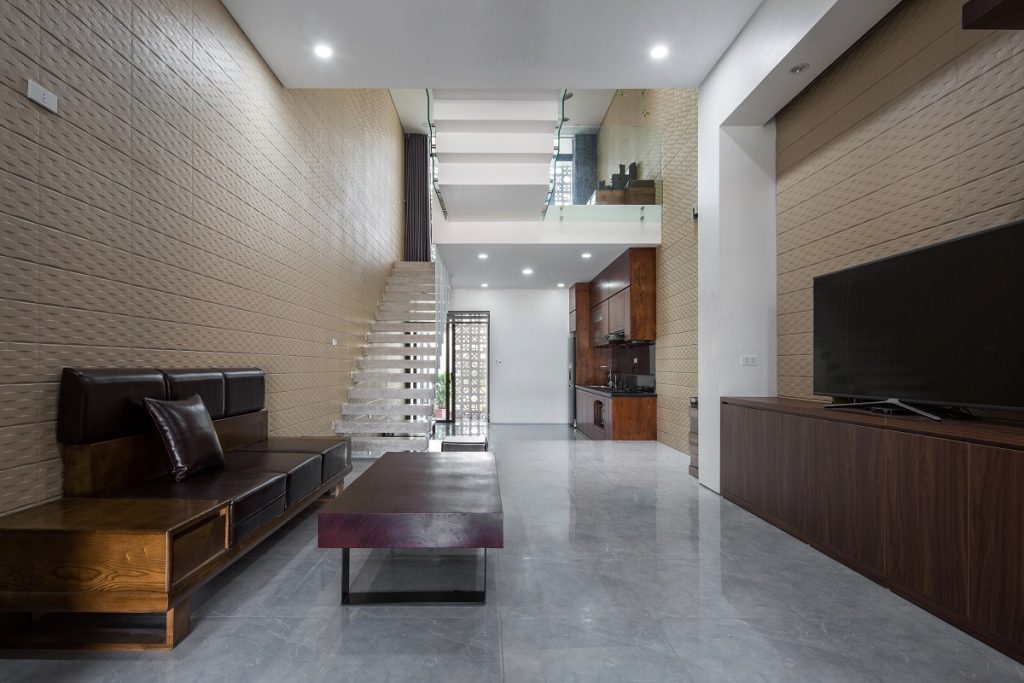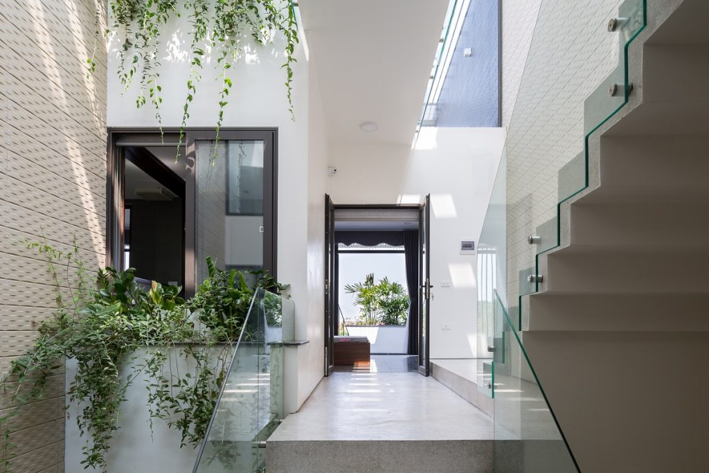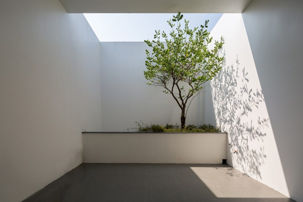 Một giếng trời nhỏ được bố trí phía sau nhà giúp đảm bảo sự cân bằng cảnh quan giữa các tầng, giúp tăng khả năng đối lưu gió, làm mát không gian, tăng tính kết nối và giúp thoát hiểm nhanh hơn khi gặp sự cố. Đây cũng là giải pháp giúp cải thiện cảnh quan, tầm nhìn và không khí trong phòng cho các không gian chính như phòng ngủ và phòng khách phía sau nhà.