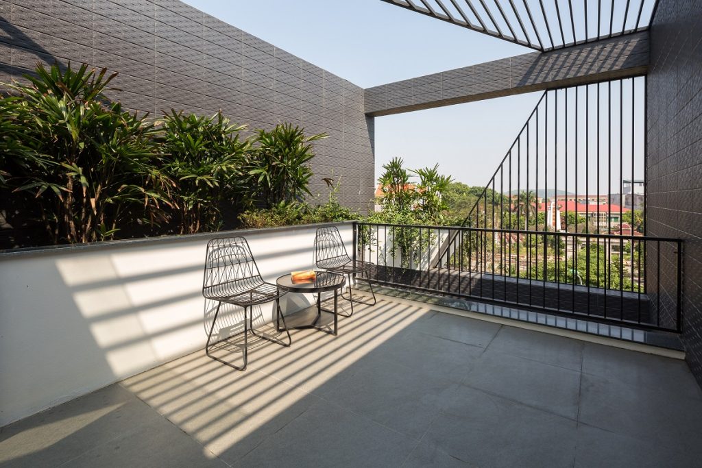 Mặt tiền ngôi nhà được tạo hình tương phản về màu sắc, hình khối và vật liệu, tạo ra điểm nhấn rõ ràng hơn. Logia ở các tầng nằm cạnh bồn hoa mặt tiền được kết nối với nhau thông qua các khoảng trống tầng phía trước mặt tiền tạo ra không gian đệm để nghỉ ngơi, làm việc nhưng vẫn đảm bảo được sự riêng tư, đồng thời giúp mở rộng tầm nhìn, cải thiện không gian sống và hạn chế tác động của gió vào ngôi nhà.