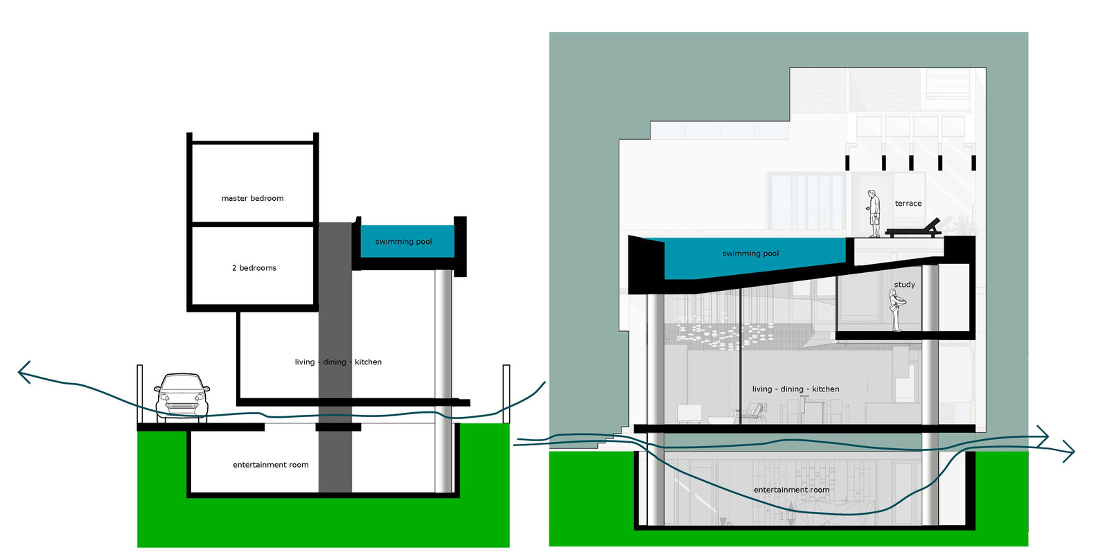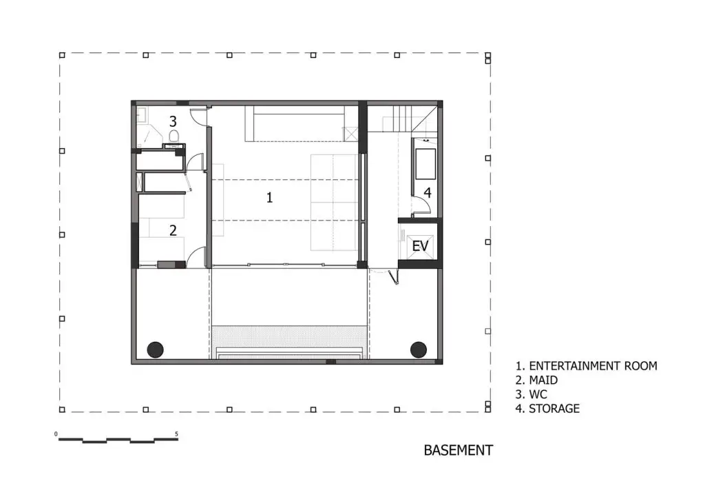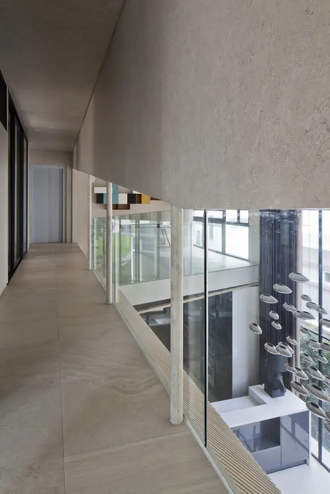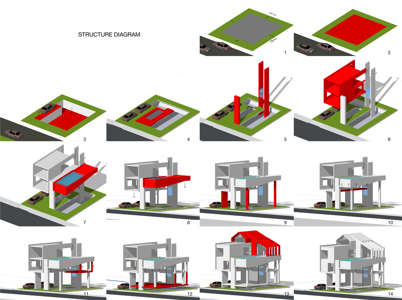 Mô tả bằng văn bản do các kiến trúc sư cung cấp. Chúng tôi đề xuất cân bằng toàn bộ thể tích bao gồm các phòng ngủ ở một bên và bể bơi ở bên kia. Ở giữa, một bức tường chịu lực và lõi thang máy chịu trọng lượng của cả phòng ngủ và bể bơi. Tiếp theo, chúng tôi treo các tầng từ bể bơi bằng các thanh thép đường kính 100 mm để tránh kết cấu cột và dầm truyền thống, nhờ đó có thêm không gian trần. Do hệ thống treo, sàn tầng một được nâng cao khỏi mặt đất, tạo ra một khoảng trống để thông gió tự nhiên ở tầng hầm và toàn bộ ngôi nhà. Để tăng thêm độ an toàn về kết cấu, chúng tôi bố trí thêm các cột phụ cho bể bơi và các không gian sinh hoạt.