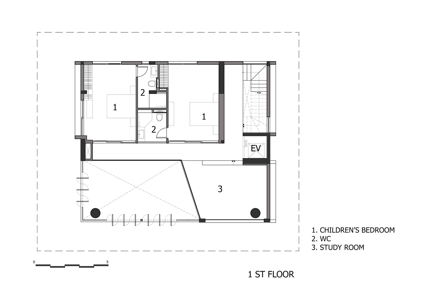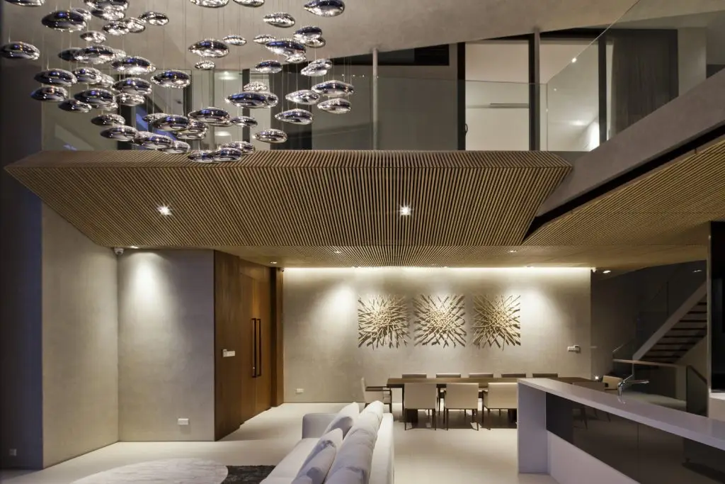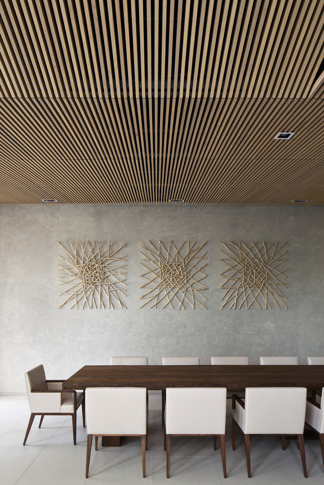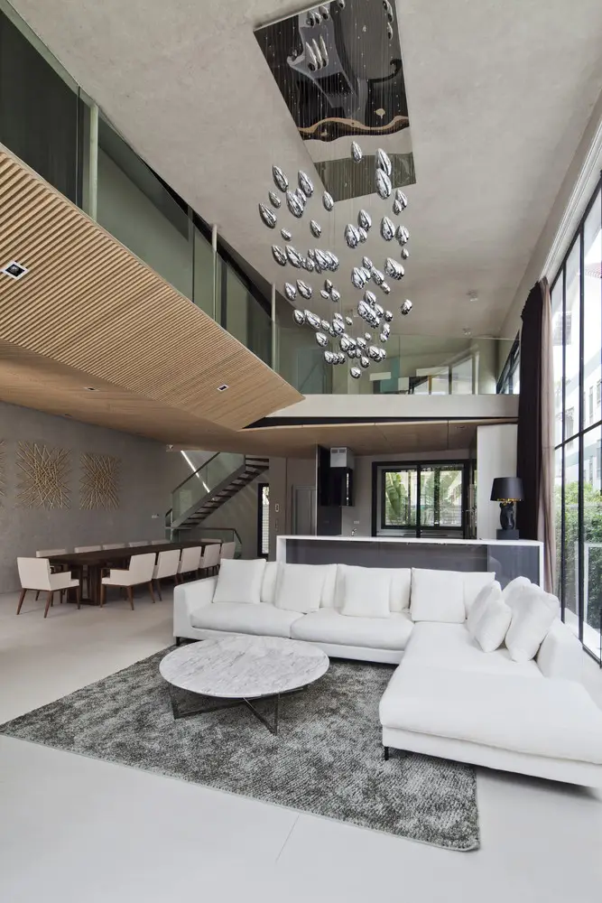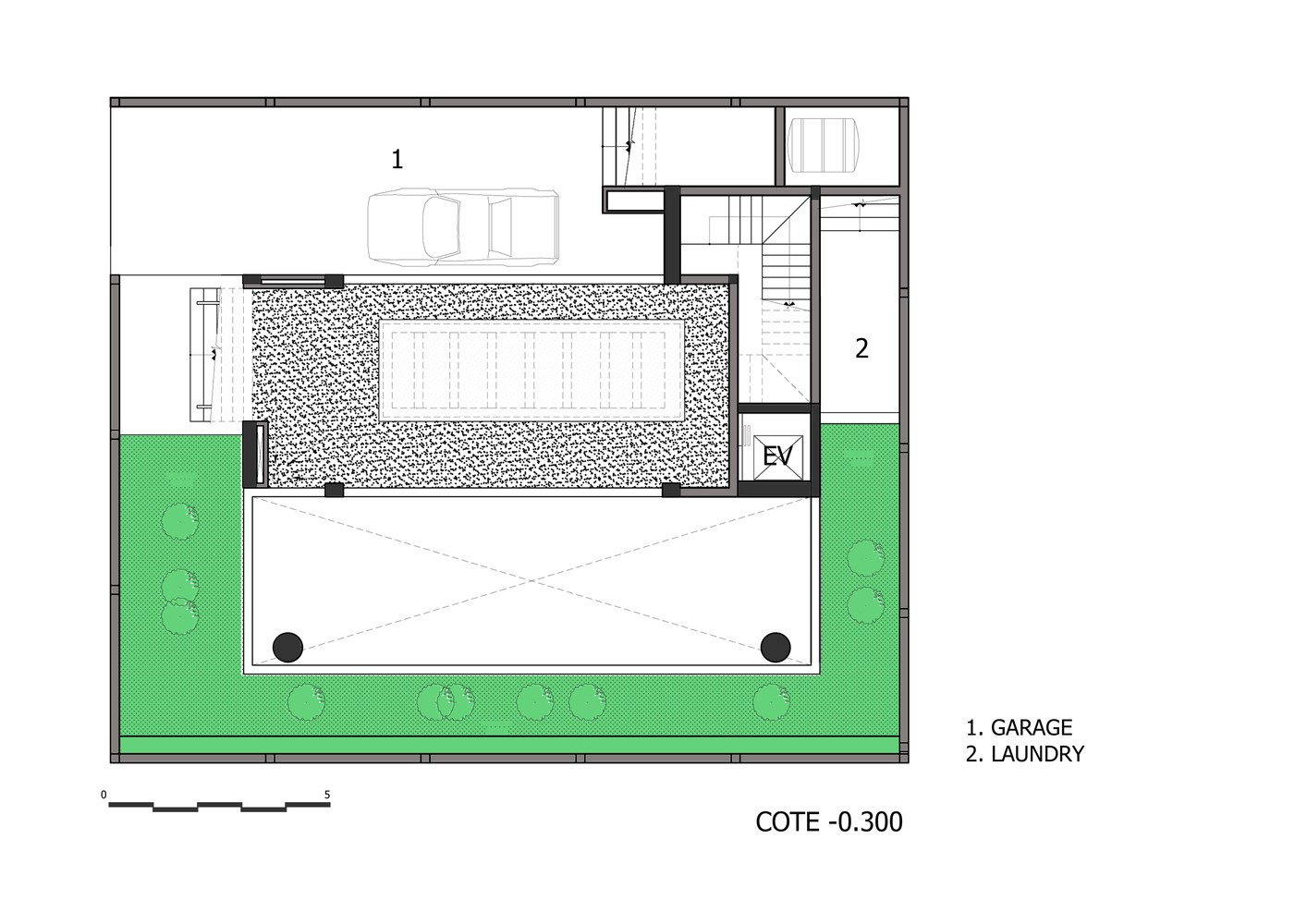 Mô tả bằng văn bản do các kiến trúc sư cung cấp. Chúng tôi đề xuất cân bằng toàn bộ thể tích bao gồm các phòng ngủ ở một bên và bể bơi ở bên kia. Ở giữa, một bức tường chịu lực và lõi thang máy chịu trọng lượng của cả phòng ngủ và bể bơi. Tiếp theo, chúng tôi treo các tầng từ bể bơi bằng các thanh thép đường kính 100 mm để tránh kết cấu cột và dầm truyền thống, nhờ đó có thêm không gian trần. Do hệ thống treo, sàn tầng một được nâng cao khỏi mặt đất, tạo ra một khoảng trống để thông gió tự nhiên ở tầng hầm và toàn bộ ngôi nhà. Để tăng thêm độ an toàn về kết cấu, chúng tôi bố trí thêm các cột phụ cho bể bơi và các không gian sinh hoạt.