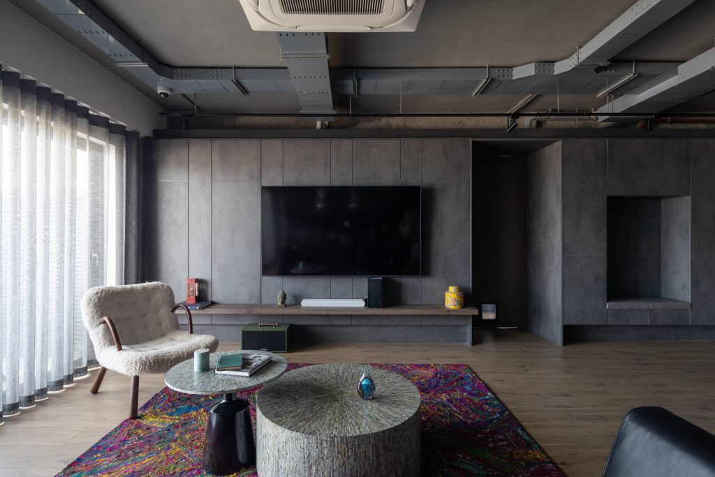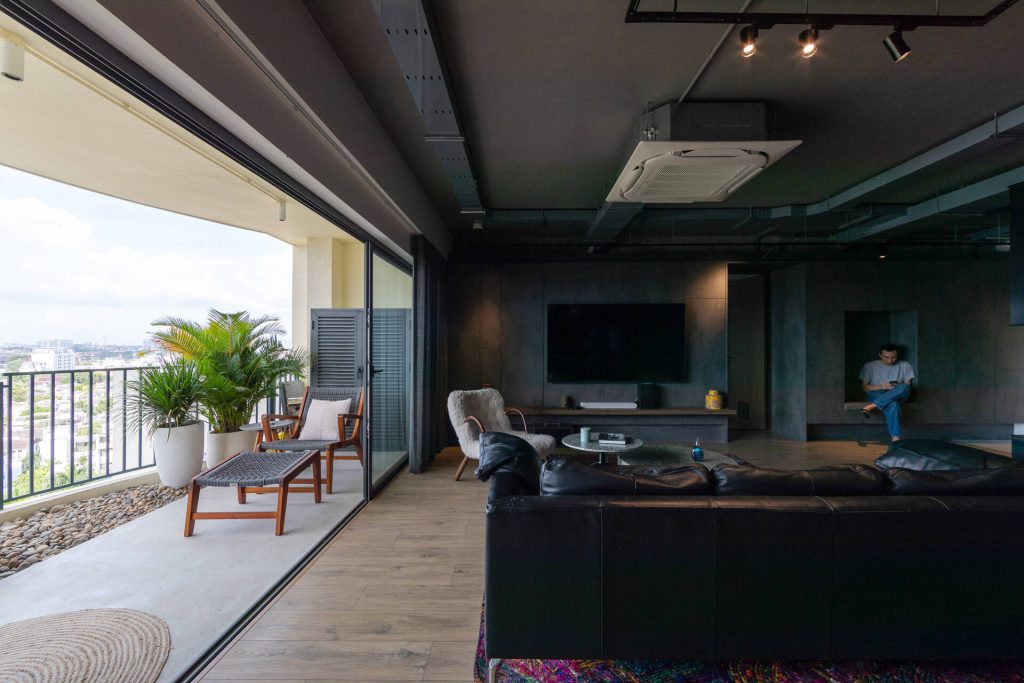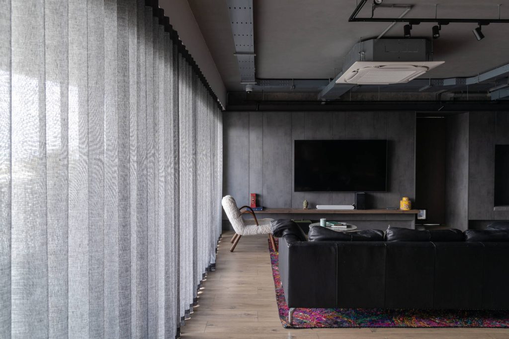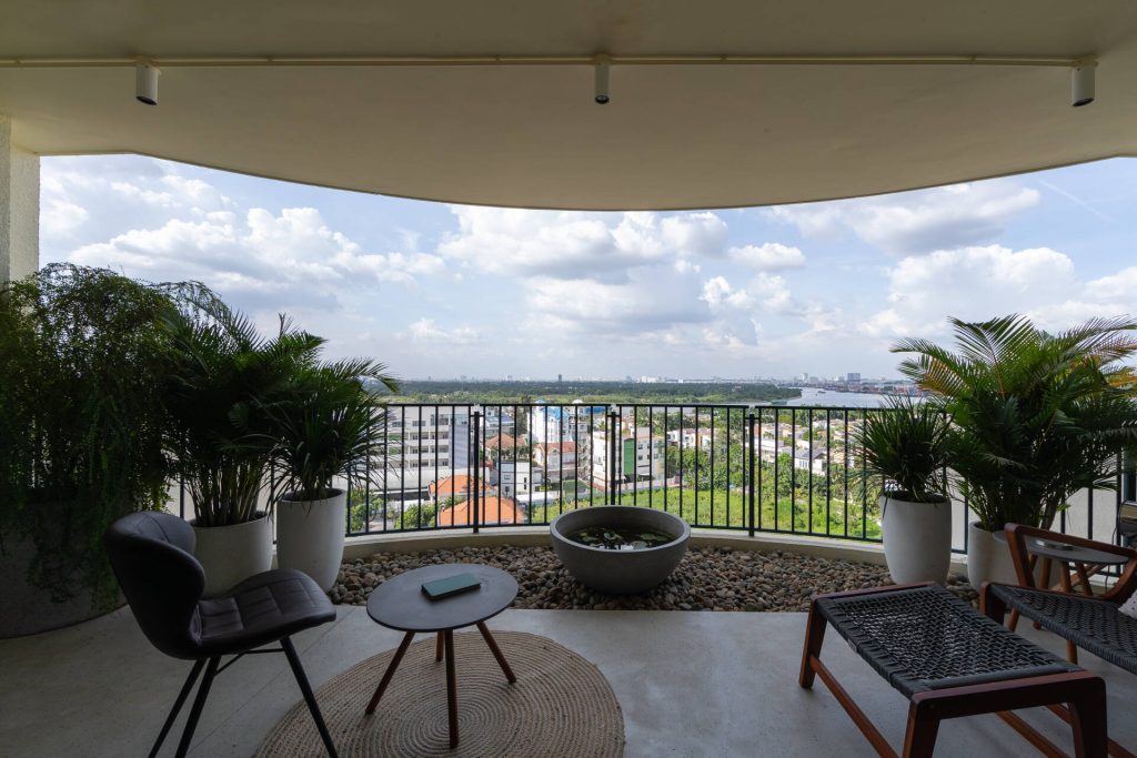 Ở phía đối lập thì không gian chung lại thể hiện sự cởi mở hơn. Mỗi khi lớp rèm được kéo ra, khoảng không gian rộng lớn của khu vực sông Sài Gòn dường như theo gió, ánh sáng tự nhiên lập tức tràn vào căn hộ và “in” trên bề mặt thép bởi sự phản chiếu.