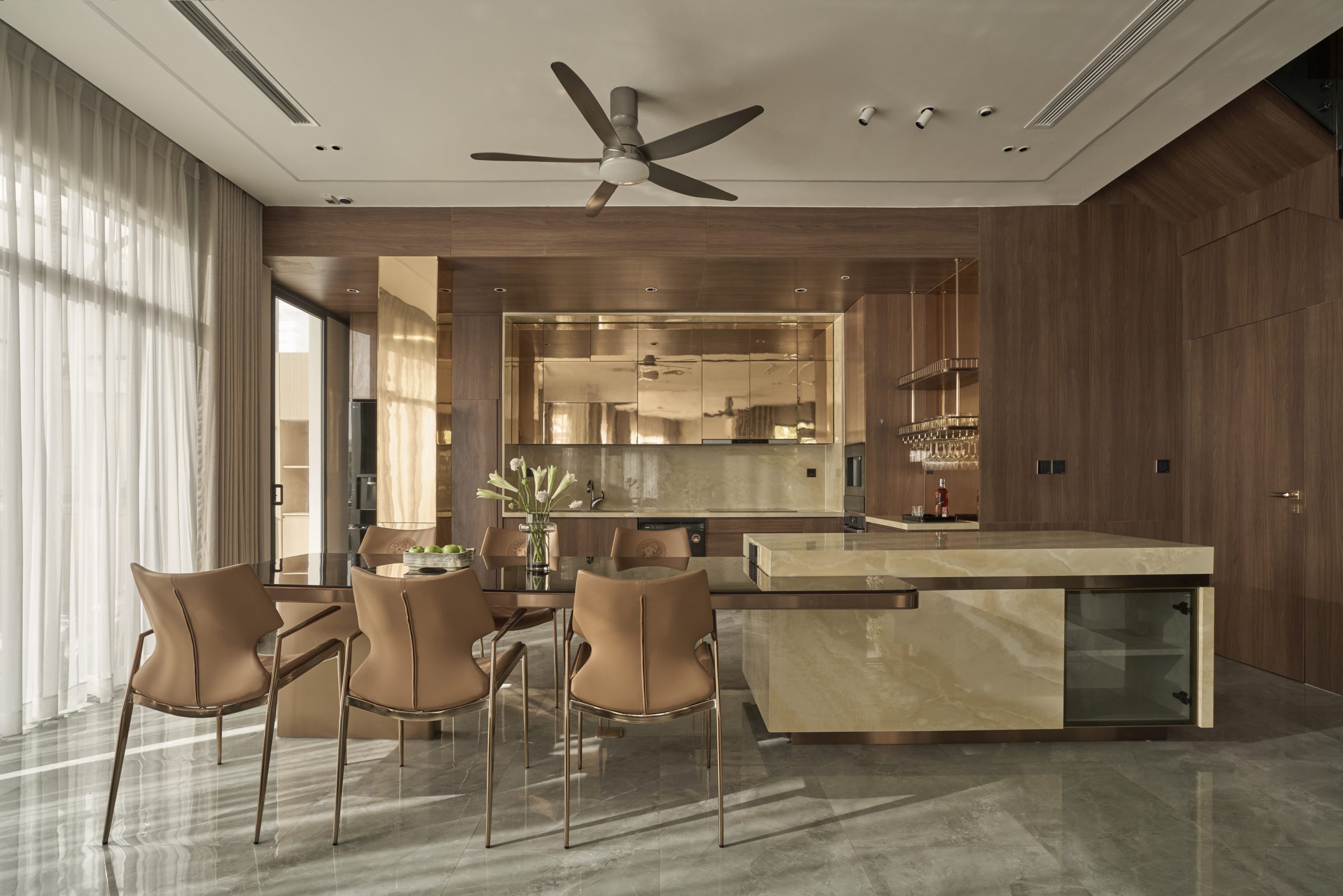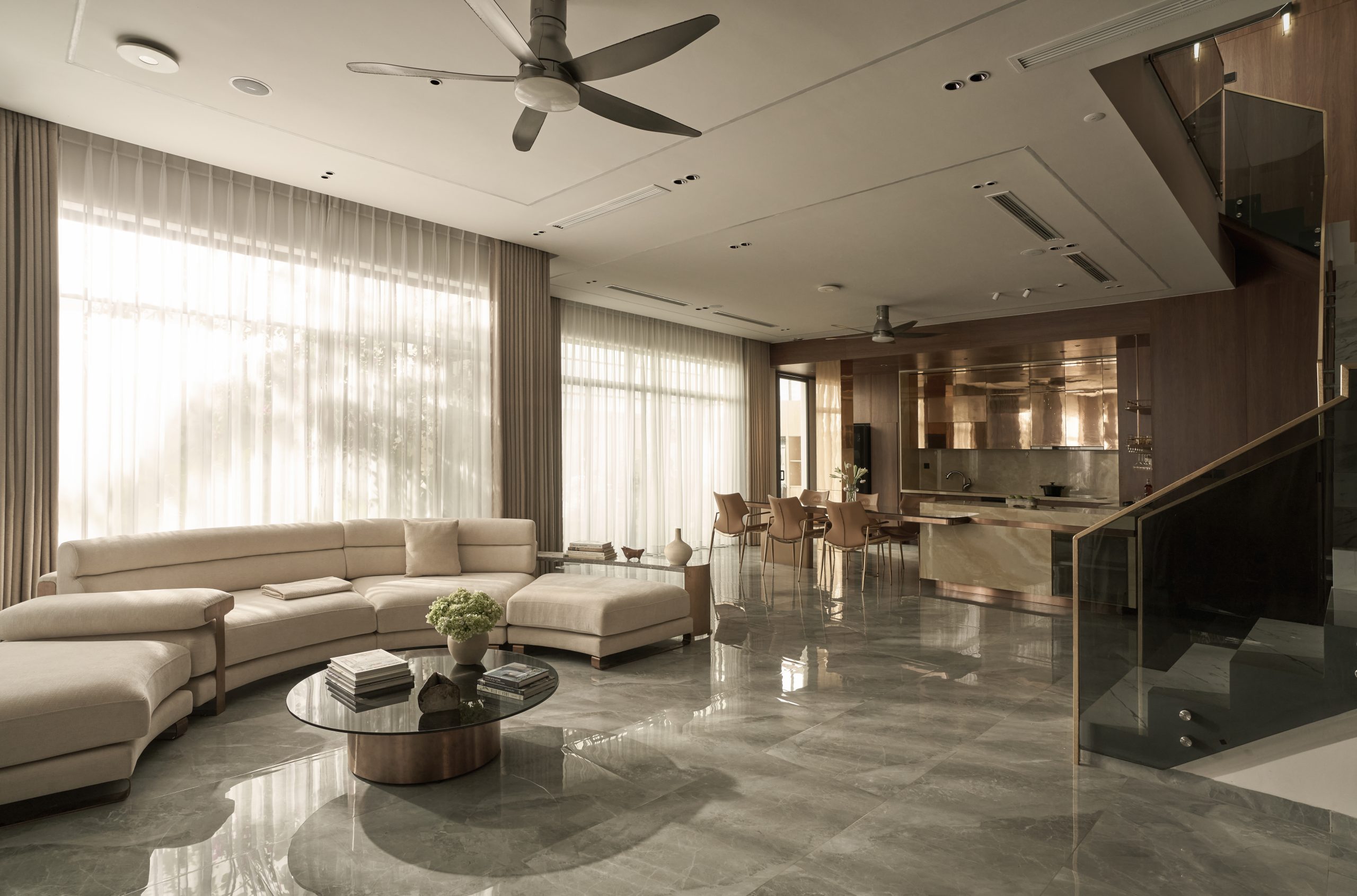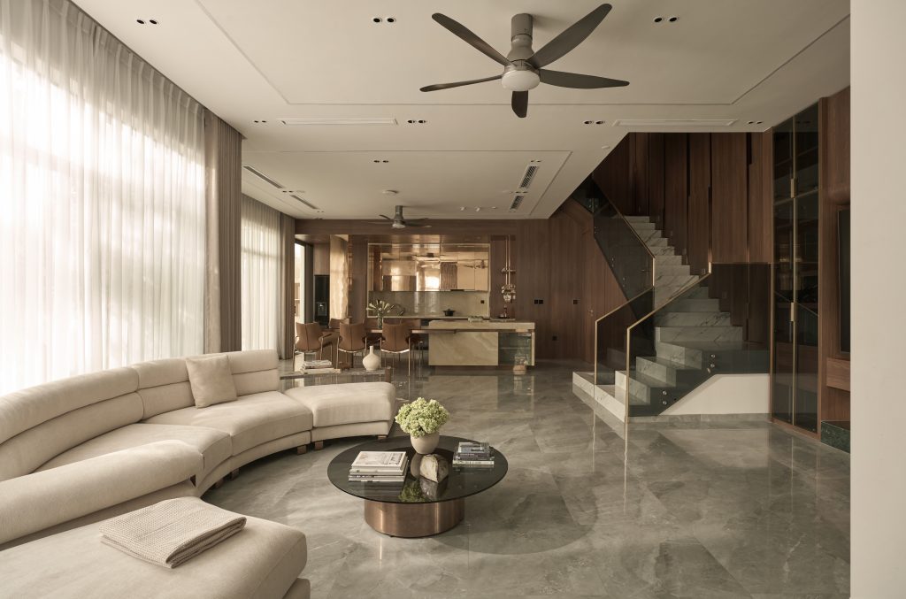 Ricky’s Villa được kiến tạo theo tinh thần Modern Luxury, nơi sự sang trọng không phô trương mà thể hiện qua cách tổ chức không gian chặt chẽ, vật liệu được chọn lọc tinh tế và ánh sáng được xử lý khéo léo. Tổng thể công trình mang cảm giác thoáng đãng, liền mạch, với những mảng gỗ ấm, đá tự nhiên và bề mặt hoàn thiện cao cấp đan xen hài hòa, tạo nên một không gian sống vừa hiện đại vừa giàu chiều sâu cảm xúc.