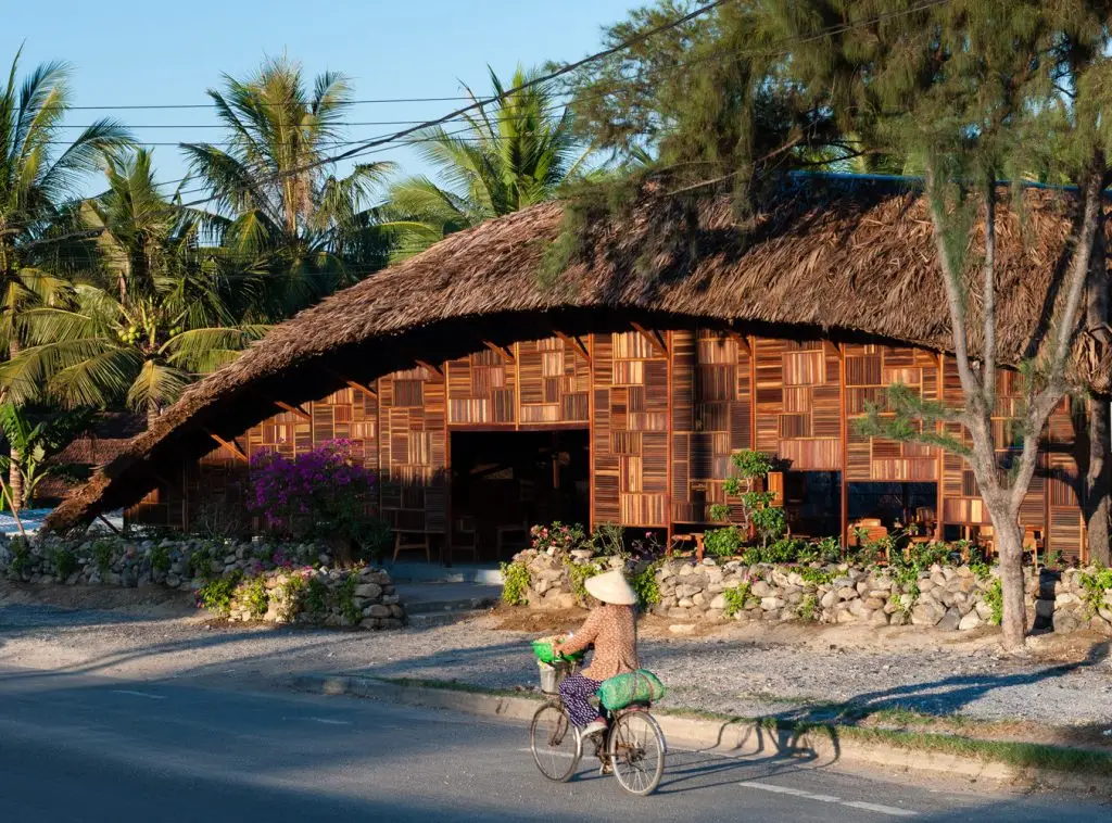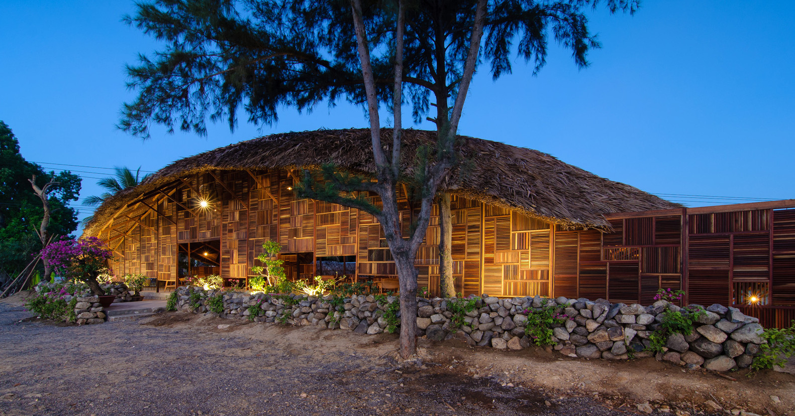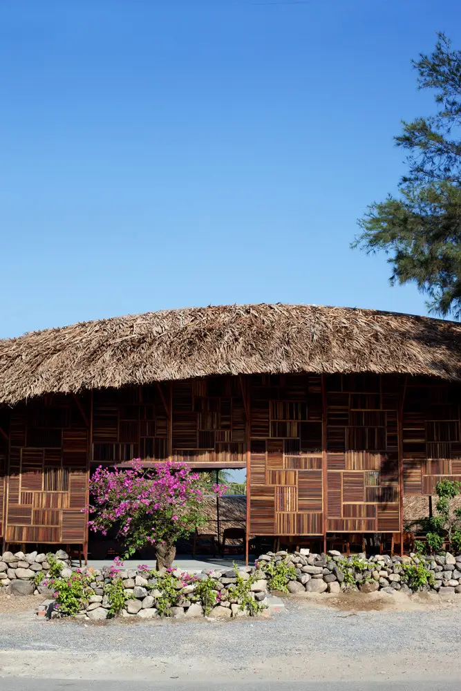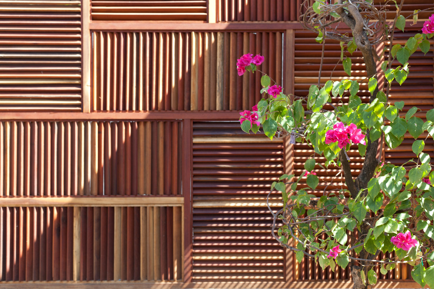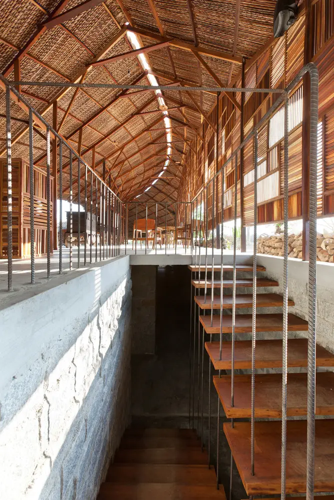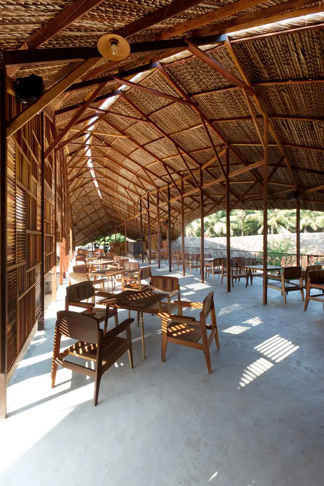 Những mảnh gỗ vụn với đủ kích thước và hình dạng được tái sử dụng để tạo ra những công năng mới. Những mảnh nhỏ được tận dụng để làm các tấm chắn nắng ở lối vào, vừa giúp ngăn nhiệt và tiếng ồn từ đường cao tốc, vừa tạo nên những họa tiết trang trí gợi nhớ đến những cánh cửa gỗ cũ kỹ được sử dụng từ nhiều năm trước. Bên cạnh đó, cấu trúc chính được tạo thành từ các bộ phận lớn hơn, được kết nối bằng kỹ thuật mộng và chốt truyền thống. Tóm lại, các mảnh vật liệu được sử dụng bằng mọi cách có thể để ứng dụng vào công trình mà không cần phải chặt thêm cây nào. Hơn nữa, ngoài gỗ, bằng cách sử dụng đá và lá dừa địa phương, những vật liệu sống động, công trình được tái chế này tràn đầy sự hài hòa và cảm giác bản địa.