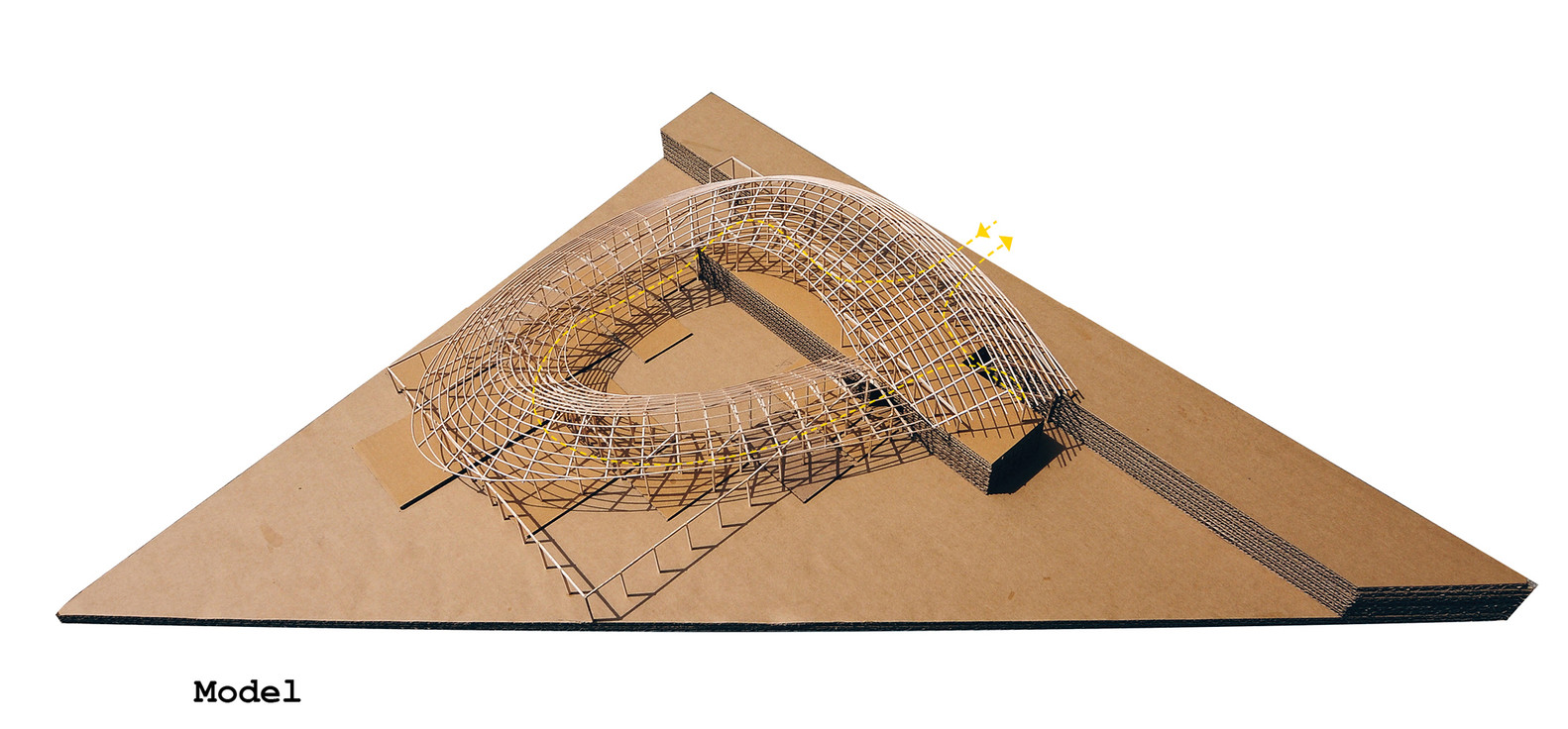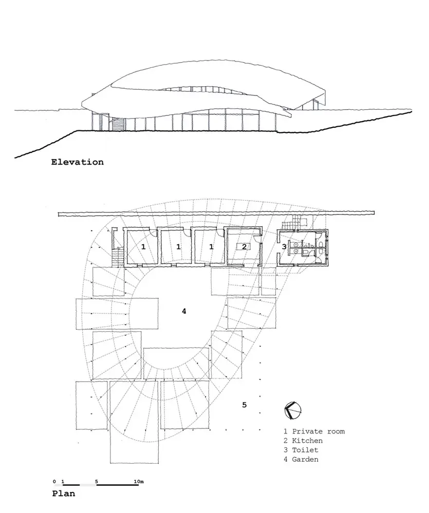 Ấn tượng đầu tiên về quán cà phê là mái tranh cong độc đáo trải dài từ đường cao tốc xuống tận bờ sông. Mái nhà duy nhất đó kết nối hai tầng khác nhau thành một và làm mềm đi cấu trúc cứng nhắc bên dưới. Khách hàng được dẫn dắt theo một lối đi độc đáo từ bên ngoài vào bên trong quanh khoảng sân được tạo bởi mái nhà hình vòng cung.