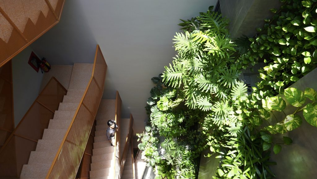GỖ TRỜI – Hé lộ lõi tự nhiên bên trong ngôi nhà – Ngoài vai trò cung cấp ánh sáng và thông gió, giếng trời còn trở thành cánh cửa để khám phá thiên nhiên với vô số loài cây nhiệt đới. Từ phòng ngủ, nằm giữa ngôi nhà, giếng trời mang đến một khung cảnh quyến rũ. Với thiết kế ấn tượng, cầu thang dẫn bạn vào một hành trình khám phá đầy mê hoặc, bắt đầu từ tầng trệt và lên đến sân thượng.