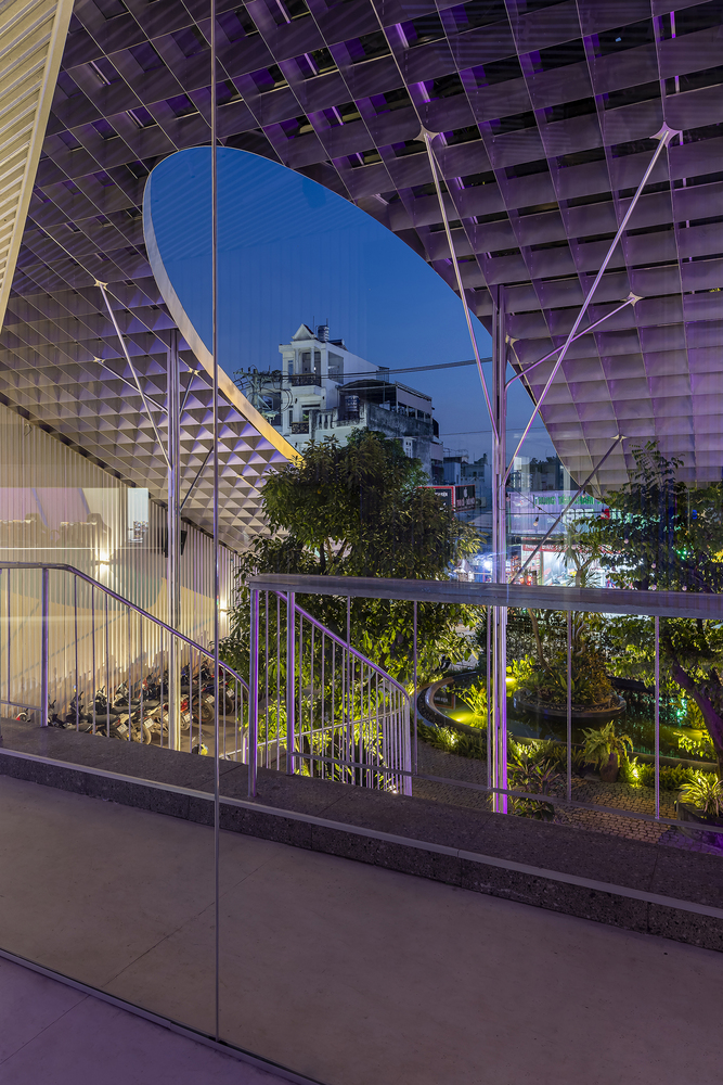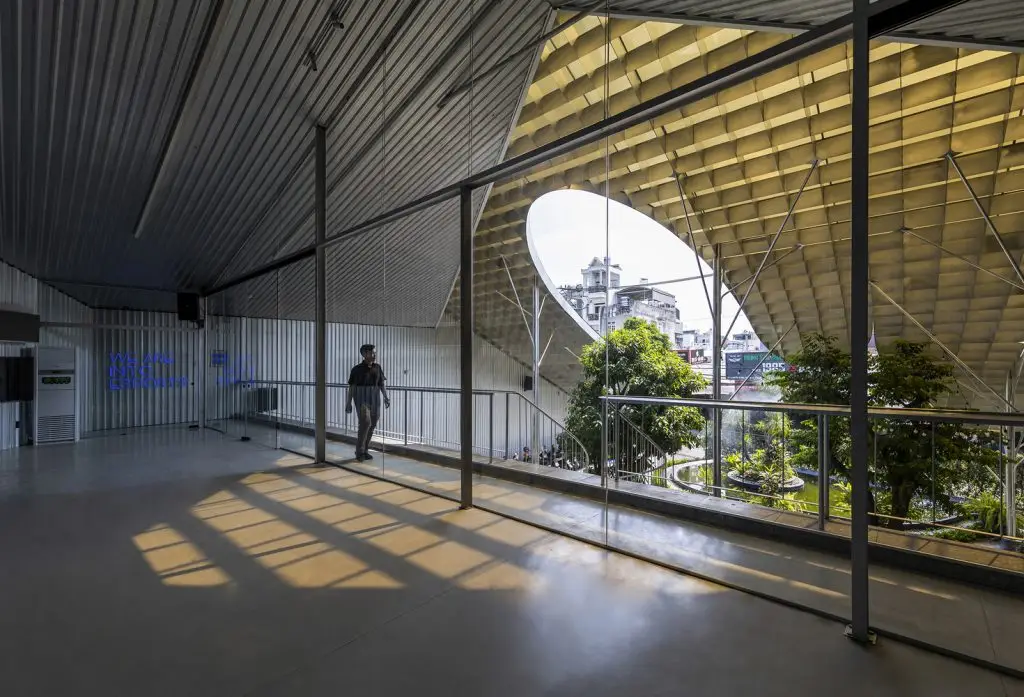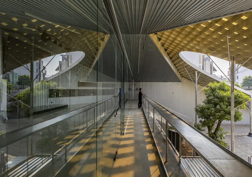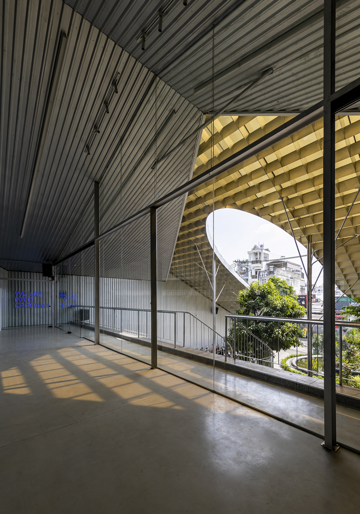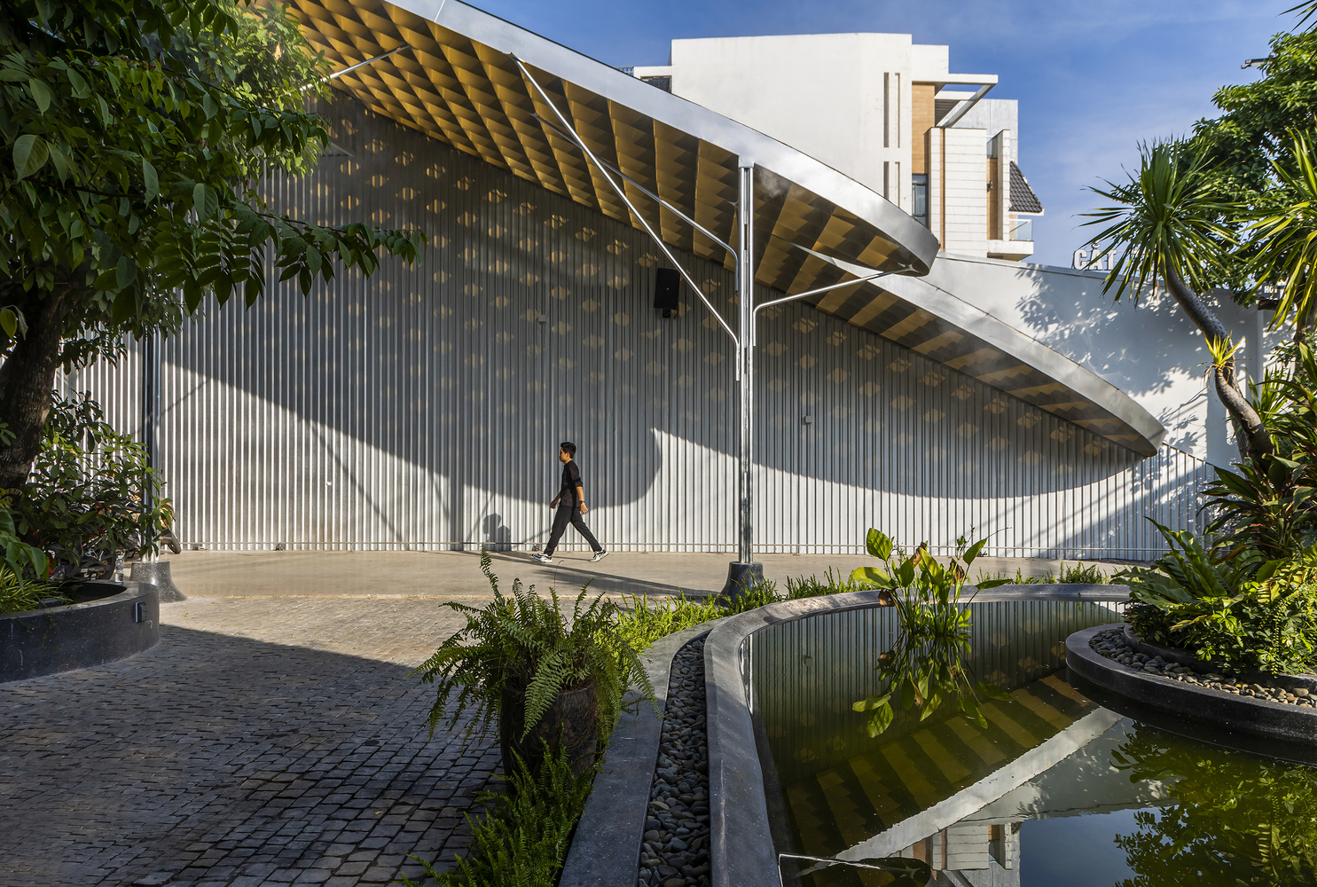 Cấu trúc không gian được dịch chuyển lùi về phía sau 20 mét, tạo ra một vùng đệm giữa công trình và đường phố bên ngoài. Khoảng đệm này được che chắn bởi hệ thống mái lớn trải dài về phía trước, kết hợp với cây xanh và mặt nước, tạo nên sự kết nối nhẹ nhàng và yên bình với môi trường xung quanh. Theo yêu cầu của cơ quan phòng cháy chữa cháy, cần có một hồ nước phía trước công trình, vừa để phòng cháy chữa cháy, vừa tạo cảnh quan và điều hòa không khí. Để tránh ngập lụt trong những ngày mưa lớn và triều cường, chúng tôi đã nâng cao mặt sàn so với bên ngoài.