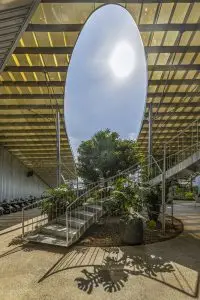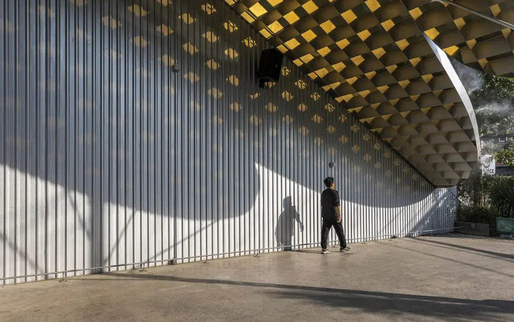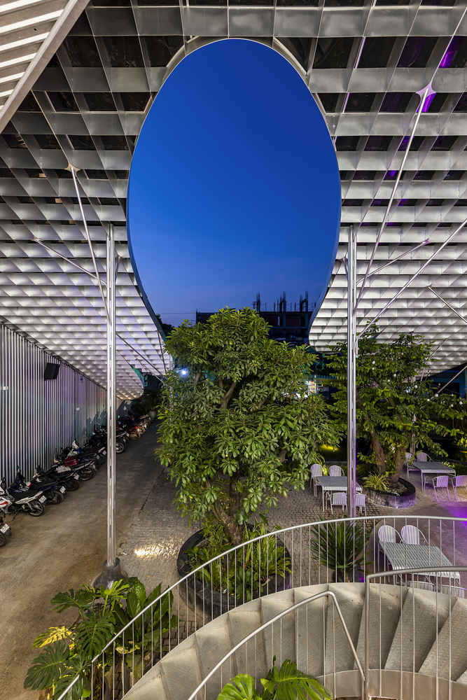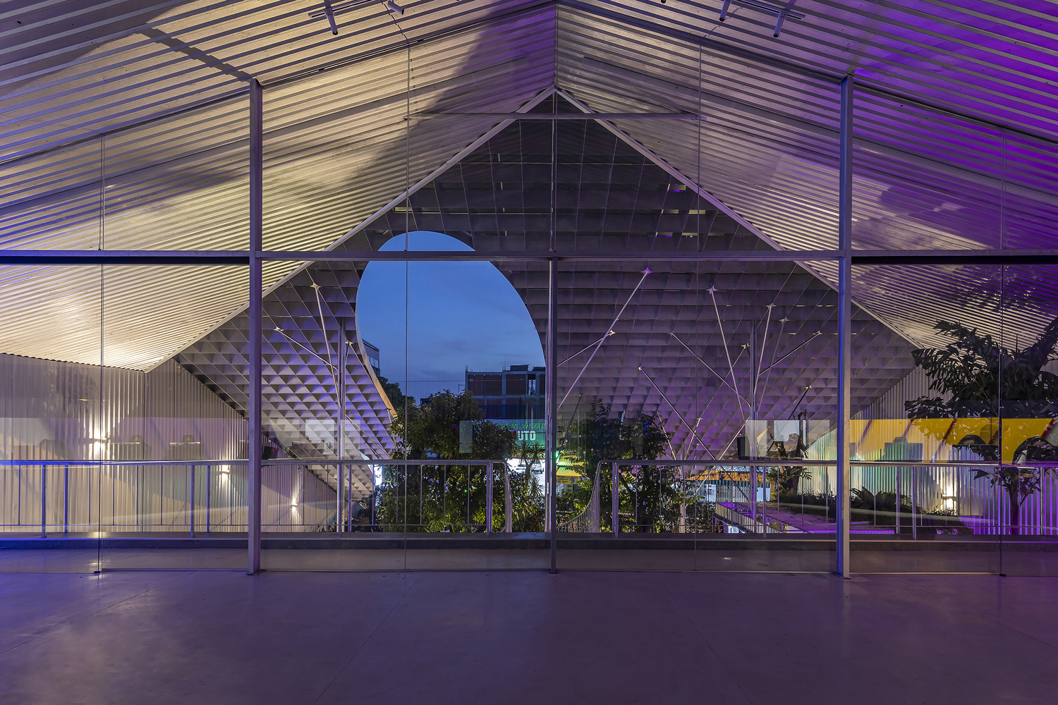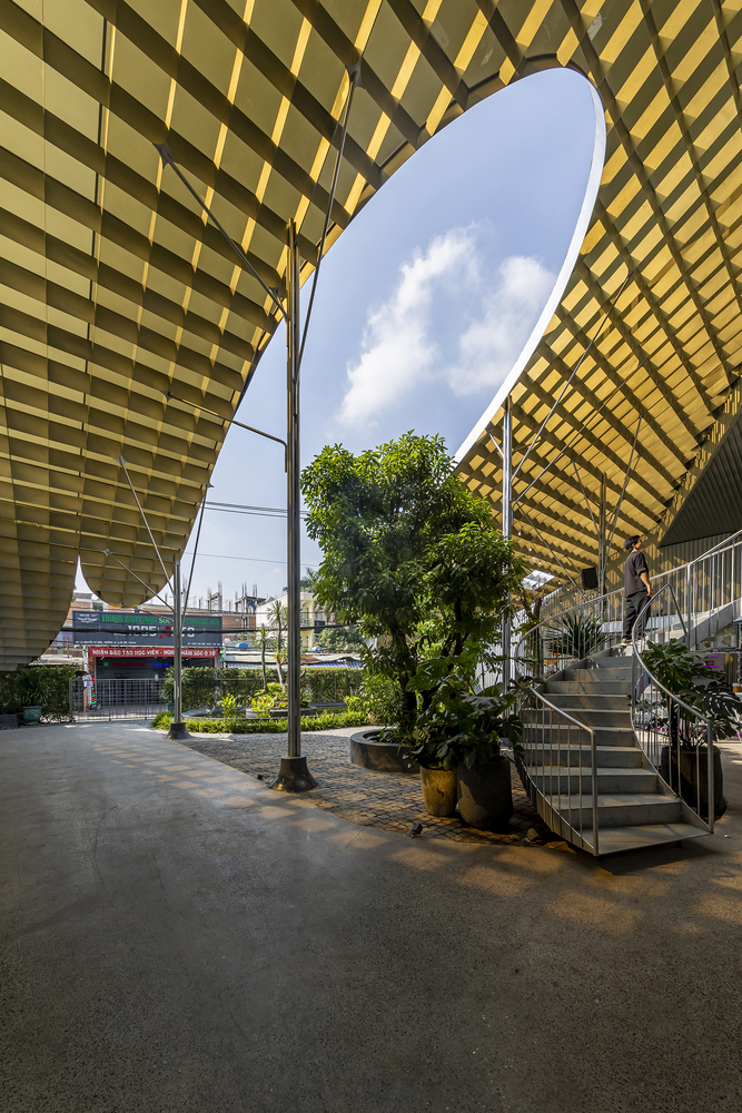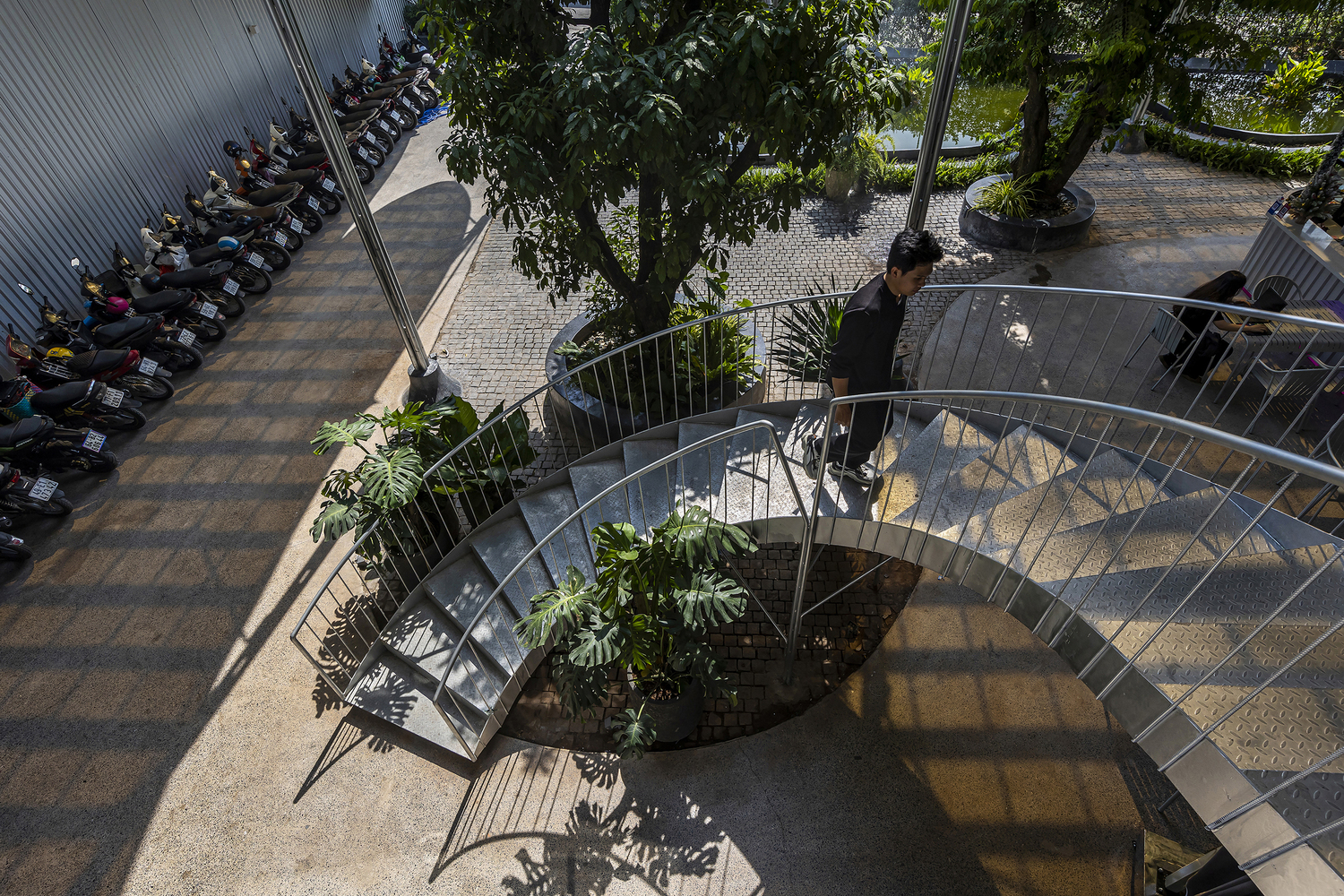Cấu trúc không gian được dịch chuyển lùi về phía sau 20 mét, tạo ra một vùng đệm giữa công trình và đường phố bên ngoài. Khoảng đệm này được che chắn bởi hệ thống mái lớn trải dài về phía trước, kết hợp với cây xanh và mặt nước, tạo nên sự kết nối nhẹ nhàng và yên bình với môi trường xung quanh. Theo yêu cầu của cơ quan phòng cháy chữa cháy, cần có một hồ nước phía trước công trình, vừa để phòng cháy chữa cháy, vừa tạo cảnh quan và điều hòa không khí. Để tránh ngập lụt trong những ngày mưa lớn và triều cường, chúng tôi đã nâng cao mặt sàn so với bên ngoài.