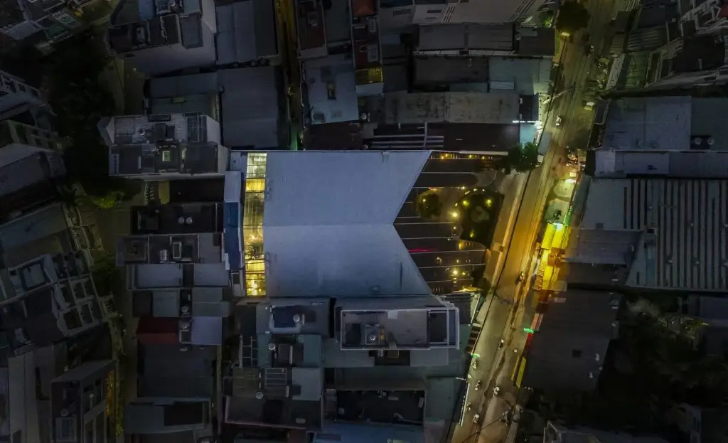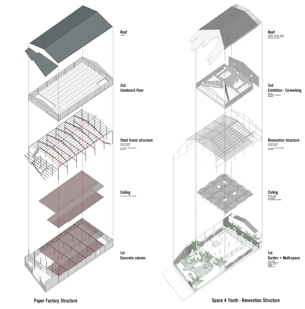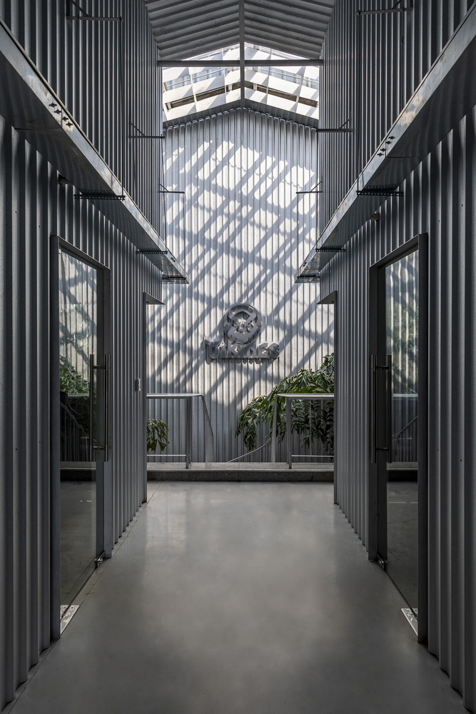 Kết cấu khung mái vẫn giữ nguyên, nhưng chúng tôi bổ sung thêm các lớp cách nhiệt và cách âm, cũng như hệ thống mái PU (chuyên dùng cho tường kho lạnh) và một lớp trần bên dưới để cách nhiệt cho mái. Mái nhà cao 1,2m. Kết hợp hệ thống kỹ thuật vào một đệm khí bên trong hệ thống mái. Thiết kế này giúp giảm thiểu sự truyền nhiệt lên các không gian bên trên, tiết kiệm đáng kể năng lượng cho hệ thống điều hòa không khí khi sử dụng. Để hỗ trợ cách nhiệt cho tòa nhà, hệ thống tấm tường được tích hợp vào hệ thống tường gạch cũ và được ngăn cách bằng một lớp xốp.