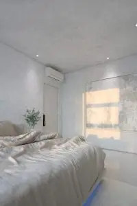 Các nhà thiết kế đã sử dụng các chất liệu hoàn thiện mang tính thô mộc, tối giản như sơn hiệu ứng bê tông, đá xám trắng… với rất ít khác biệt về màu sắc. Không gian nhờ thế trở nên ước lệ, xóa nhòa ranh giới ngăn chia và đem lại hiệu quả nhẹ nhàng.