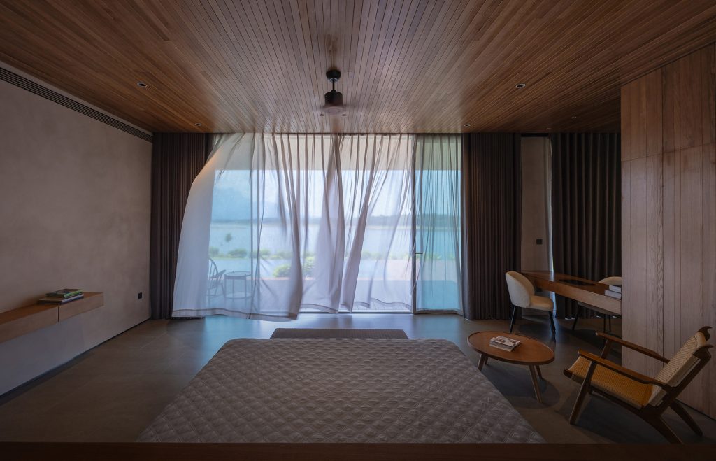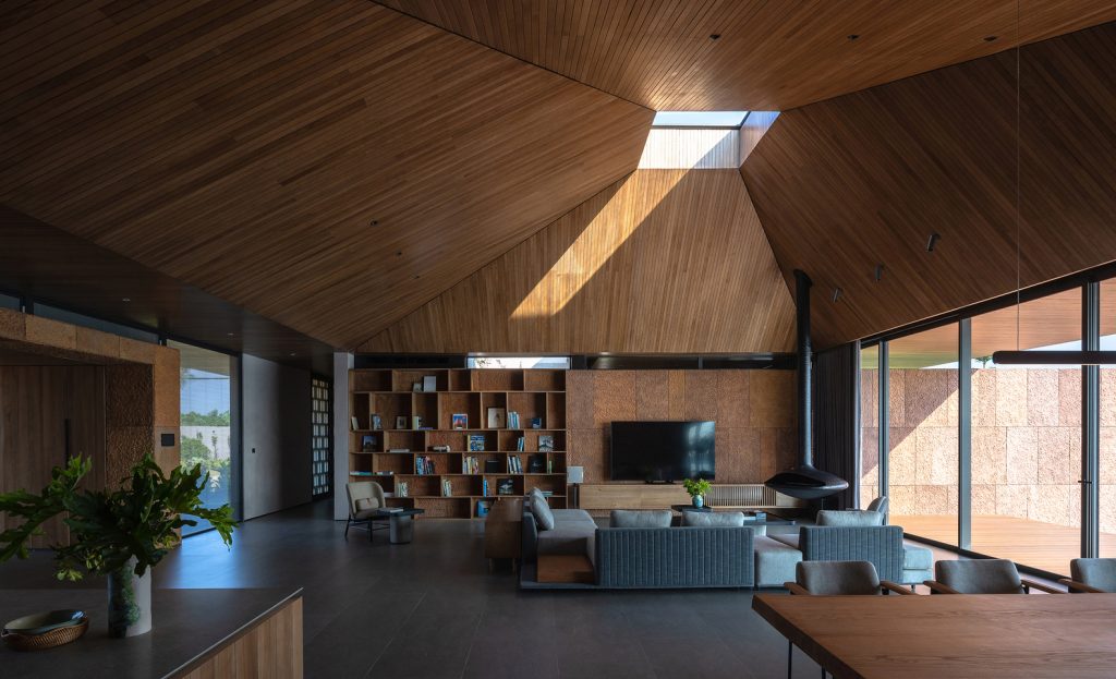 Ngôi nhà được định hướng theo hướng ra hồ để tối đa hóa số lượng không gian có tầm nhìn ra khung cảnh tuyệt đẹp. Mặt khác, các công trình kiến trúc trong vườn cũng được tích hợp, giống như những “mảnh” của các yếu tố tự nhiên nhỏ hơn hòa quyện vào tòa nhà, làm mờ ranh giới giữa bên trong và bên ngoài.