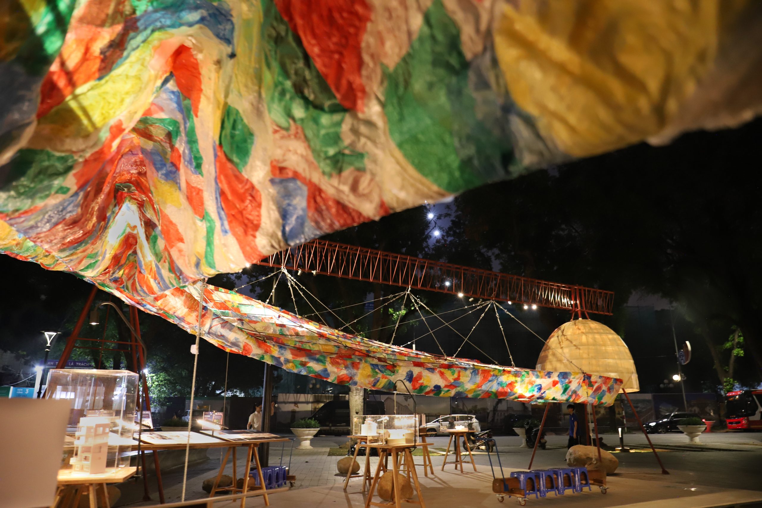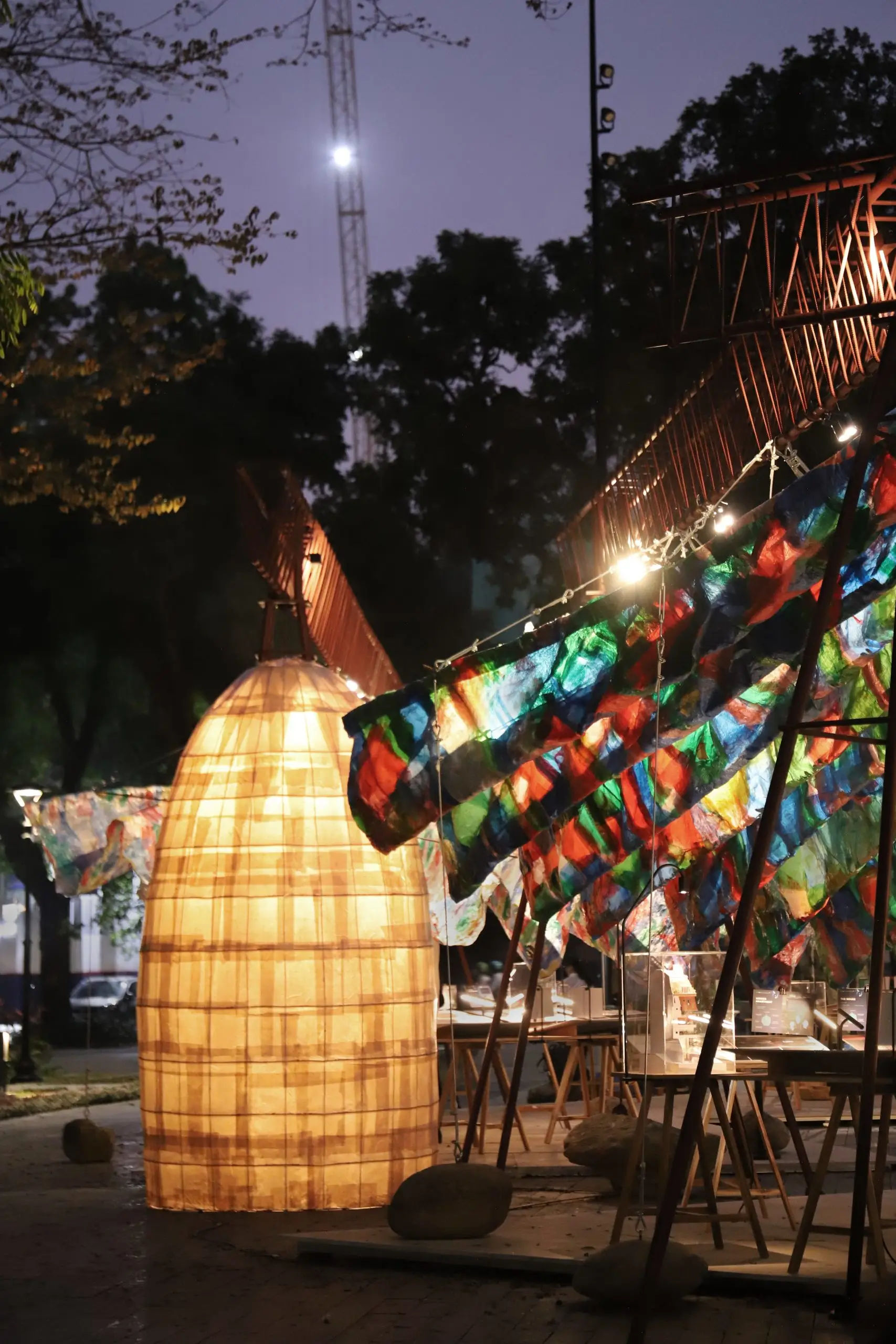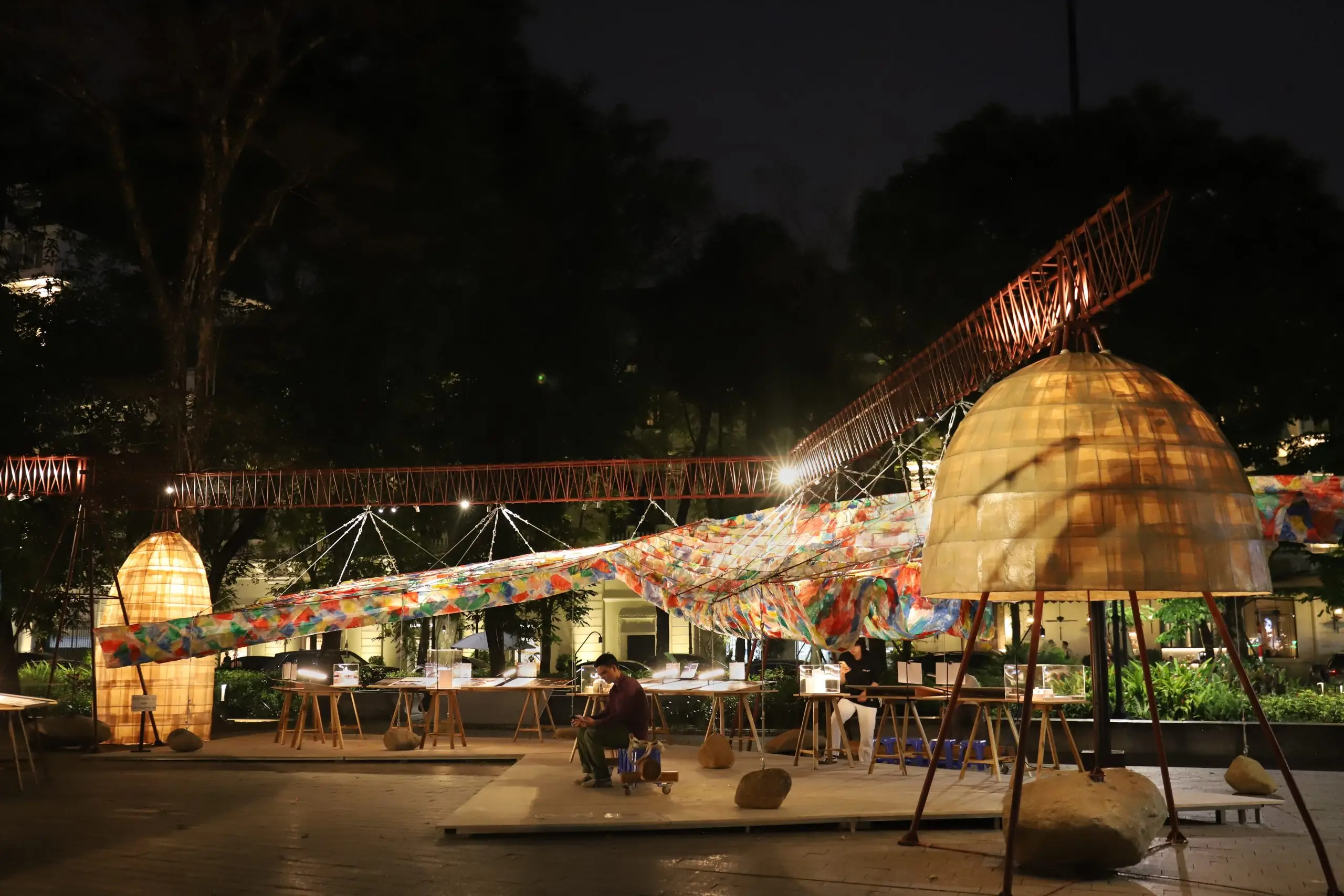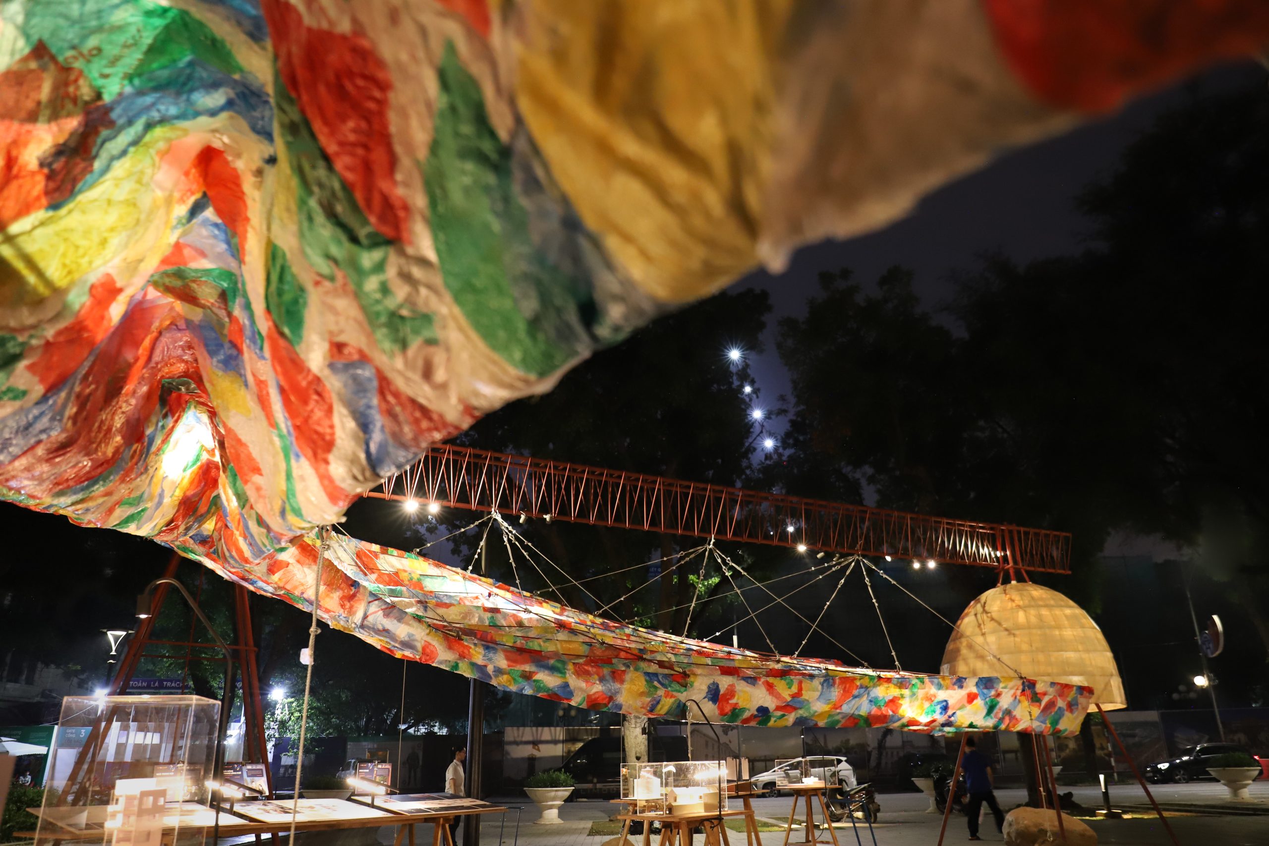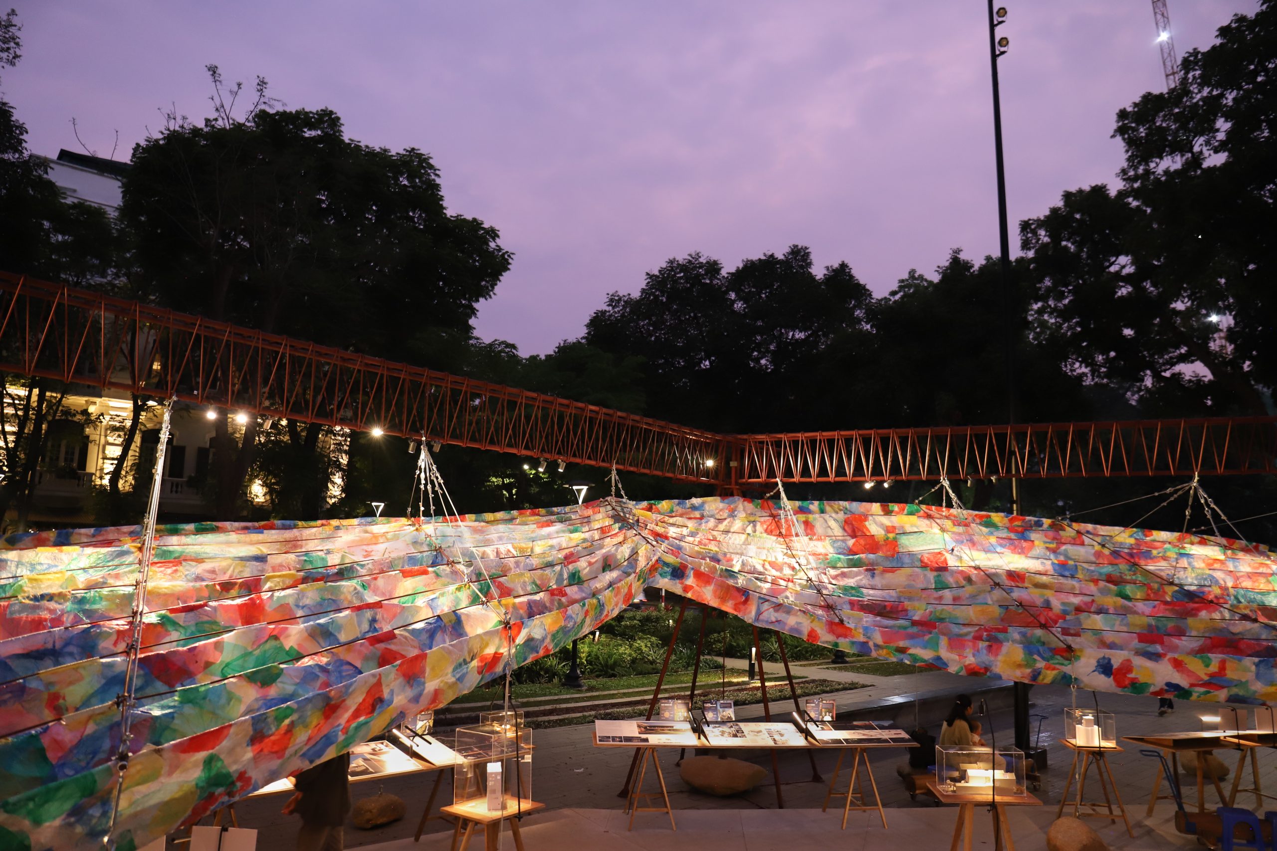 Inspired by Hanoi’s vernacular architecture and craft heritage, the structure features three wing-like roofs representing the three exhibition categories: House, Interior, and Sustainability. Semi-transparent surfaces cast colorful shadows by day and glow at night, creating a dynamic public space.