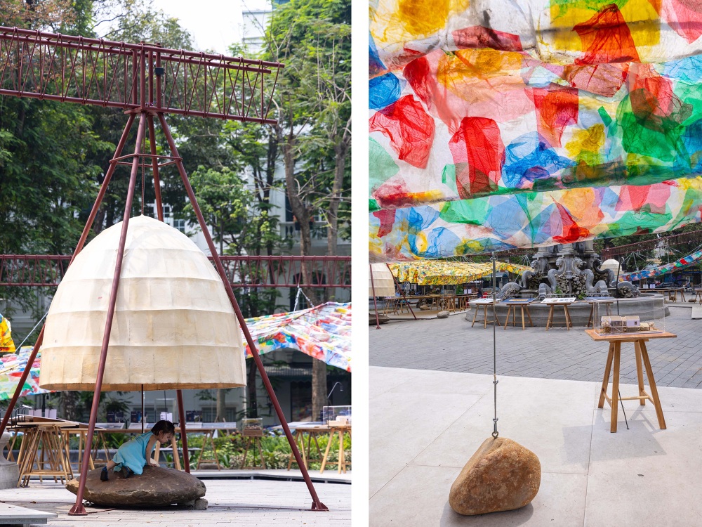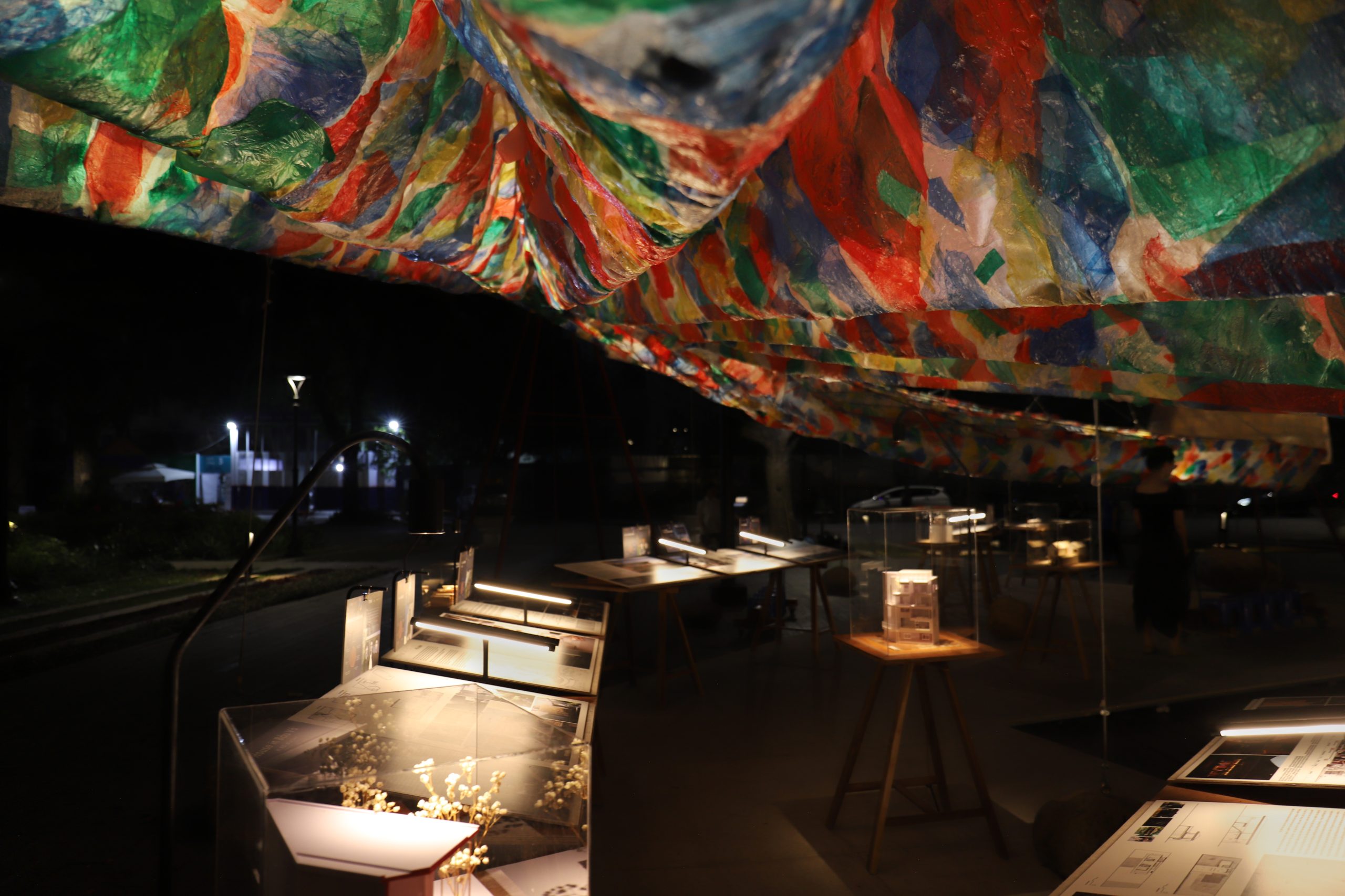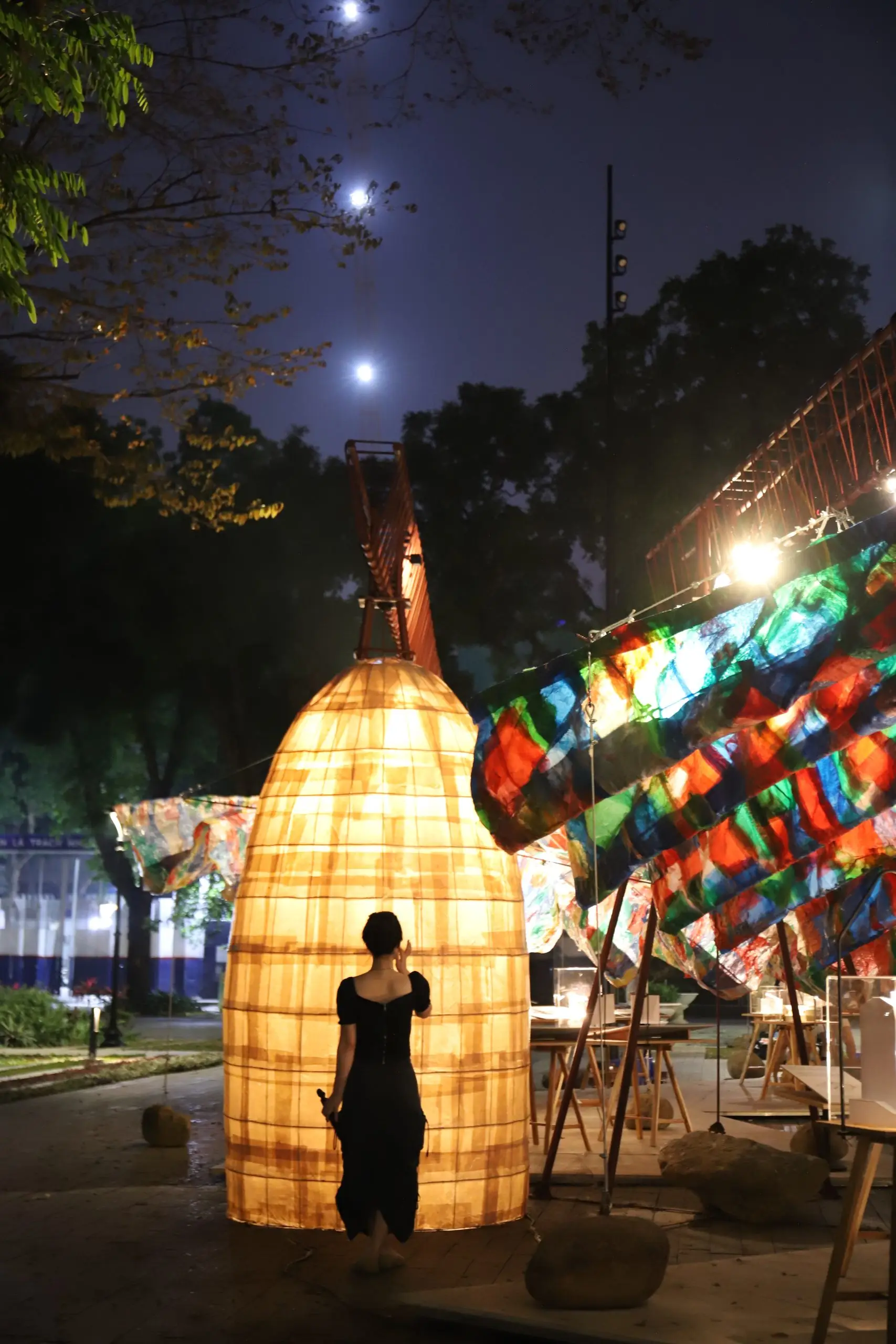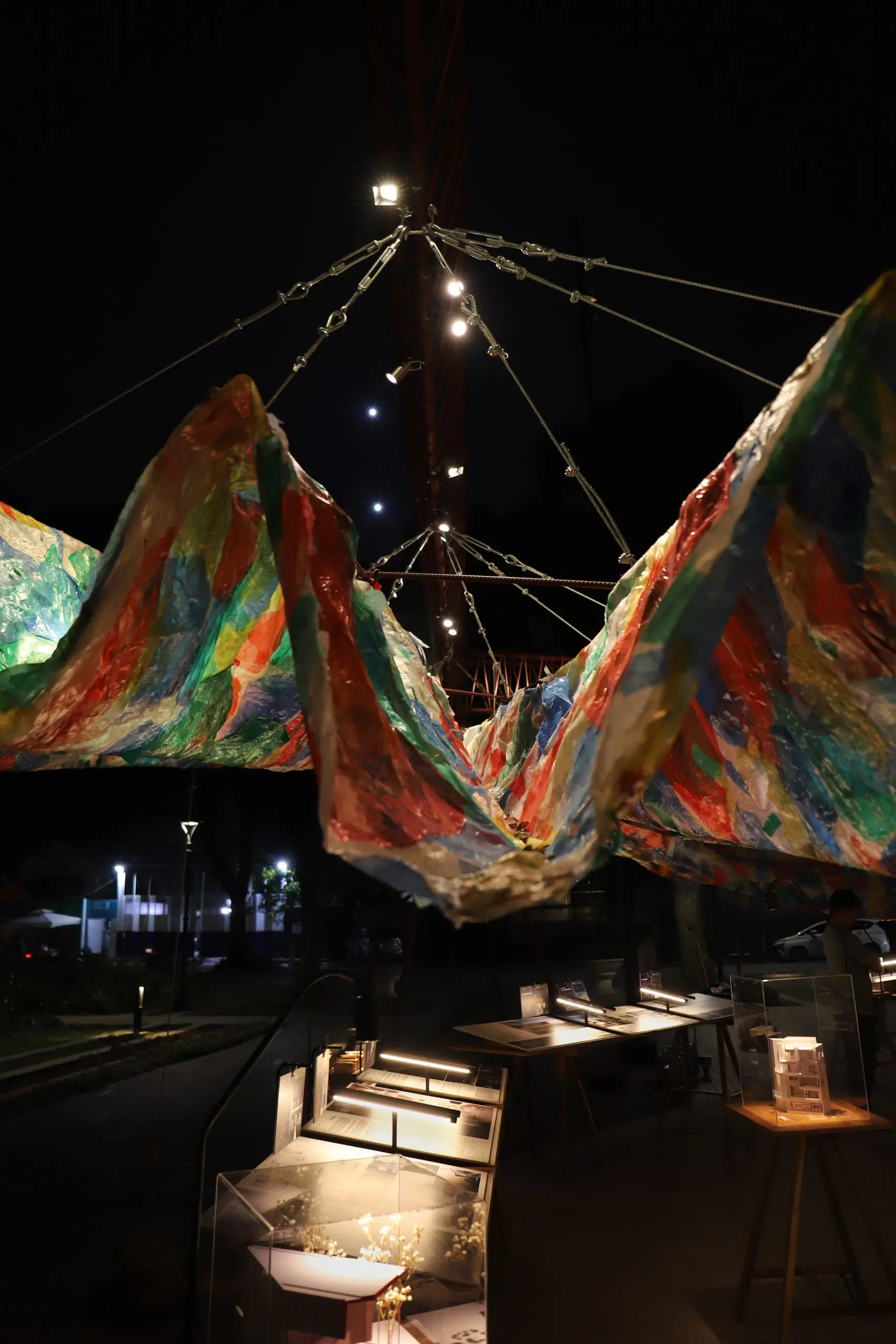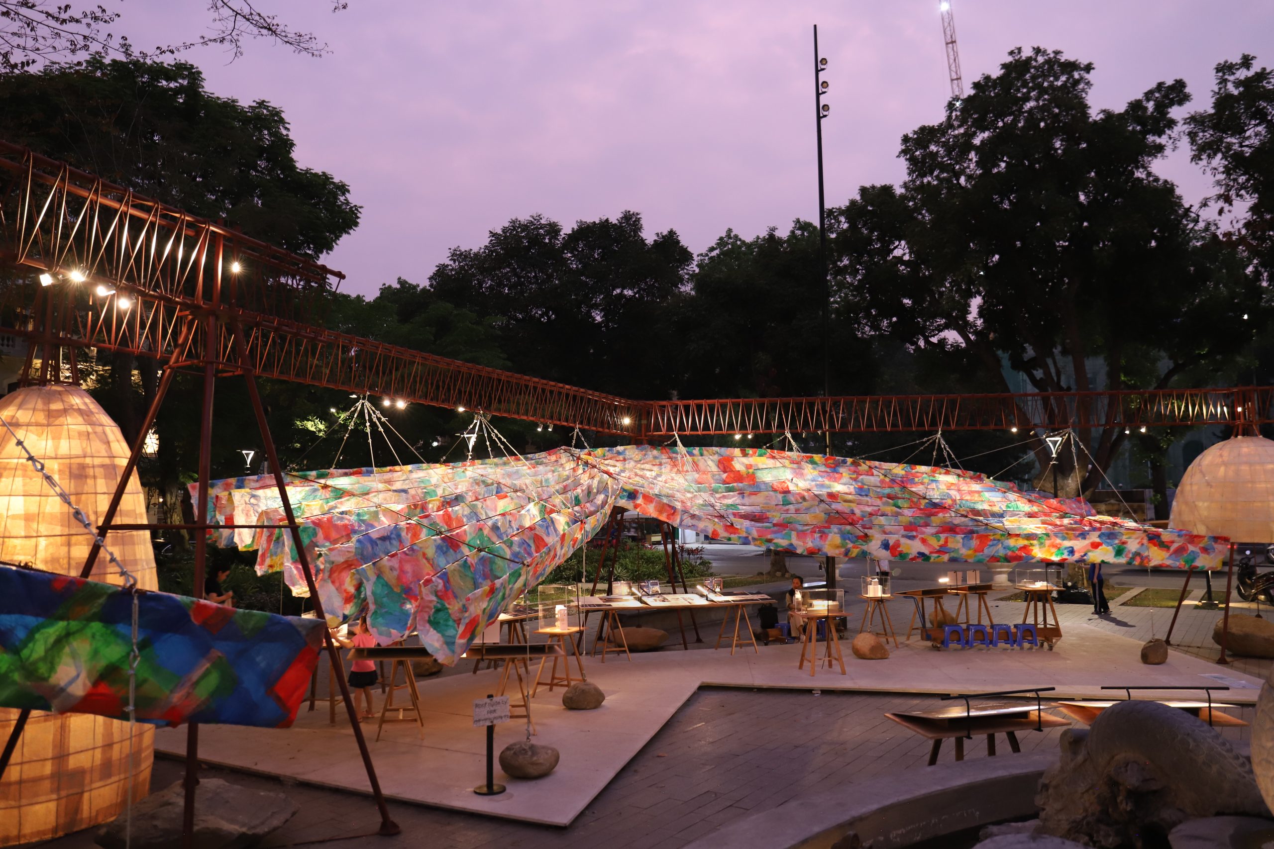 Inspired by Hanoi’s vernacular architecture and craft heritage, the structure features three wing-like roofs representing the three exhibition categories: House, Interior, and Sustainability. Semi-transparent surfaces cast colorful shadows by day and glow at night, creating a dynamic public space.