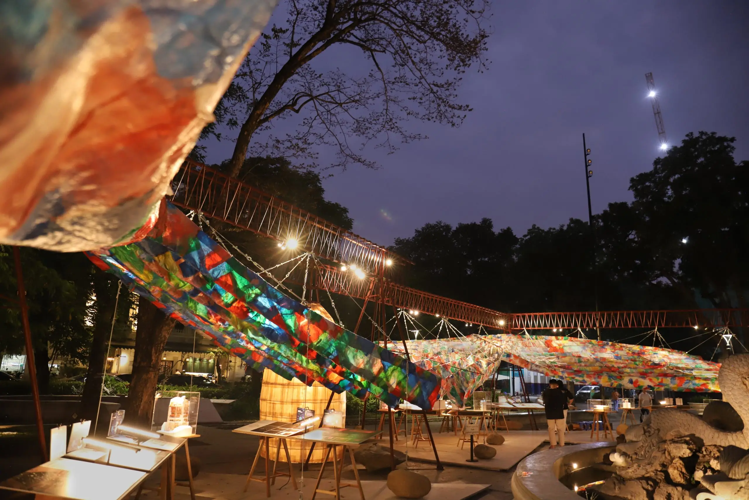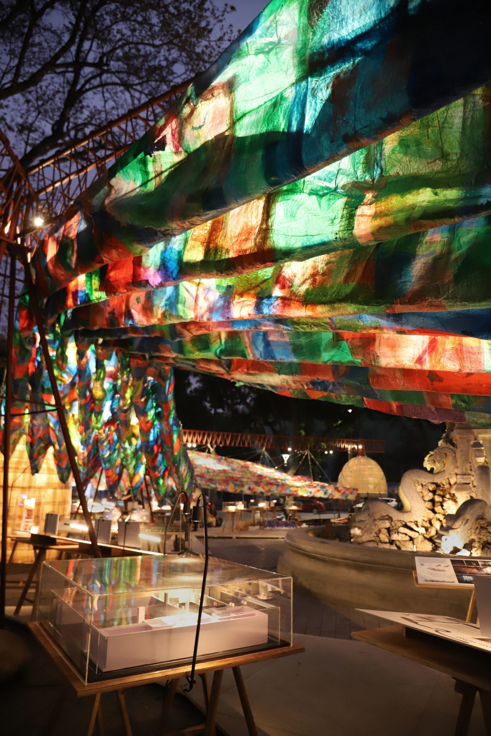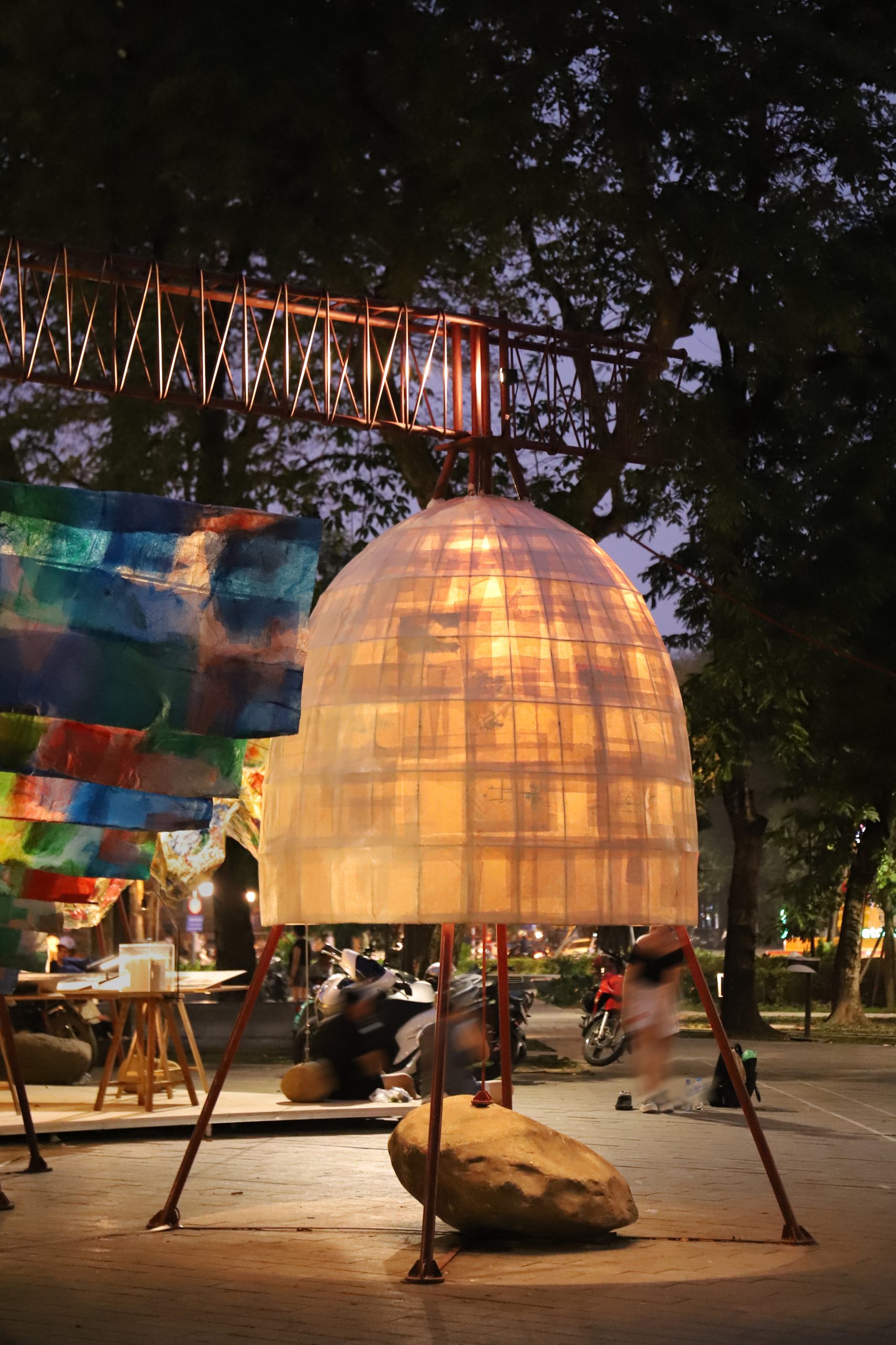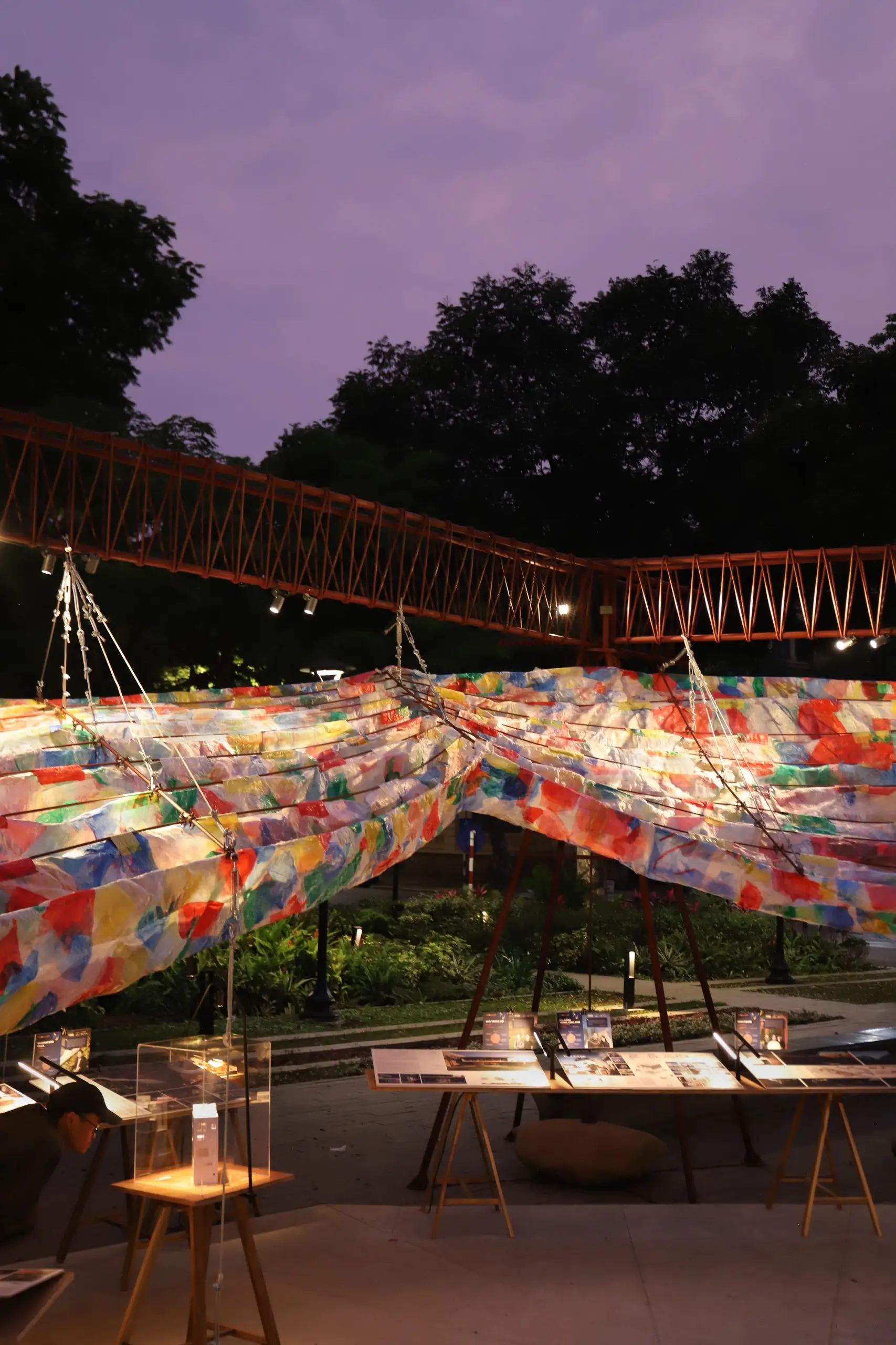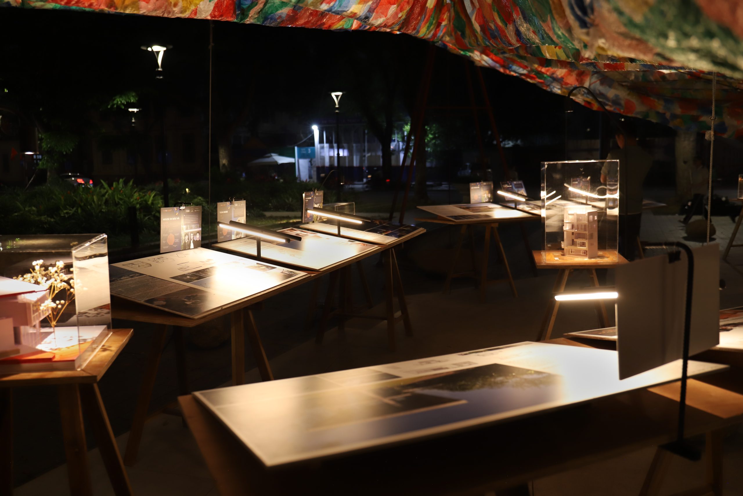 Inspired by Hanoi’s vernacular architecture and craft heritage, the structure features three wing-like roofs representing the three exhibition categories: House, Interior, and Sustainability. Semi-transparent surfaces cast colorful shadows by day and glow at night, creating a dynamic public space.