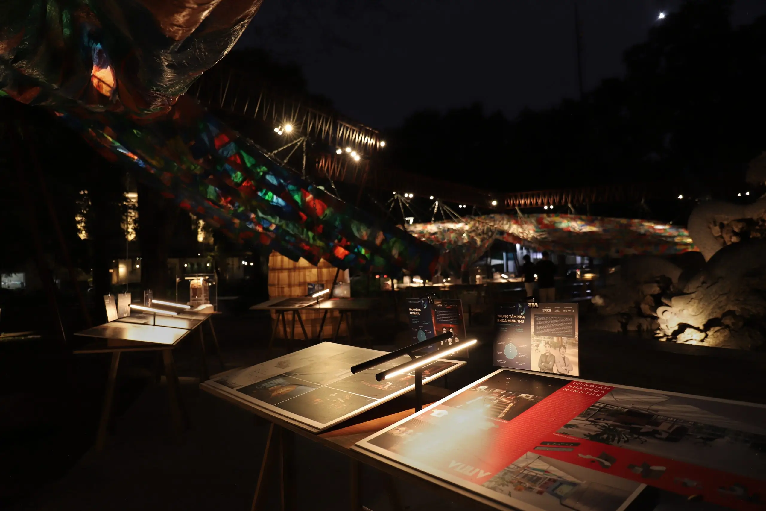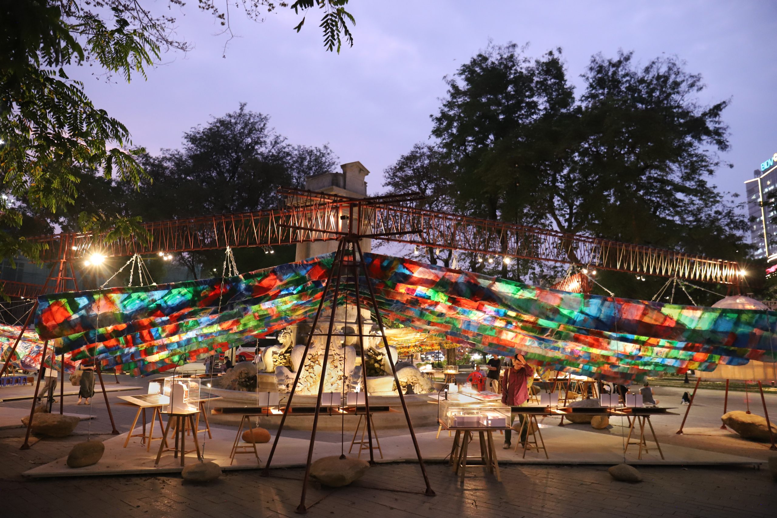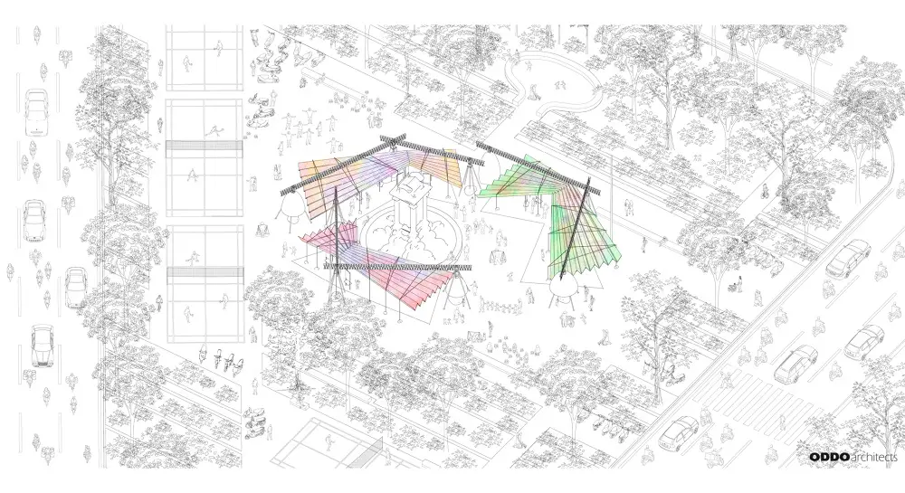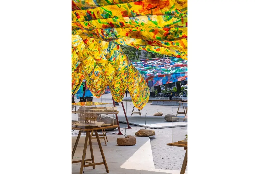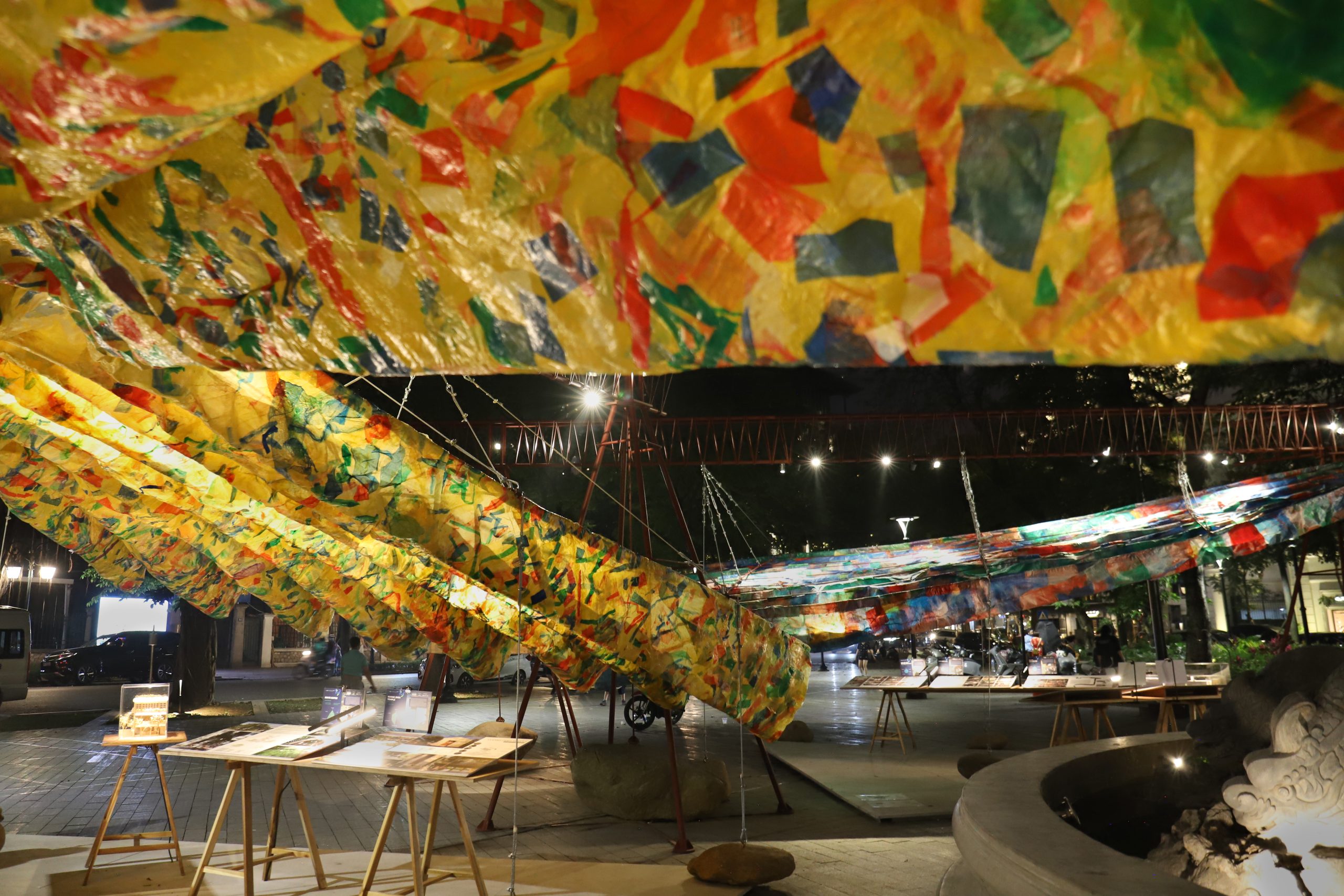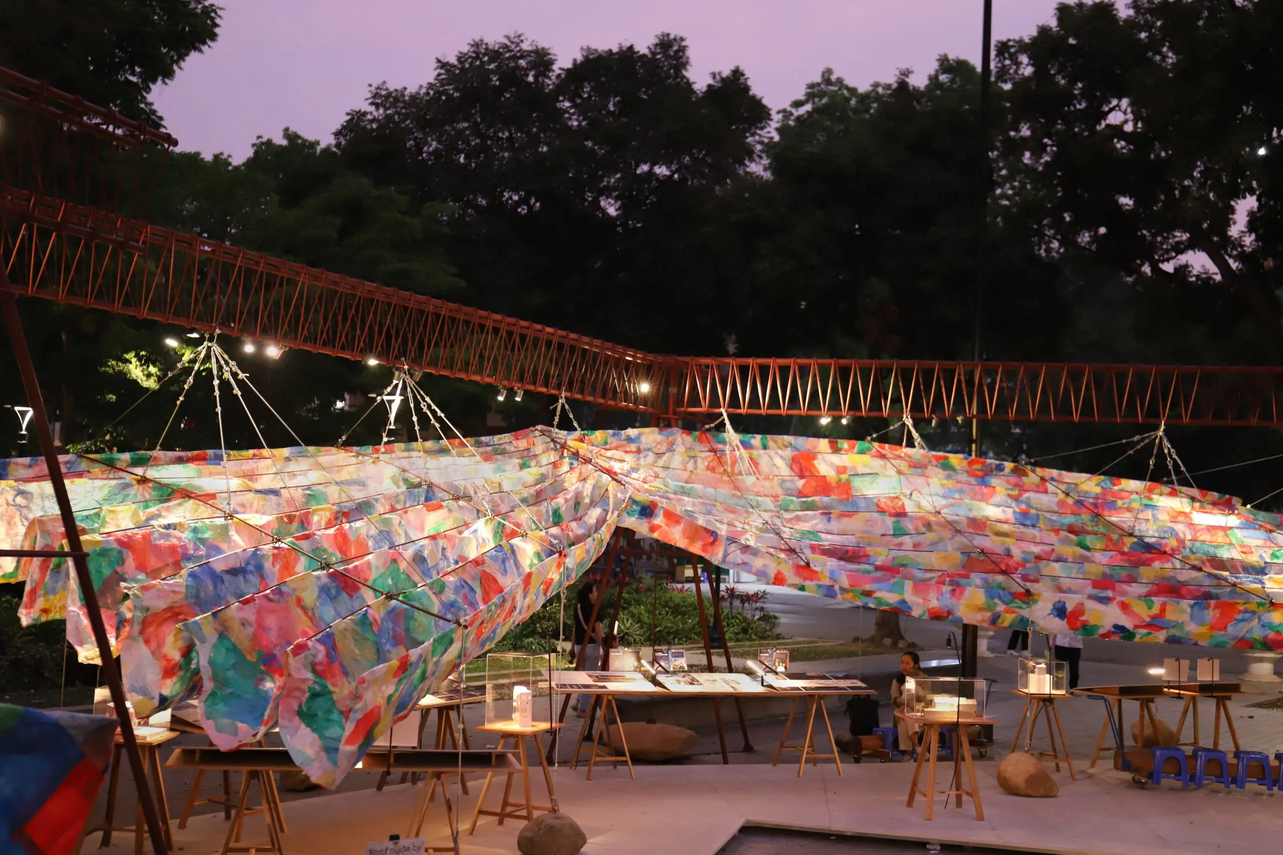 Inspired by Hanoi’s vernacular architecture and craft heritage, the structure features three wing-like roofs representing the three exhibition categories: House, Interior, and Sustainability. Semi-transparent surfaces cast colorful shadows by day and glow at night, creating a dynamic public space.