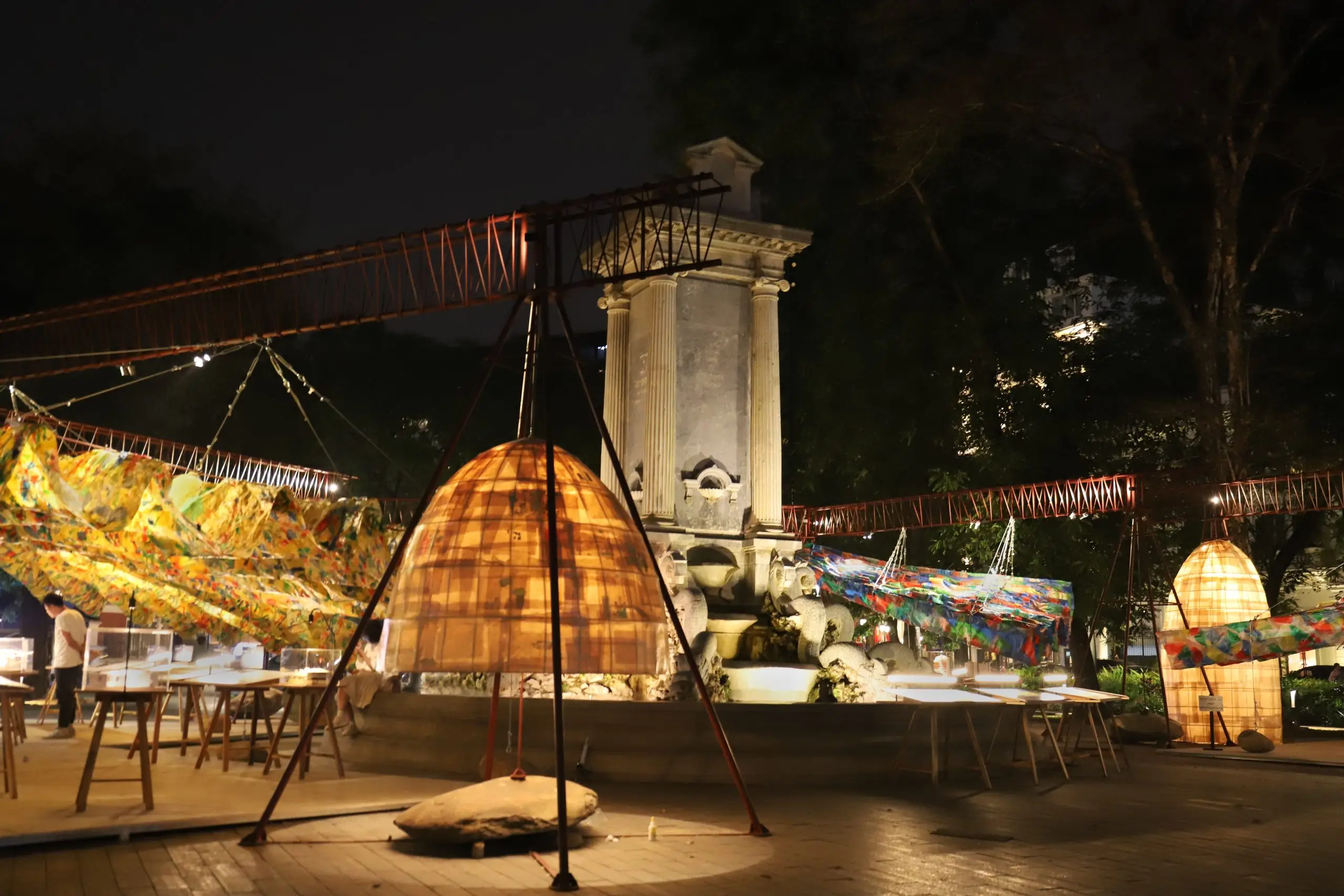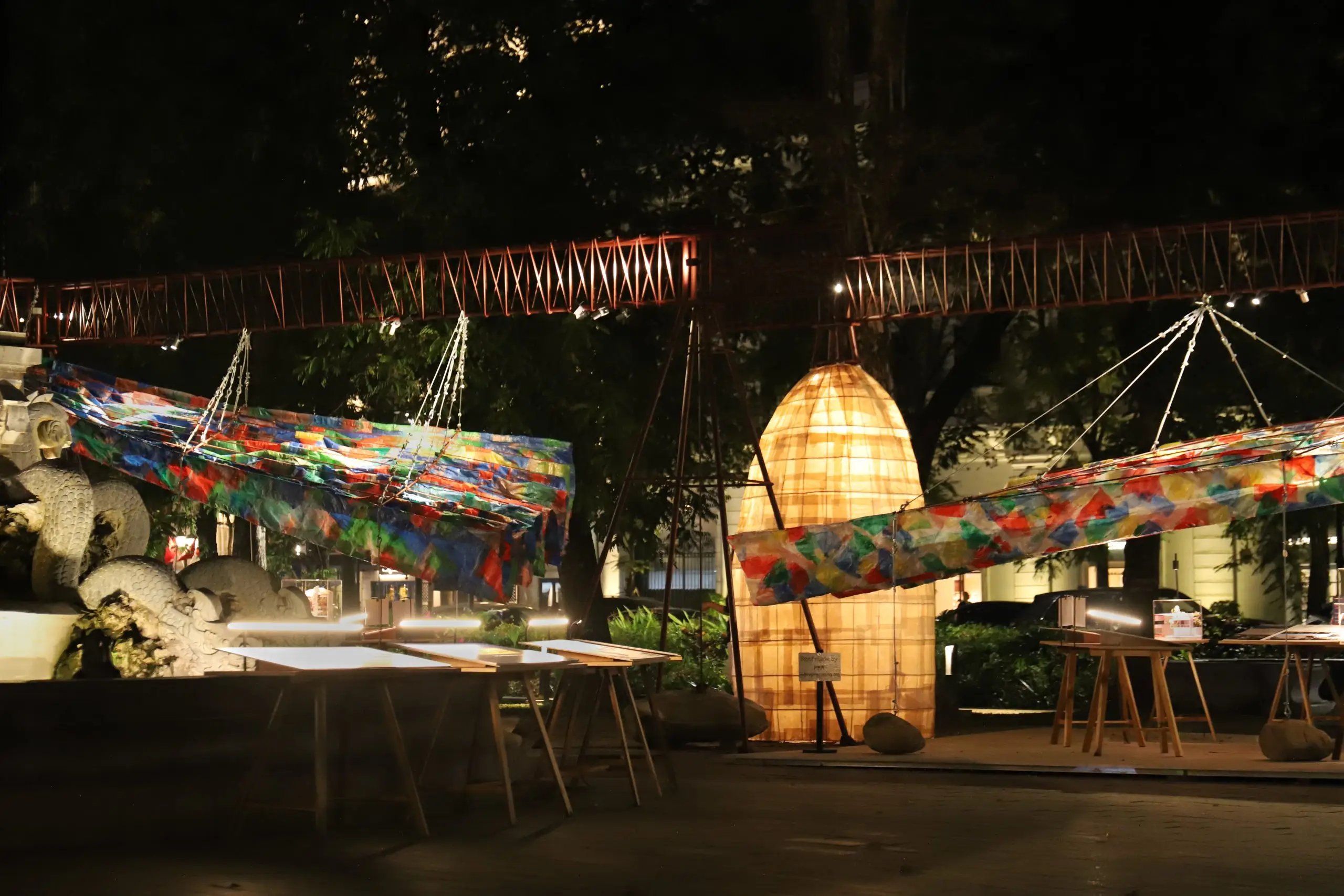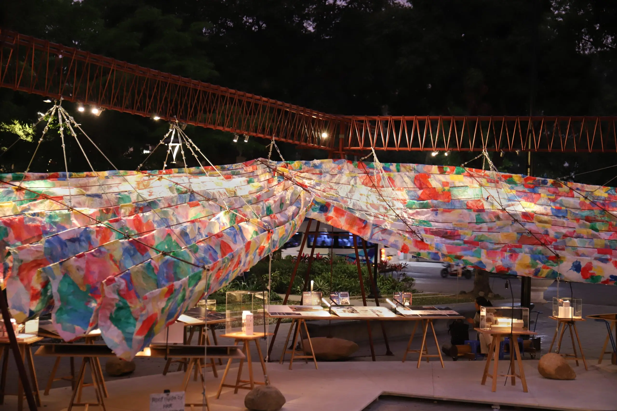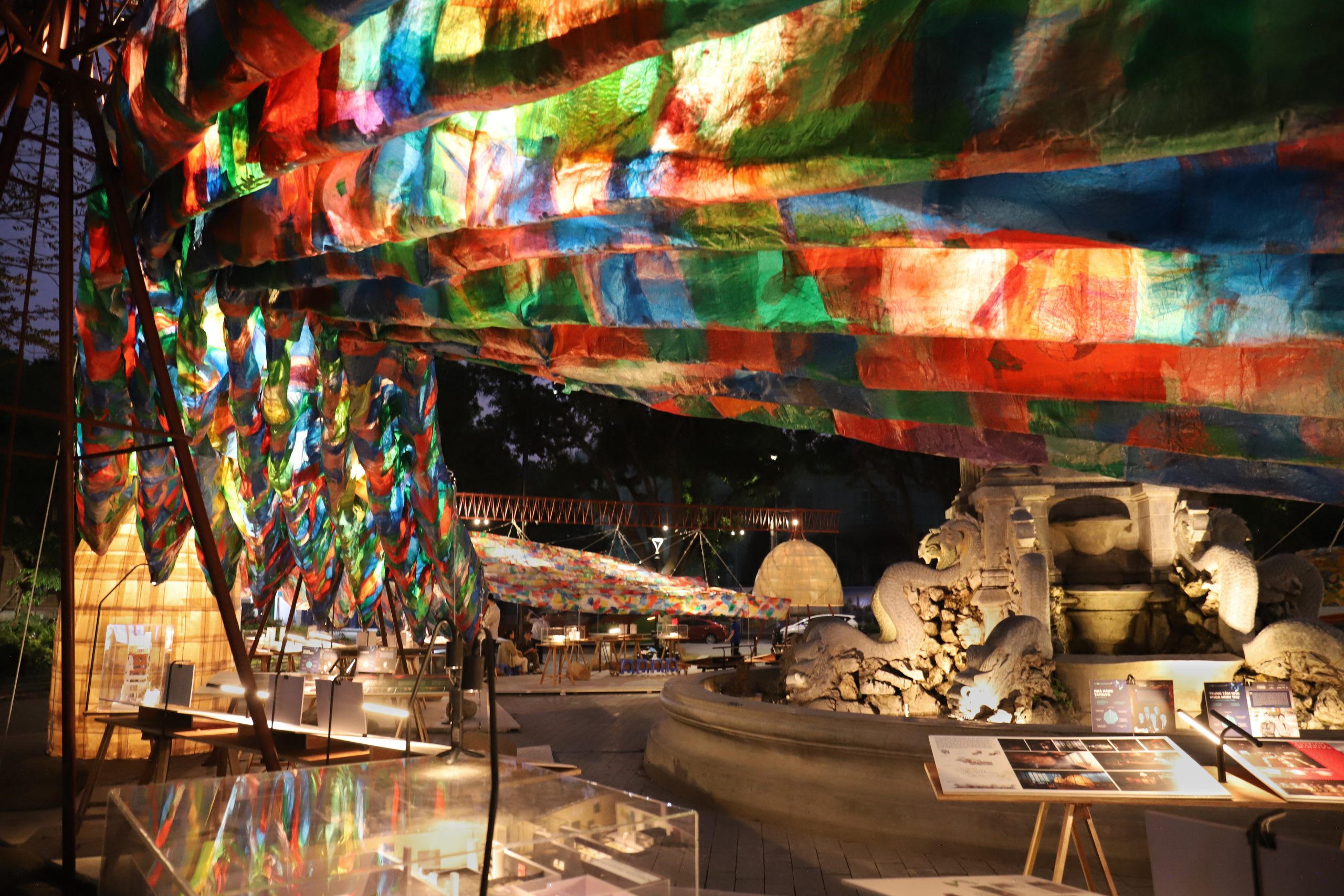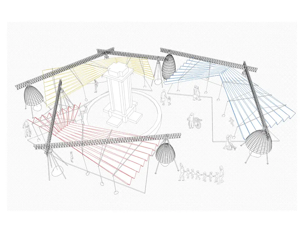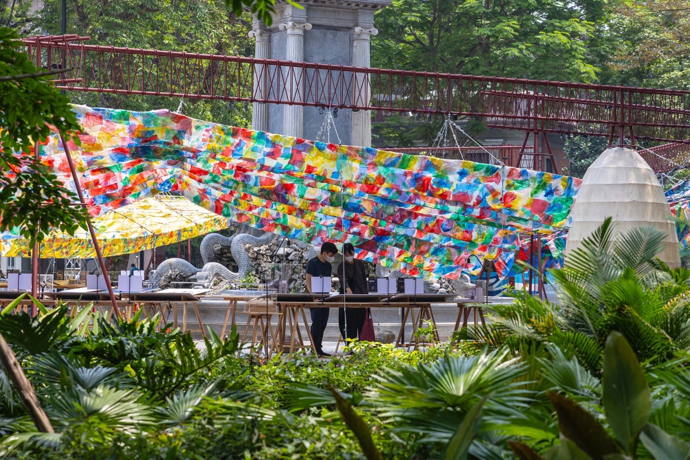 Inspired by Hanoi’s vernacular architecture and craft heritage, the structure features three wing-like roofs representing the three exhibition categories: House, Interior, and Sustainability. Semi-transparent surfaces cast colorful shadows by day and glow at night, creating a dynamic public space.