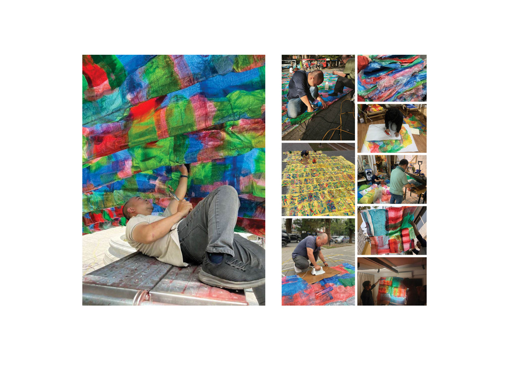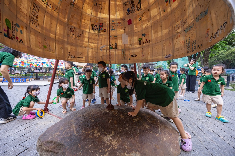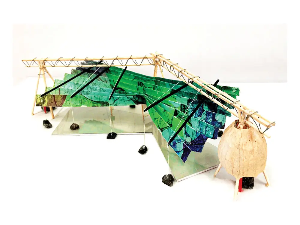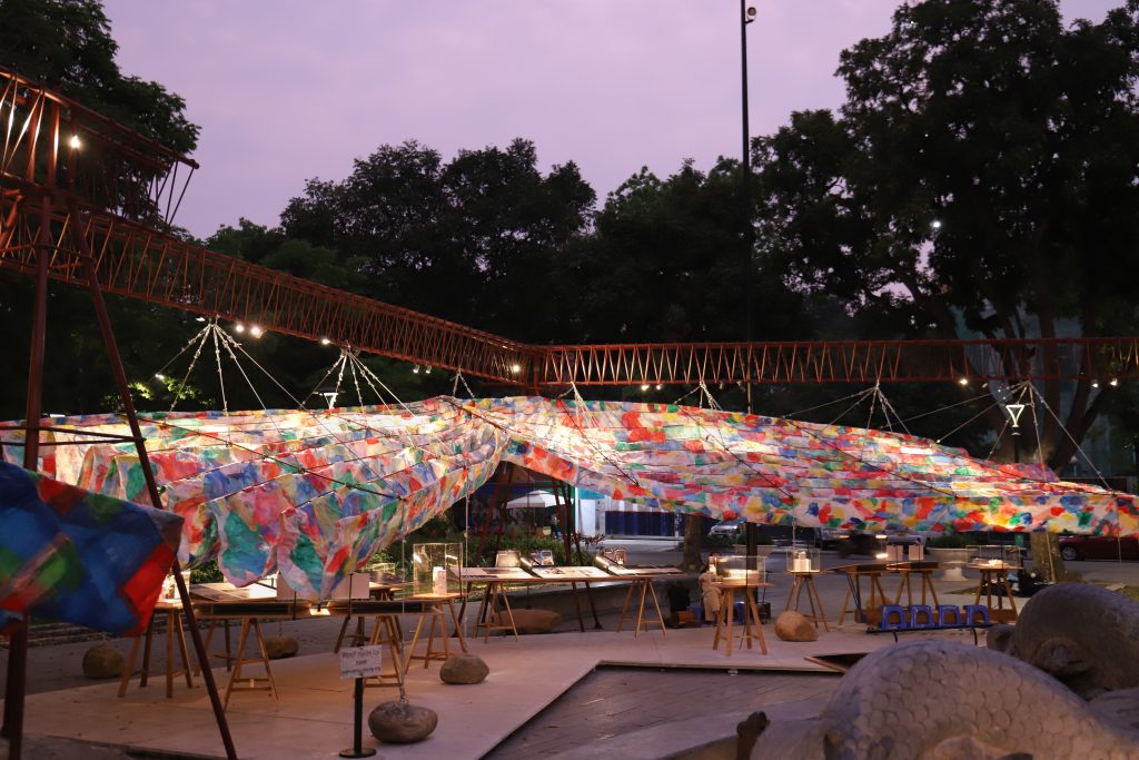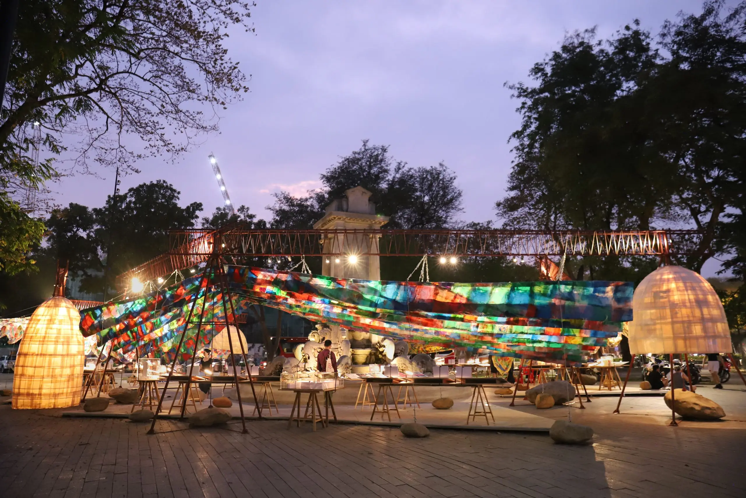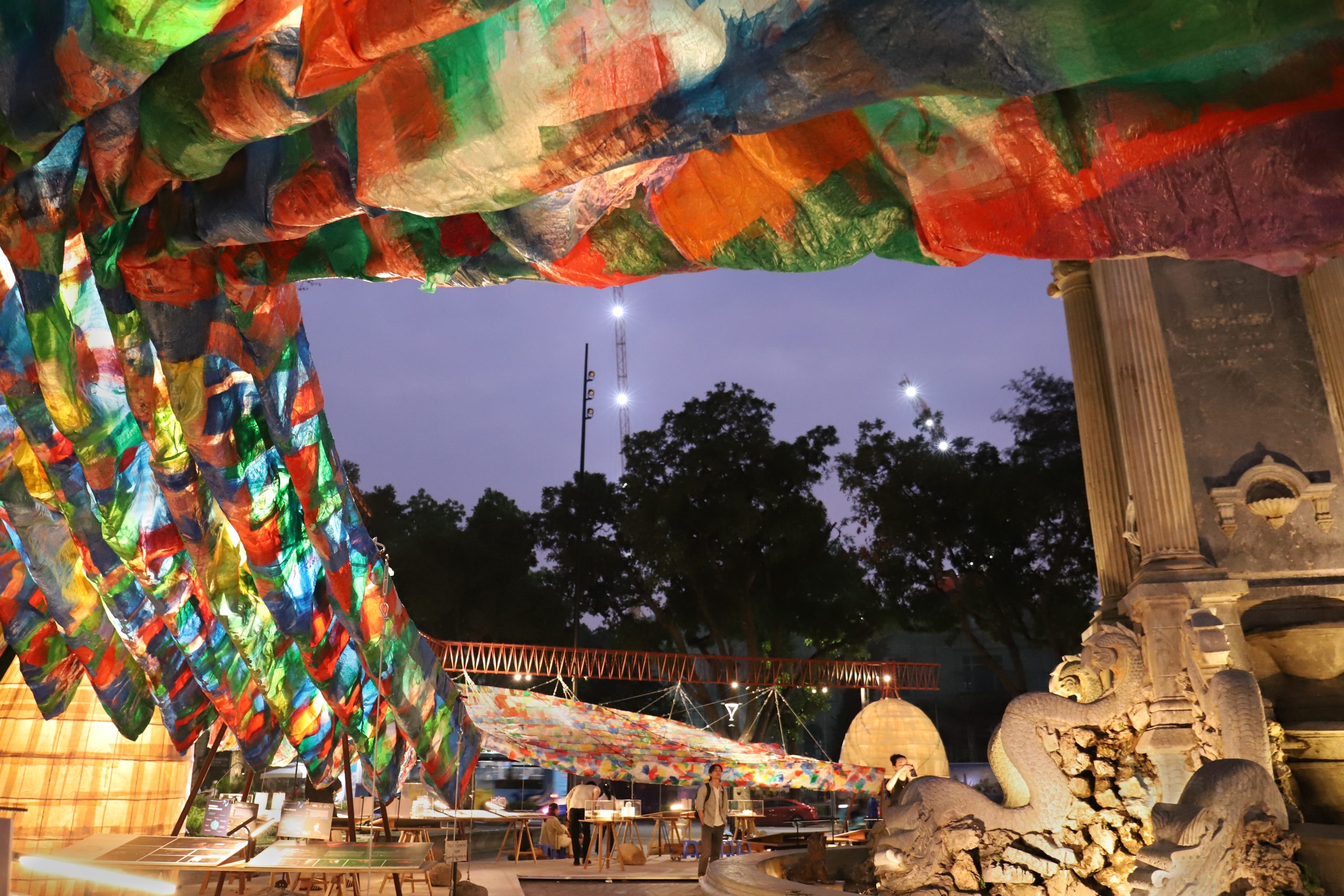 Inspired by Hanoi’s vernacular architecture and craft heritage, the structure features three wing-like roofs representing the three exhibition categories: House, Interior, and Sustainability. Semi-transparent surfaces cast colorful shadows by day and glow at night, creating a dynamic public space.