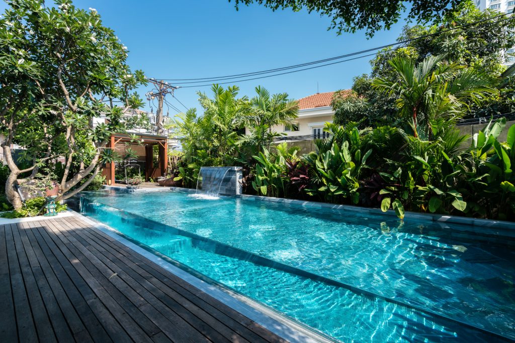 Phòng chiếu phim được trang bị thiết bị công nghệ cao, với vật liệu cách âm và hấp thụ âm kết hợp với tường nhung tạo nên trải nghiệm điện ảnh. Bên cạnh đó, việc sử dụng hiệu ứng của các yếu tố nước như bể bơi và ao cá Koi, được ngăn cách bởi cây xanh cũng là một ý tưởng nhằm hài hòa và thích ứng với những khác biệt giữa vợ chồng.