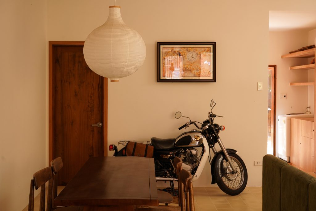Ngôi nhà của cha mẹ: Truyền thống và nghi lễ – Nằm ngay mặt tiền đường, ngôi nhà của cha mẹ chào đón du khách bằng một khu vườn phía trước ngập tràn ánh nắng – một điểm dừng chân nhẹ nhàng trước khi bước vào. Mặt tiền bằng gạch có kết cấu, với các cửa sổ liên kết góc cạnh và xoay, cân bằng giữa sự riêng tư và sự thoáng đãng, trong khi bóng râm của tre và mái tôn màu đất sét có tuổi thọ duyên dáng theo thời gian. Bên trong, tầng một thông từ phòng khách đến phòng ăn và nhà bếp, mở thẳng ra khu vườn để sinh hoạt trong nhà và ngoài trời dễ dàng. Một cầu thang điêu khắc dẫn lên phòng cầu nguyện ở tầng hai, một hội trường nghi lễ yên bình cũng có chức năng là không gian tụ họp cộng đồng. Một góc đọc sách nhìn ra sân trong, đón gió và ánh sáng ban ngày. Khắp nơi, gạch, tre và gỗ tạo thành một phông nền ấm áp, xúc giác và vượt thời gian, với gạch ốp tường bằng đất nung trong nhà bếp và phòng tắm kết hợp với gạch lát sàn màu be để tăng thêm cảm giác thoải mái.