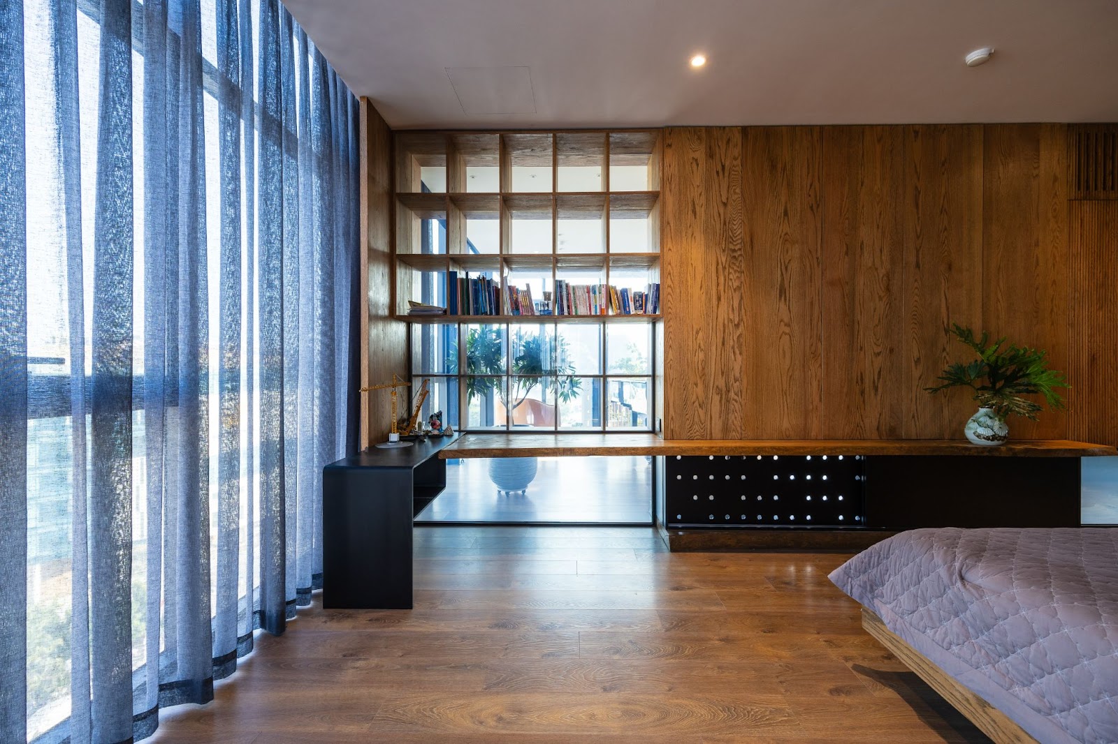 Không gian phòng ngủ mở nối liền với không gian phòng tắm tạo cảm giác rộng rãi, khoáng đạt nhưng không kém phần độc đáo, sang trọng