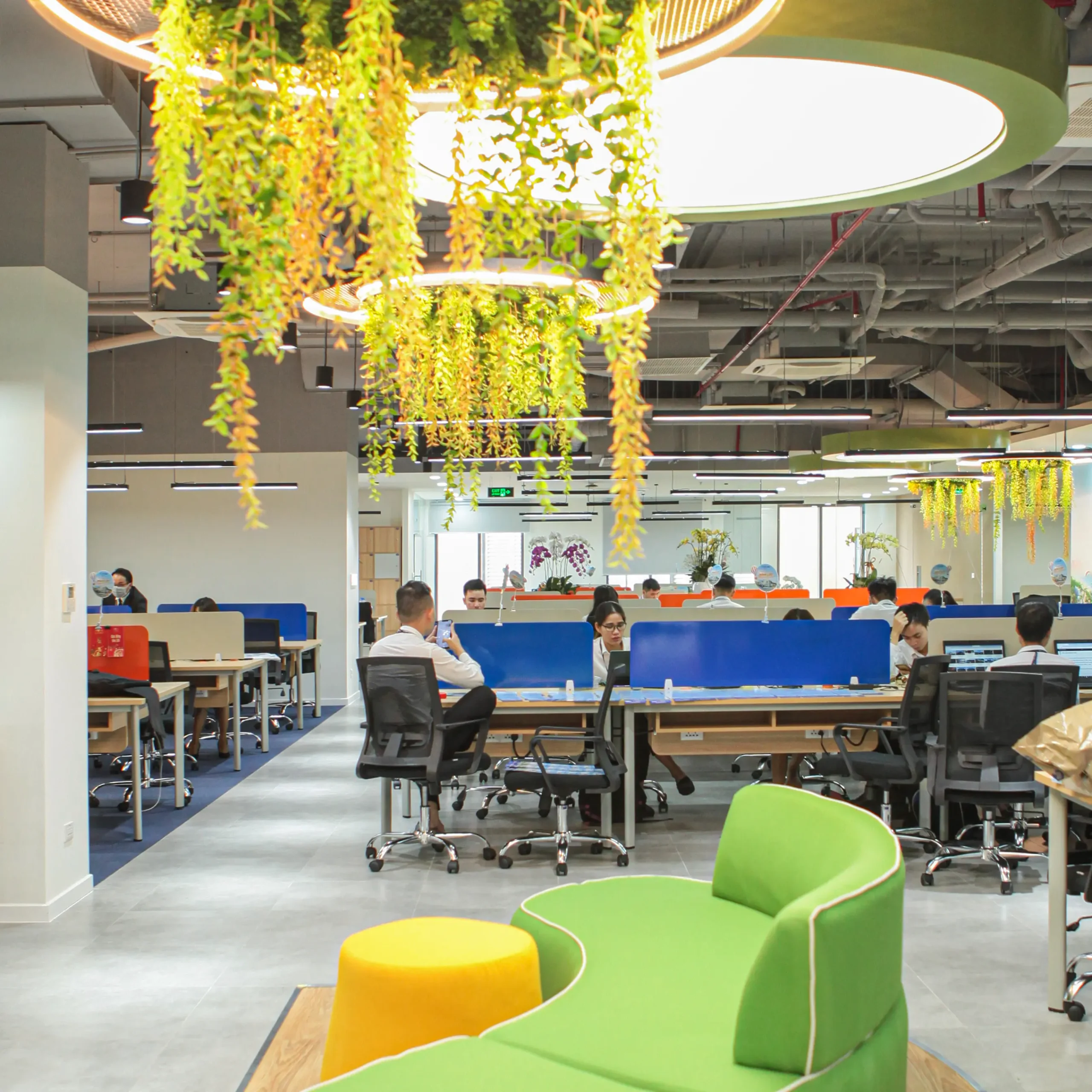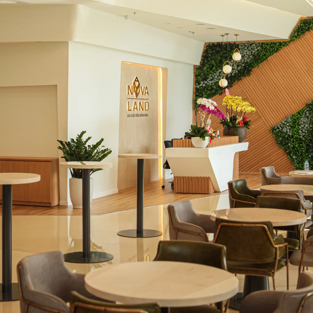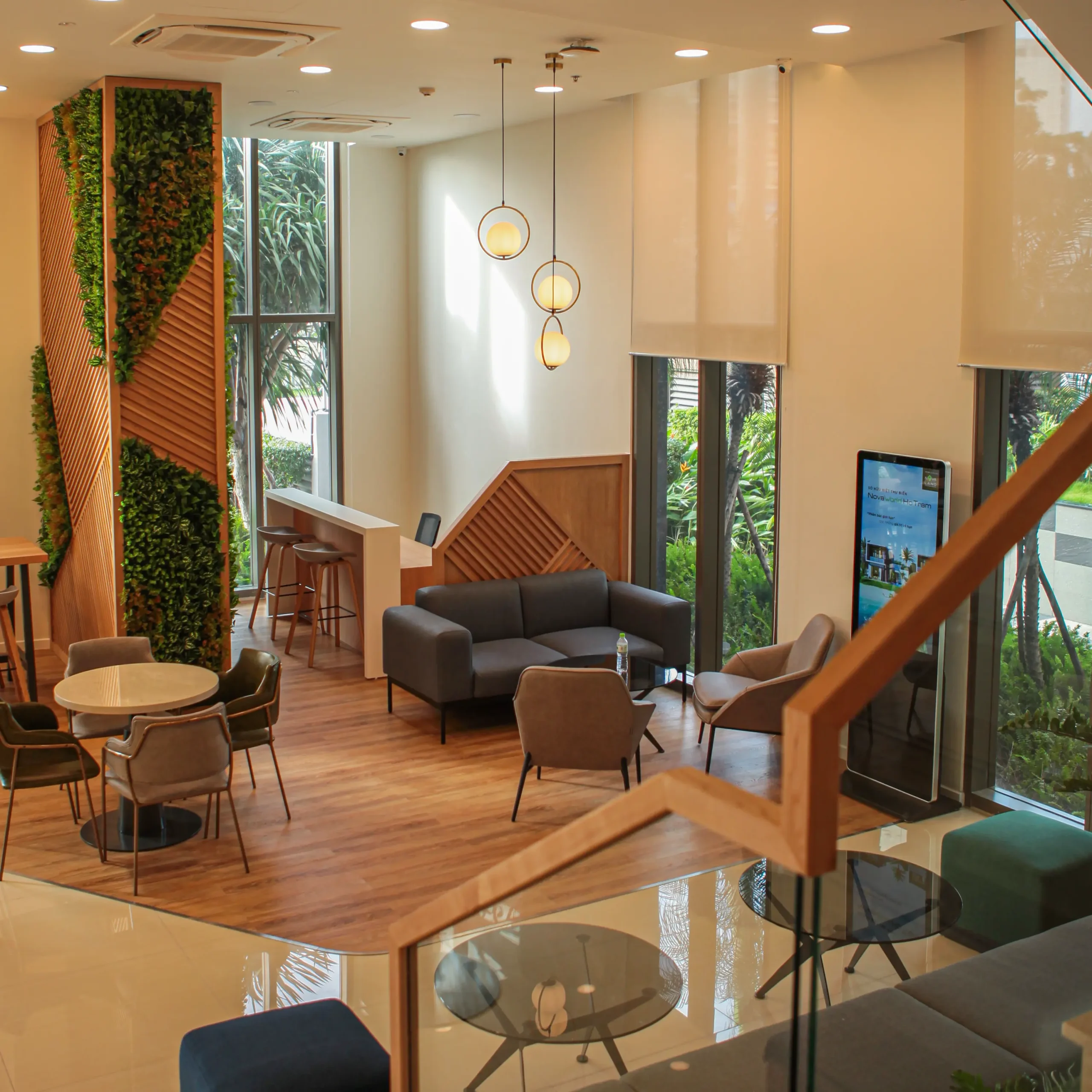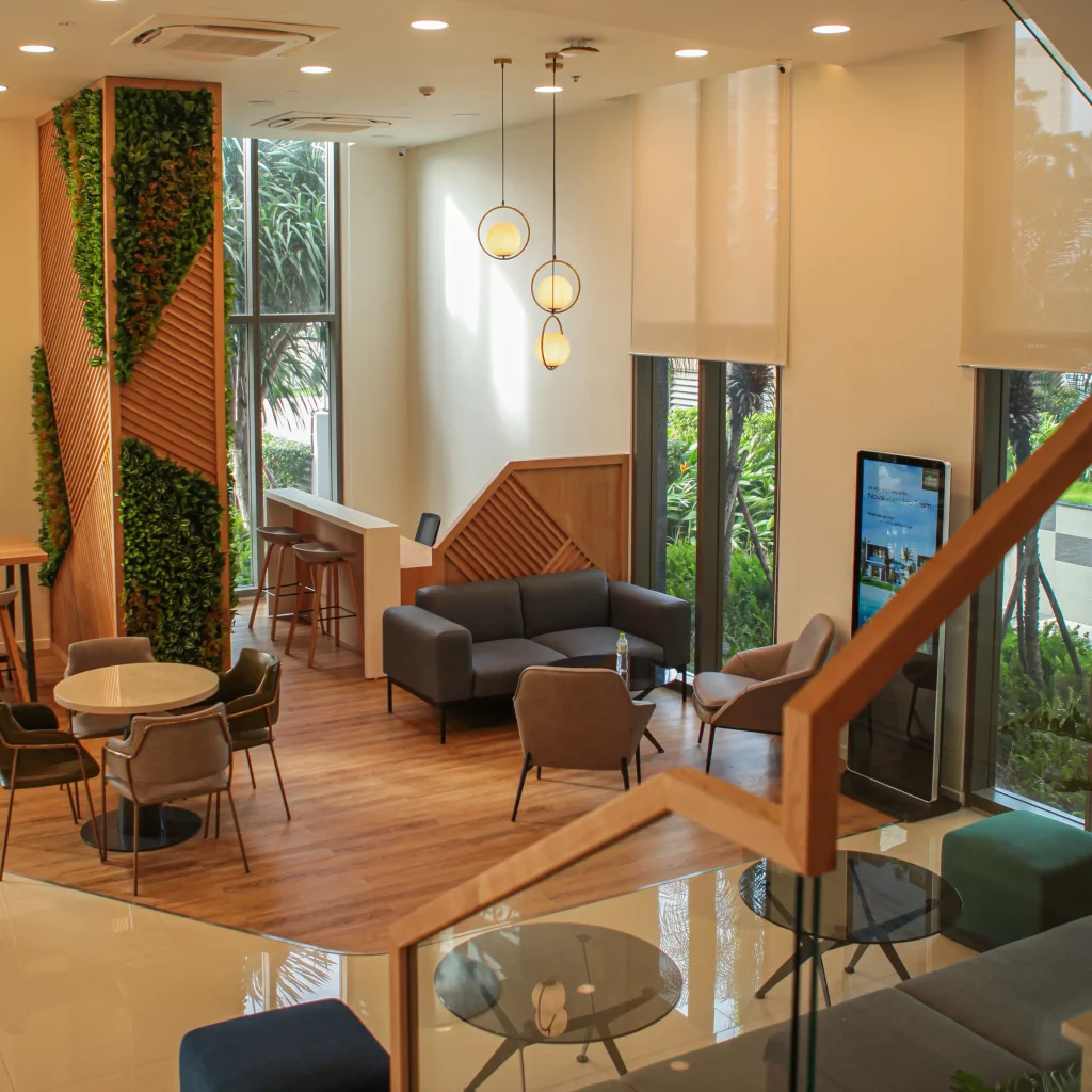 Đây là một toà nhà 2 tầng. Tầng 1 là không gian gặp gỡ khách hàng của giao dịch viên. Hình ảnh chỉn chu, ấm cũng và thân mật, giúp những thương vụ trở nên suôn sẽ hơn bao giờ hết. Tầng 2 là văn phòng, nơi nhân viên dành hầu hết thời gian trong ngày. Cây xanh là một giải pháp cải thiện tinh thần hiệu quả. Không gian thoáng mở với điểm nhìn sinh động từ thiên nhiên, để 8 tiếng văn phòng không còn áp lực.
