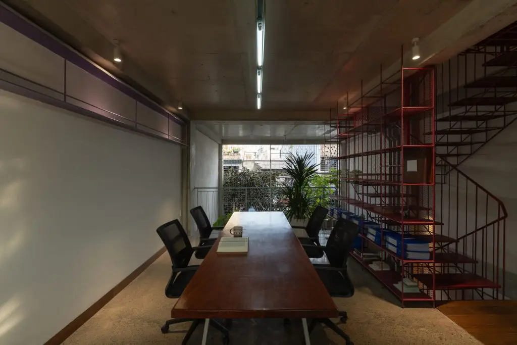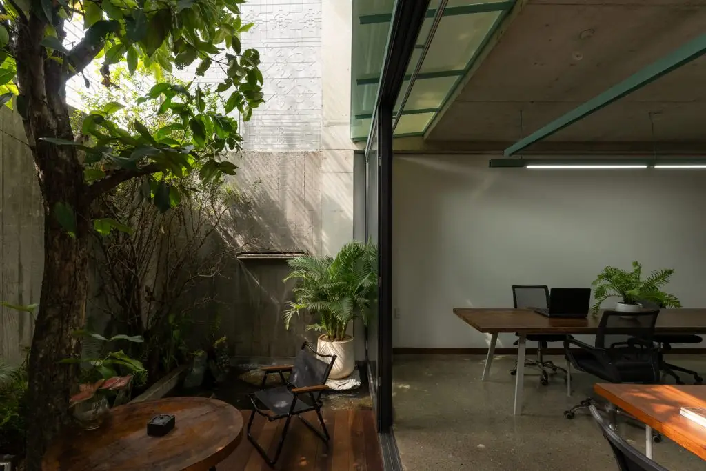 • Tầng trệt + Tầng lửng: Không gian văn phòng có khoảng trống cao gấp đôi để kết nối trực quan và thông gió tự nhiên.