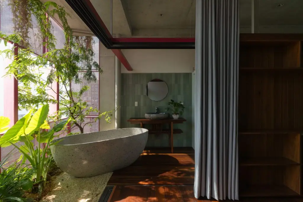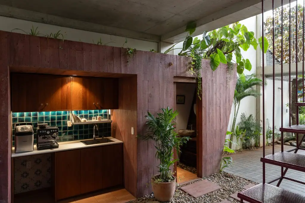 Ngôi nhà được xây dựng với khung bê tông lộ ra ngoài, tường sơn không trát và sàn bê tông đánh bóng. Gỗ tự nhiên được sử dụng cho nội thất, được giữ ở trạng thái “sống” – với những khoảng trống và cong vênh tự nhiên thay đổi theo khí hậu.