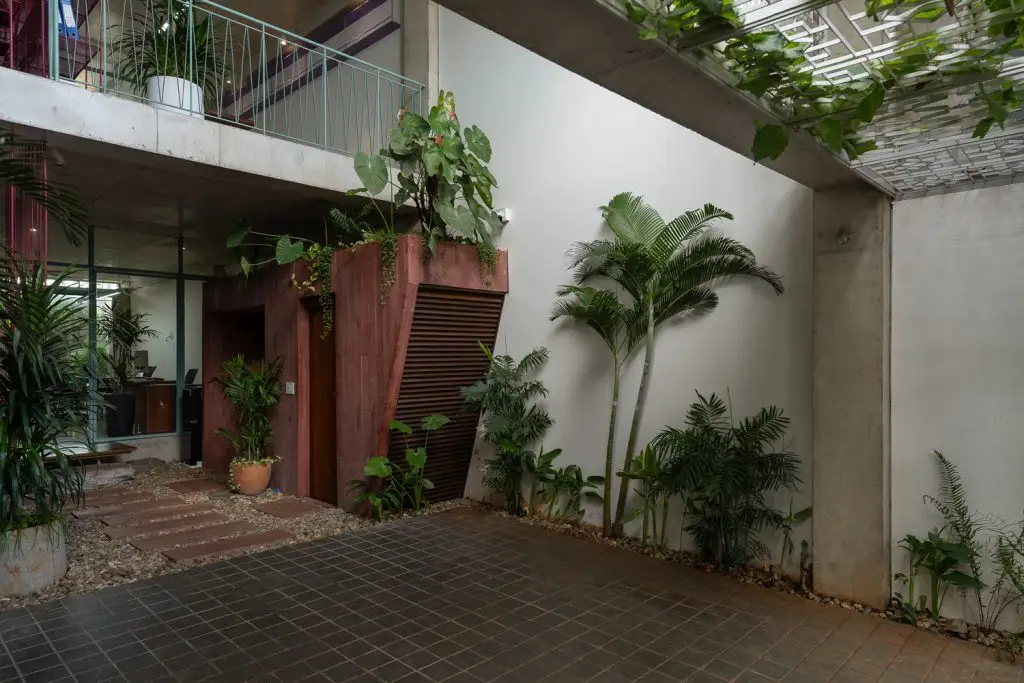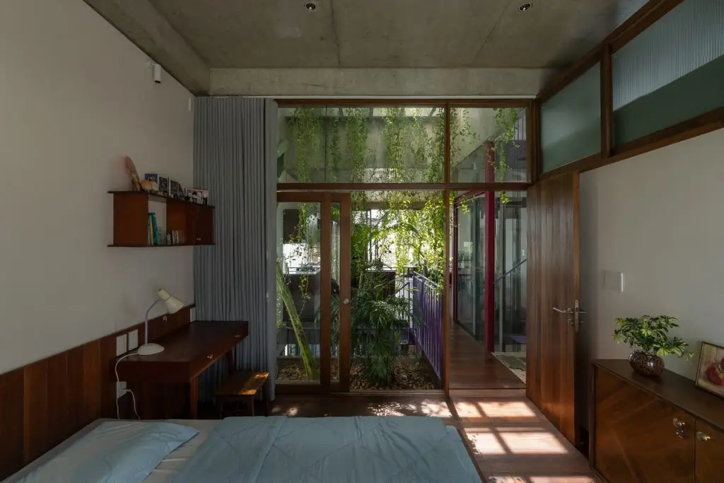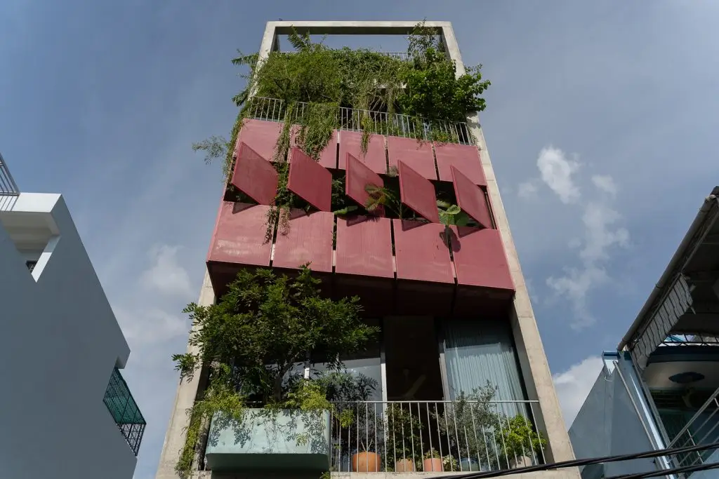 Mặt tiền hai lớp giúp điều hòa và giảm nhiệt từ ánh nắng mặt trời hướng Tây. Lớp bên ngoài bao gồm các khung sắt có hoa văn năng động, trong khi lớp bên trong có tác dụng bảo vệ và cách nhiệt. Cây xanh đan xen khắp các khoảng trống, làm mát bầu không khí, tăng thêm sự riêng tư, đưa ngôi nhà gần gũi hơn với thiên nhiên.