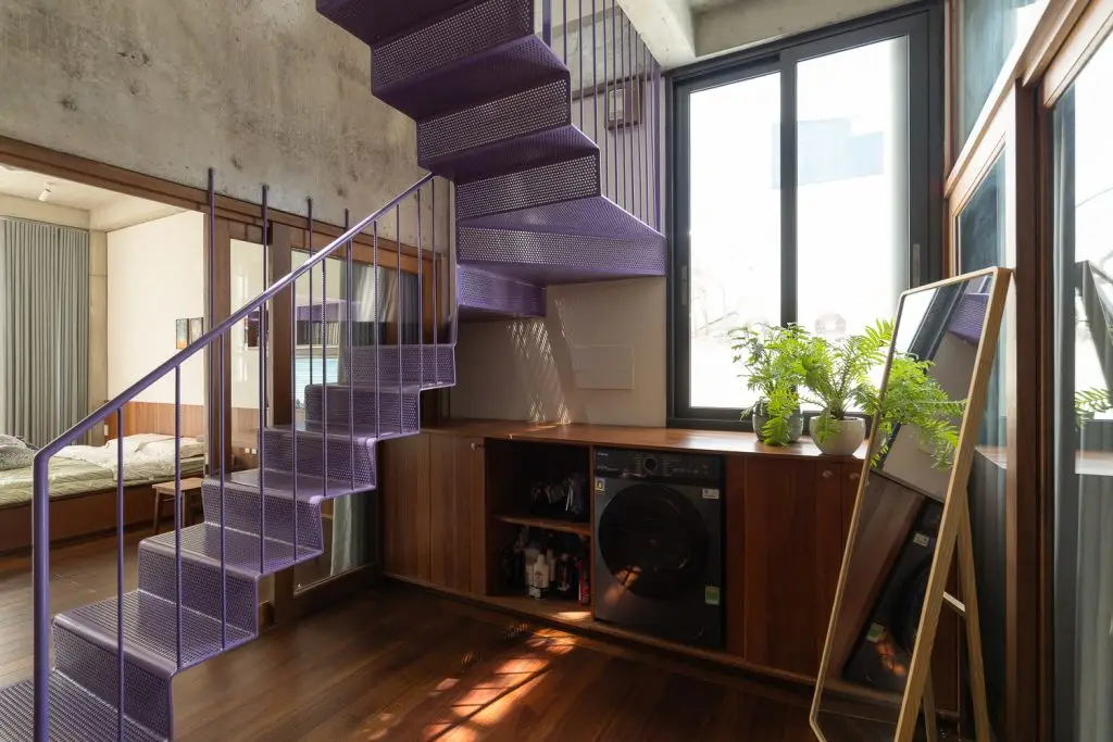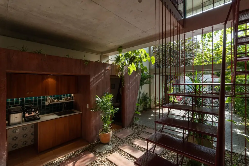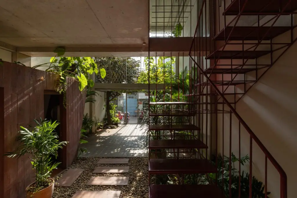 Cầu thang không chỉ đóng vai trò là trục lưu thông chính mà còn là trục thông gió của ngôi nhà. Các bậc thang rỗng tăng cường lưu thông không khí theo chiều dọc, cho phép tòa nhà được “thở” tự nhiên.