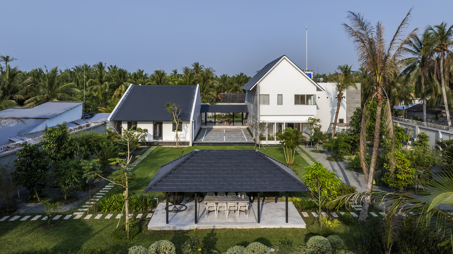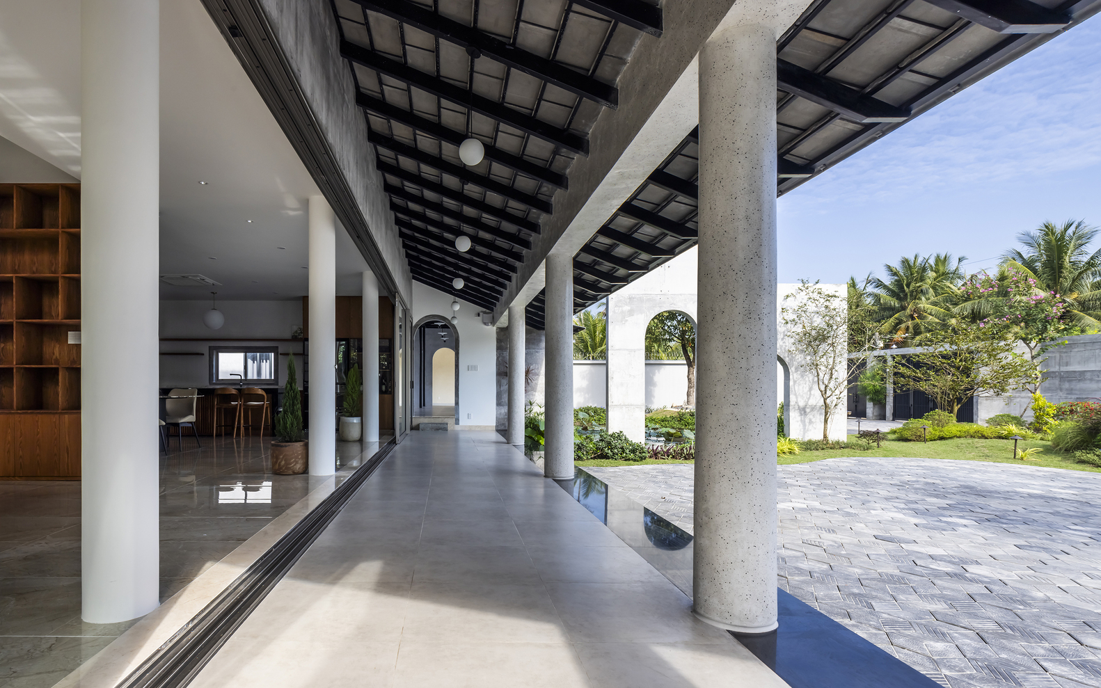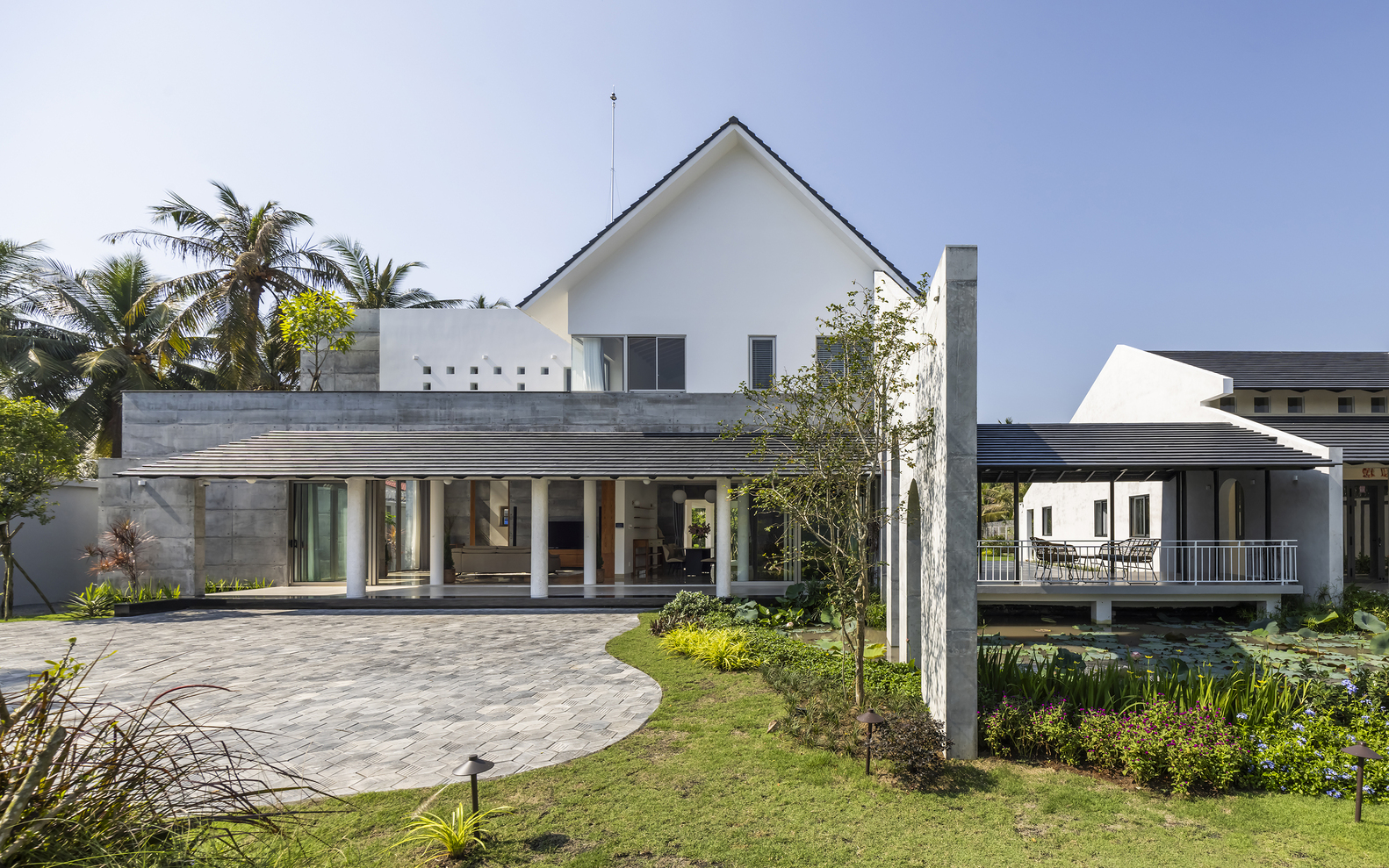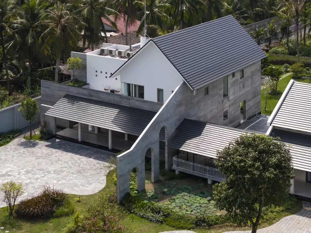 Nhưng điều đặc biệt ở đây chính là cách hai khối nhà được kết nối nhẹ nhàng với nhau qua hành lang thoáng mát, một gian nhà ven hồ và những khoảng sân chung. Những không gian trung gian này chính là trái tim của ngôi nhà, nơi ánh sáng, không khí và cảm xúc hòa quyện. Chúng không chỉ là những lối đi, mà còn là nơi gia đình sum họp, nuôi dưỡng những tương tác mạnh mẽ. Đây chính là cách chúng tôi hiện thực hóa phương châm thiết kế của mình: “Riêng tư để tôn trọng, kết nối để yêu thương”.