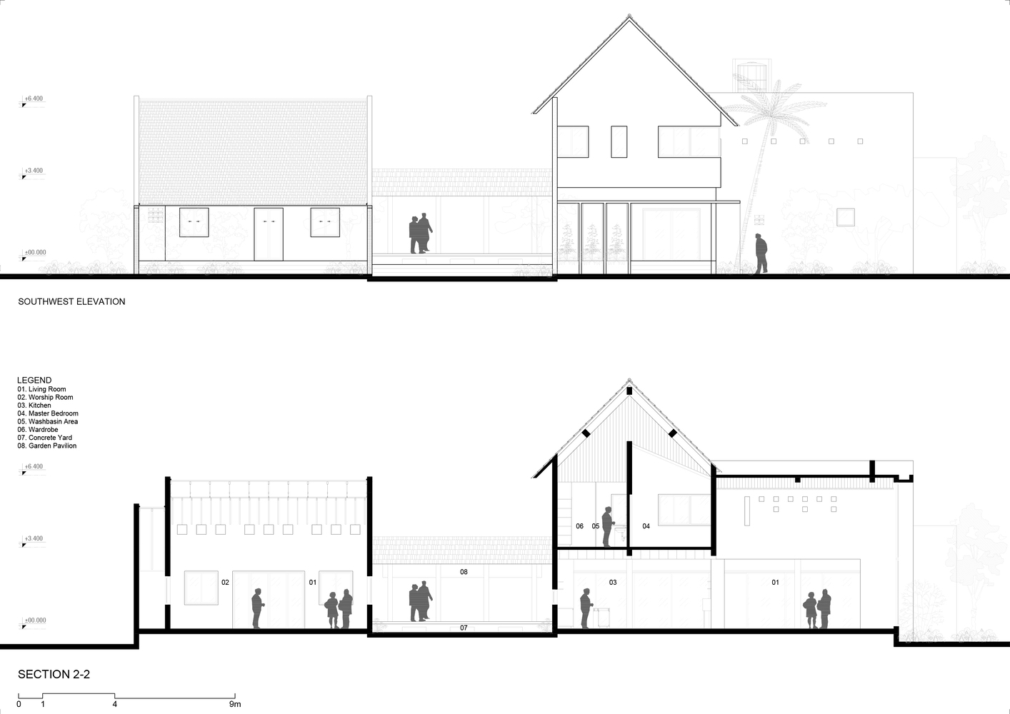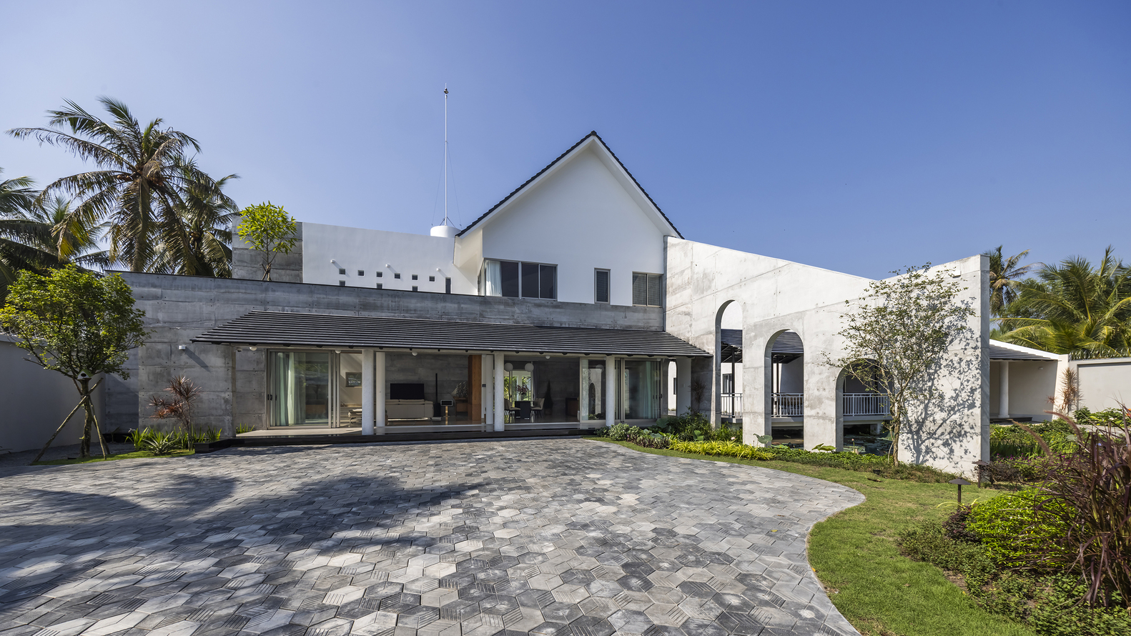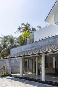 Ranh giới giữa con người và thiên nhiên dường như tan biến, khiến ngôi nhà như một phần tự nhiên của môi trường xung quanh, nơi con người và môi trường hòa làm một. Các cột tròn và vách ngăn di động được sử dụng để phá vỡ quan niệm truyền thống về mặt tiền cứng nhắc, tạo nên nhịp điệu của những khối rắn và khoảng trống gợi lên sự tò mò.